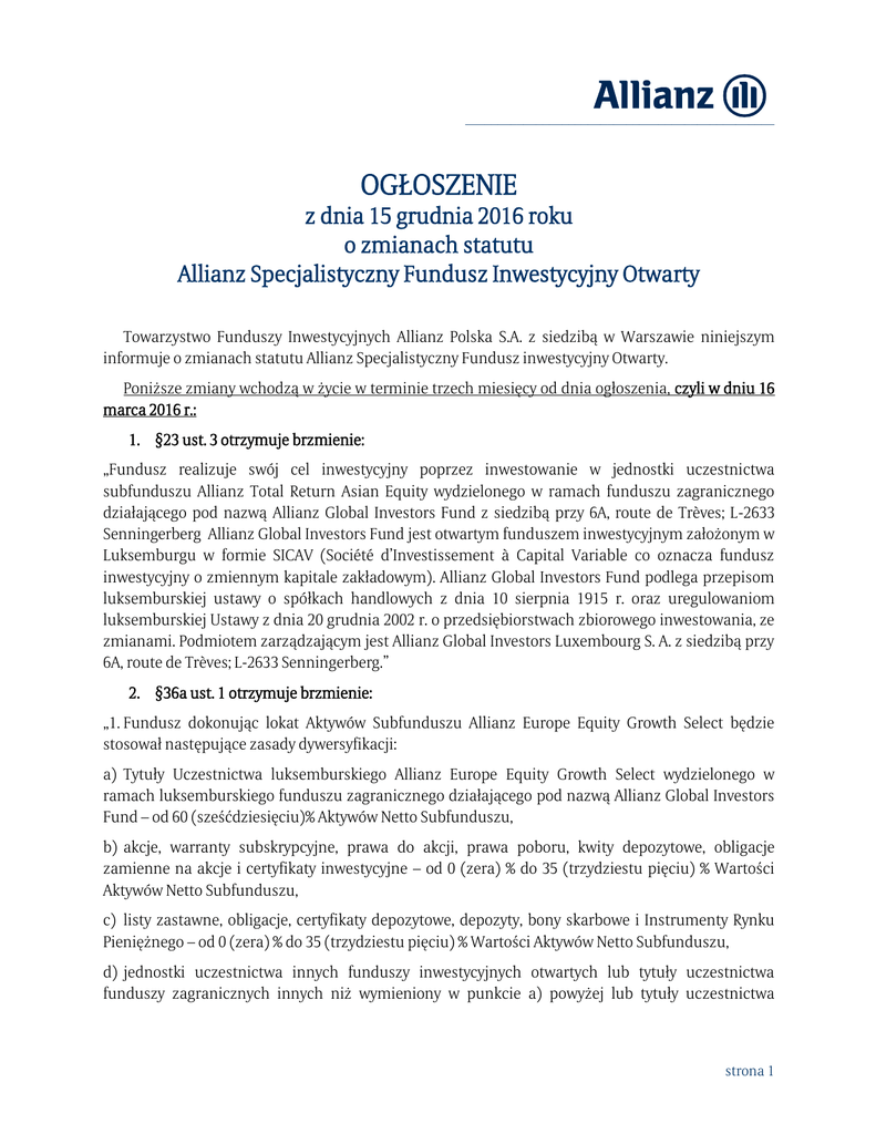 ________________________________________________ OGŁOSZENIE z dnia 15 grudnia 2016 roku o zmianach statutu Allianz Specjalistyczny Fundusz Inwestycyjny Otwarty Towarzystwo Funduszy Inwestycyjnych Allianz Polska S.A. z siedzibą w Warszawie niniejszym informuje o zmianach statutu Allianz Specjalistyczny Fundusz inwestycyjny Otwarty. Poniższe zmiany wchodzą w życie w terminie trzech miesięcy od dnia ogłoszenia, czyli w dniu 16 marca 2016 r.: 1. §23 ust. 3 otrzymuje brzmienie: „Fundusz realizuje swój cel inwestycyjny poprzez inwestowanie w jednostki uczestnictwa subfunduszu Allianz Total Return Asian Equity wydzielonego w ramach funduszu zagranicznego działającego pod nazwą Allianz Global Investors Fund z siedzibą przy 6A, route de Trèves; L-2633 Senningerberg Allianz Global Investors Fund jest otwartym funduszem inwestycyjnym założonym w Luksemburgu w formie SICAV (Société d’Investissement à Capital Variable co oznacza fundusz inwestycyjny o zmiennym kapitale zakładowym). Allianz Global Investors Fund podlega przepisom luksemburskiej ustawy o spółkach handlowych z dnia 10 sierpnia 1915 r. oraz uregulowaniom luksemburskiej Ustawy z dnia 20 grudnia 2002 r. o przedsiębiorstwach zbiorowego inwestowania, ze zmianami. Podmiotem zarządzającym jest Allianz Global Investors Luxembourg S. A. z siedzibą przy 6A, route de Trèves; L-2633 Senningerberg.” 2. §36a ust. 1 otrzymuje brzmienie: „1. Fundusz dokonując lokat Aktywów Subfunduszu Allianz Europe Equity Growth Select będzie stosował następujące zasady dywersyfikacji: a) Tytuły Uczestnictwa luksemburskiego Allianz Europe Equity Growth Select wydzielonego w ramach luksemburskiego funduszu zagranicznego działającego pod nazwą Allianz Global Investors Fund – od 60 (sześćdziesięciu)% Aktywów Netto Subfunduszu, b) akcje, warranty subskrypcyjne, prawa do akcji, prawa poboru, kwity depozytowe, obligacje zamienne na akcje i certyfikaty inwestycyjne – od 0 (zera) % do 35 (trzydziestu pięciu) % Wartości Aktywów Netto Subfunduszu, c) listy zastawne, obligacje, certyfikaty depozytowe, depozyty, bony skarbowe i Instrumenty Rynku Pieniężnego – od 0 (zera) % do 35 (trzydziestu pięciu) % Wartości Aktywów Netto Subfunduszu, d) jednostki uczestnictwa innych funduszy inwestycyjnych otwartych lub tytuły uczestnictwa funduszy zagranicznych innych niż wymieniony w punkcie a) powyżej lub tytuły uczestnictwa strona 1 ________________________________________________ instytucji wspólnego inwestowania mających siedzibę za granicą - od 0 (zera) % do 35 (trzydziestu pięciu) % Wartości Aktywów Netto Subfunduszu,” 3. §49a otrzymuje brzmienie: 1. „Subfundusz Allianz Flexi Asia Bond (Subfundusz) może wypłacać dochody ze zakumulowanych, nierozdysponowanych przychodów z lokat netto lub zrealizowanego zysku (straty) ze zbycia lokat. 2. Premie inwestycyjne i inne świadczenia pieniężne otrzymywane w związku z inwestowaniem przez Fundusz Aktywów Subfunduszu w jednostki uczestnictwa lub tytuły uczestnictwa powiększają Aktywa Subfunduszu. 3. Dochód jest wyliczany dwa razy w roku kalendarzowym na ostatni Dzień Wyceny przypadający w miesiącach maju i listopadzie. Pierwsze ustalenie dochodu Subfunduszu dokonane zostanie za okres od dnia rozpoczęcia działalności Subfunduszu do ostatniego Dnia Wyceny przypadającego w miesiącu maju 2017 r. 4. W oparciu o wysokość dochodu do wypłaty ustalonego zgodnie z ust. 1, Towarzystwo w 6 Dniu Wyceny w miesiącach czerwcu i grudniu podejmuje decyzję o wysokości dochodu podlegającego rozdysponowaniu oraz o jego wypłacie. Towarzystwo, podejmując decyzję o wysokości wypłacanego dochodu, kieruje się wysokością netto dochodu do wypłaty i płynnością finansową Subfunduszu. Wypłata dochodu nie jest gwarantowana przez Subfundusz. Mogą zdarzyć się okresy w których wypłata dochodu nie będzie możliwa. Wartość nierozdysponowanych dochodów pozostaje w Aktywach Netto oraz Aktywach Netto przypadających na Jednostkę Uczestnictwa Subnfunduszu i może podlegać wypłacie w kolejnych miesiącach. W przypadku wypłaty części dochodu w pierwszej kolejności dochód wypłacany jest z zysków zrealizowanych, a w pozostałej z przychodów netto. Pozostała niewypłacona część dochodu jest kumulowana i oczekuje do terminu następnej wypłaty. Towarzystwo opublikuje na stronie internetowej www.allianz.pl/tfi maksymalną wysokość dochodu podlegającego rozdysponowaniu. 5. Na dzień określony w ust. 4 Subfundusz ustala listę uczestników i na podstawie liczby posiadanych na ten dzień przez Uczestnika jednostek uczestnictwa przypającą im wartość wypłaty dochodu. Wartość do wypłaty przypadająca na Uczestnika wyliczana jest jako: maksymalna wysokość dochodu podlegającego rozdysponowaniu podzielona przez łączną liczbę jednostek uczestnictwa w Subfunduszu na dzień określony w ust. 4 a następnie pomnożoną przez posiadanych na ten dzień przez Uczestnika jednostek uczestnictwa. Kwota będzie podana z dokładnością do dwóch miejsc po przecinku, z zaokrągleniem w dół. Suma tak wyliczonych kwot przypadających na poszczególnych uczestników może różnić się od maksymalnej wysokości dochodu podlegającego rozdysponowaniu podanej Uchwałą Zarządu o wartość zaokrągleń. 6. Wypłata dochodu następuje w 7 Dniu Wyceny w miesiącach czerwcu i grudniu i skutkuje obniżeniem Wartości Aktywów Netto oraz Aktywów Netto przypadających na na Jednostkę Uczestnictwa Subfunduszu. Wypłacony dochód jest rozdysponowywany pomiędzy Uczestników zgodnie z ust. 7 poniżej. strona 2 ________________________________________________ 7. Najpóźniej do 14 Dnia Giełdowego każdego miesiąca Subfundusz będzie przekazywał Uczestnikom, których lista ustalona jest zgodnie ust.5, przypadającą im kwotę wypłaty dochodu. Kwota będzie przekazywana przelewem na rachunek wskazany przez Uczestnika. Kwota będzie przekazywana po uprzednim potr