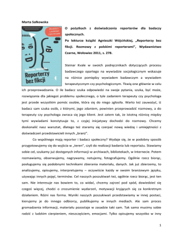 Marta Sałkowska O pożytkach z doświadczenia reporterów dla badaczy społecznych. Po lekturze książki Agnieszki Wójcińskiej, „Reporterzy bez fikcji. Rozmowy z polskimi reporterami”, Wydawnictwo Czarne, Wołowiec 2011, s. 278. Steinar Kvale w swoich podręcznikach dotyczących procesu badawczego opartego na wywiadzie socjologicznym wskazuje na różnice pomiędzy wywiadem badawczym a wywiadem terapeutycznym czy psychologicznym. Tkwią one głównie w celu ich przeprowadzania. O ile badacz szuka odpowiedzi na swoje pytania, szuka, być może, rozwiązania dla jakiegoś problemu społecznego, o tyle zadaniem terapeuty czy psychologa jest przede wszystkim pomóc osobie, która się do niego zgłosiła. Warto też zauważyć, iż badacz sam szuka osób, z którymi, jego zdaniem, powinien przeprowadzić rozmowy, a do terapeuty czy psychologa zwraca się jego klient. Jest zatem tak, że istotną różnicę między tymi wywiadami konstytuuje to, z czyjej inicjatywy dochodzi do rozmowy. Chcemy doskonalić nasz warsztat, dlatego też staramy się czerpać nową wiedzę i umiejętności z doświadczeń przedstawicieli innych „branż”. Co wspólnego mają reporter i badacz społeczny? Wydaje się, że w podobny sposób przygotowujemy się do wyjścia w „teren”, czyli do realizacji badania lub reportażu. Stawiamy sobie cel, szukamy już dostępnych informacji w archiwach, bibliotekach, w Internecie. Potem rozmawiamy, obserwujemy, nagrywamy, notujemy, fotografujemy. Ogólnie rzecz biorąc, posługujemy się podobnymi technikami zbierania materiału, danych. Jak już zbierzemy, to analizujemy, opisujemy, interpretujemy – oczywiście każdy w swoim branżowym języku, używając innych pojęć, terminów. Cel naszych poszukiwań też, ogólnie rzecz biorąc, jest ten sam. Nie interesuje nas bowiem to, co widać, chcemy zajrzeć pod spód, dowiedzieć się czegoś więcej, chodzi o zrozumienie wydarzeń, motywacji kryjących się za konkretnym działaniem. Różni nas forma. Wyniki naszych poszukiwań przedstawiamy w innej postaci, kierujemy je do innego odbiorcy, publikujemy w innych mediach. Ale sam proces gromadzenia informacji, materiału pozostaje w zasadzie taki sam. Tak samo musimy sobie radzić z ludzkim cierpieniem, nieszczęściem, emocjami. Tylko opisujemy wszystko w inny 1 sposób, każdy z nas używa swojego branżowego „slangu” i stara się sprostać „branżowym” wymaganiom. Skoro tak wiele nas łączy, warto przyjrzeć się doświadczeniom reporterów i zapytać, czego my, badacze społeczni, możemy się od nich nauczyć? Zacznijmy od budowania relacji. Reporterzy podkreślają, jak niezwykle istotne jest zapewnienie rozmówcy poczucia bezpieczeństwa, stworzenie atmosfery, w której nie będzie czuł się zakłopotany, skrępowany. Angelika Kuźniak mówi: „Ludzie chcą rozmawiać. Jeśli umiemy słuchać, nie powinno być problemu. Często pozwalam bohaterowi opowiedzieć najpierw jego wersję historii. Dzięki temu czuje się bezpiecznie, bo wyrzucił z siebie to, na czym mu zależało” (s. 49-50), Irena Morawska: „Staram się, aby każdy z moich bohaterów (…) podczas rozmowy czuł się absolutnie bezpieczny. Tylko wtedy nasza rozmowa ma sens. Dla mnie bohater to pępek świata. (…) Kiedy bohater nie czuje presji, otwiera się, znikają lęki, które ma w sobie. Wówczas jest szansa, że opowie to, o co jemu chodzi, i to, o co nam chodzi – bo to nie zawsze przecież musi być zbieżne” (s. 192). Stworzenie przyjaznej atmosfery, dopasowanie się do rozmówcy to podstawa rozmowy dobrej dla obu stron. I to może brzmieć banalnie, ale jest niezwykle ważne. Oczywiście my badacze też sobie z tego doskonale zdajemy sprawę, mówimy przecież o aranżacji sytuacji wywiadu, ale czasem zdaje się nam to umykać. Musimy pamiętać, że to osoba, do której my się zwróciliśmy robi nam uprzejmość godząc się na rozmowę. Musimy więc uszanować jej czas i to, że nam go poświęca. I należy jej się za to wdzięczność, chociażby pod postacią tego, co Magdalena Grochowska nazywa zwykłą ludzką uwagą „wykraczającą poza przedmiot rozmowy” (s. 38). Nieraz powinniśmy zostać dłużej niż wymaga tego od nas wywiad, wysłuchać do końca, być może sami coś opowiedzieć. Jeśli uda nam się dobrze zaaranżować sytuację wywiadu, będzie nam łatwiej zadawać nawet te najtrudniejsze pytania. A pytamy często o wydarzenia, o których nasi rozmówcy nigdy przedtem nie opowiadali, które łączą się z głębokimi emocjami. Nasze pytania mogę te emocje ponownie wywołać. Jak z tym sobie radzić? Co zrobić, gdy my sami z trudem powstrzymujemy emocje słuchając opowieści, które sami wywołaliśmy? Czasem osoby badane mogą nas irytować, denerwować. Innym razem ich historia może nas bardzo wzruszyć. Włodzimierz Nowak mówi, że szczere okazywanie emocji jest niezbędne podczas zbierania materiału. Podkreśla: „To musi być prawdziwa rozmowa, reporter nie może udawać. Trzeba cały czas myśleć i wiedzieć, po co się przyjechało, ale jeśli jest coś, co mnie wzrusza, to nie mogę tego ukrywać. To zakłamuje kontakt” (s. 130). Z drugiej strony, 2 Wojciech Tochman zauważa, że okazywanie emocji jest dobre o tyle, o ile reporter nie okazuje ich w stopniu większym niż jego bohater: „Jeżeli coś mnie porusza, nie ukrywam tego. Ale nie mogę być bardziej poruszony od mojego rozmówcy. Jeżeli on nie płaczę, to ja tym bardziej nie mogę płakać. Byłoby w tym coś niestosownego. Nie raz, nie dwa, kiedy w Bośni staliśmy nad masowym grobem, musiałem powstrzymać emocje. Bo to nie jest moje cierpienie. Ono jest ich: matek, które szukają kości swych synów. One tam stały, miały kamienne twarze. Czy mnie wolno było stać obok nich i chlipać?” (s. 67). My badacze wiemy, że zawsze musimy mieć z tyłu głowy cel naszej rozmowy. Nie możemy zapominać, dlaczego przyjechaliśmy, dlaczego wybraliśmy tę, a nie 