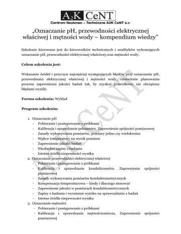 „Oznaczanie pH, przewodności elektrycznej właściwej i mętności wody – kompendium wiedzy” Szkolenie kierowane jest do kierowników technicznych i analityków wykonujących oznaczanie pH, przewodności elektrycznej właściwej oraz mętności wody. Celem szkolenia jest: Wskazanie źródeł i przyczyn najczęściej występujących błędów przy oznaczaniu pH, przewodności elektrycznej właściwej i mętności wody, omówienie planowania procesu zapewnienia jakości badań tak, by uzyskać prawidłowe, nie obciążone błędami wyniki. Forma szkolenia: Wykład Program szkolenia: 1. Oznaczanie pH - Pobieranie i postępowanie z próbkami - Kalibracja i sprawdzanie pehametru. Zapewnienie spójności pomiarowej - Zasady wykonywania pomiarów, pomiary jedno czy wielokrotne - Wpływ temperatury na wynik pomiaru - Zapewnienie jakości badań - Niezbędne zapisy z badania - Istotne źródła niepewności wyniku 2. Oznaczanie przewodności elektrycznej właściwej - Pobieranie i postępowanie z próbkami - Kalibracja i sprawdzanie konduktometru. Zapewnienie pomiarowej - Zasady wykonywania pomiarów konduktometrycznych - Kompensacja temperaturowa – kiedy i dlaczego stosować - Zapewnienie jakości w pomiarach konduktometrycznych - Zapisy z badania i wyrażanie wyniku na sprawozdaniu z badań - Istotne źródła niepewności wyniku 3. Oznaczanie mętności - Pobieranie i postępowanie z próbkami - Kalibracja i sprawdzanie mętnościomierza. Zapewnienie pomiarowej spójności spójności - Zasady wykonywania pomiarów mętności - Zapewnienie jakości badań - Źródła i przyczyny najczęściej popełnianych błędów - Istotne źródła niepewności wyniku Czas szkolenia: 7 godzin Cena szkolenia za osobę: 590 zł/netto Podana cena szkolenia obejmuje: udział w szkoleniu, materiały szkoleniowe, lunch/brunch, przerwy kawowe i zaświadczenie o uczestnictwie w szkoleniu Cena szkolenia za osobę: 730 zł/netto Podana cena szkolenia obejmuje: udział w szkoleniu, materiały szkoleniowe, obiad, przerwy kawowe i zaświadczenie o uczestnictwie w szkoleniu, zakwaterowanie w pokoju 2-osobowym wraz z kolacją. Za dodatkową opłatą (100 zł netto) zakwaterowanie w pokoju 1-osobowym.