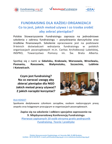 FUNDRAISING DLA KAŻDEJ ORGANIZACJI Co to jest, jakich metod używa i co trzeba zrobić aby zebrać pieniądze? Polskie Stowarzyszenie Fundraisingu zaprasza na jednodniowe szkolenia z zakresu fundraisingu – pozyskiwania darczyńców oraz środków finansowych. Szkolenie opracowane jest na podstawie 9-letnich doświadczeń wdrażania fundraisingu w polskich organizacjach pozarządowych m.in. Caritas Archidiecezji Lubelskiej, INSPRO, Towarzystwo Pomocy im. Św. Brata Alberta. Spotkaj się z nami w Gdańsku, Krakowie, Warszawie, Wrocławiu, Poznaniu, Rzeszowie, Białymstoku, Szczecinie, Lublinie i Katowicach. Czym jest fundraising? Na co zwracać uwagę aby zbierać pieniądze dla NGO Jakich metod pracy używać? Z jakich narzędzi korzystać? DLA KOGO? Spotkanie dedykowane członkom zarządów, osobom nadzorującym pracę zespołu oraz księgowym pracującym w organizacjach pozarządowych. Zapisz się na szkolenie i odbierz specjalne zaproszenie na 9. Międzynarodową Konferencję Fundraisingu Pierwsze zapisanych 10 osób otrzyma gratis podręcznik Fundraising. Teoria i praktyka Polskie Stowarzyszenie Fundraisingu, ul. Szewska 20/4, 31-009 Kraków, tel./faks +48 12 423 80 07, e-mail: [email protected]; www.szkolenia.fundraising.org.pl DLACZEGO WARTO BYĆ NA SZKOLENIU? Poznasz metodę pozyskiwania środków finansowych Dowiesz się co motywuje ludzi do dawania pieniędzy Poznasz mechanizmy które pomagają gromadzić fundusze na dobre cele oraz dowiesz się w jaki sposób organizacja może przygotować się do działań fundraisingowych Podpowiemy kiedy zatrudnić fundraisera i jak zbudować dział fundraisingu Zobaczysz w co warto zainwestować a czego nie opłaca się robić w zależności od sytuacji Twojej organizacji PROGRAM SZKOLENIA 1. Jak zebrać pieniądze szybko - ćwiczenie 2. Idea dobroczynności i tradycje filantropii w Polsce 3. Fundraising - idea finansowania organizacji w świecie trzech sektorów 4. Darowizna - pieniądze bez pośredników i podatków 5. Darczyńcy - kto daje pieniądze na dobre cele 6. Metody fundraisingowe - przegląd 7. Polskie doświadczenia wprowadzania metod fundraisingowych 8. Analiza potrzeb i możliwości finansowania organizacji uczestników szkolenia - warsztat 9. Jak zatrudnić fundraisera - oczekiwania organizacji i pracownika 10. Podsumowanie Dodatkowo: Jak wykorzystać granty do rozwoju organizacji Jak zwiększyć przychody z dotychczasowych źródeł Dlaczego się nie uda - jakie zachowania w organizacji uniemożliwiają efektywność - przegląd z doświadczeń PSF HARMONOGRAM SPOTKAŃ: Gdańsk – 21 kwietnia 2015 r. 10:00-15:00 Kraków – 23 kwietnia 2015 r. 10:00-15:00 Warszawa – 28 kwietnia 2015 r. 10:00-15:00 Wrocław – 6 maja 2015 r. 10:00-15:00 Poznań – 7 maja 10:00-15:00 Rzeszów – 19 maja 2015 r. 10:00-15:00 Lublin – 21 maja 10:00-15:00 Polskie Stowarzyszenie Fundraisingu, ul. Szewska 20/4, 31-009 Kraków, tel./faks +48 12 423 80 07, e-mail: [email protected]; www.szkolenia.fundraising.org.pl Białystok – 3 czerwca 10:00-15:00 Szczecin – 10 czerwca 10:00-15:00 Katowice – 17 czerwca 10:00-15:00 CENA: 340 zł brutto obejmuje szkolenie zgodnie z podaną tematyką oraz zaświadczenie potwierdzające udział w szkoleniu. SZKOLENIE POPROWADZI: Jerzy Mika Od czerwca 2012 roku Prezes Zarządu Polskiego Stowarzyszenia Fundraisingu. Zajmuje się szkoleniami, zarządzaniem i doradztwem strategicznym dla organizacji społecznych, biznesowych i samorządowych. Absolwent i pracownik naukowy Uniwersytetu Opolskiego. Wykładowca - współpracownik Wyższej Szkoły Bankowej, UPJPII, Wicedyrektor Katolickiego Instytutu Zarządzania. Prezes Towarzystwa Alternatywnego Kształcenia ‚TAK’ w Opolu. Instruktor ZHR, współpracownik i doradca firm. Trener zarządzania i konsultant wielu organizacji społecznych, fundacji i stowarzyszeń, administracji samorządowej. Współpracownik Towarzystwa Doradczego Ryszard Stocki, audytor projektu NPI – audyt organizacyjny. Trener i konsultant programu naprzemiennego kształcenia inżynierów Silesianum Professional. Coach w systemie kształcenia ICAM. Właściciel firmy szkoleniowej. ZGŁOSZENIA I ZAPYTANIA: Justyna Junga Specjalista ds. promocji i sprzedaży Tel.: 663 490 000 e-mail: [email protected] www.szkolenia.fundraising.org.pl Polskie Stowarzyszenie Fundraisingu, ul. Szewska 20/4, 31-009 Kraków, tel./faks +48 12 423 80 07, e-mail: [email protected]; www.szkolenia.fundraising.org.pl