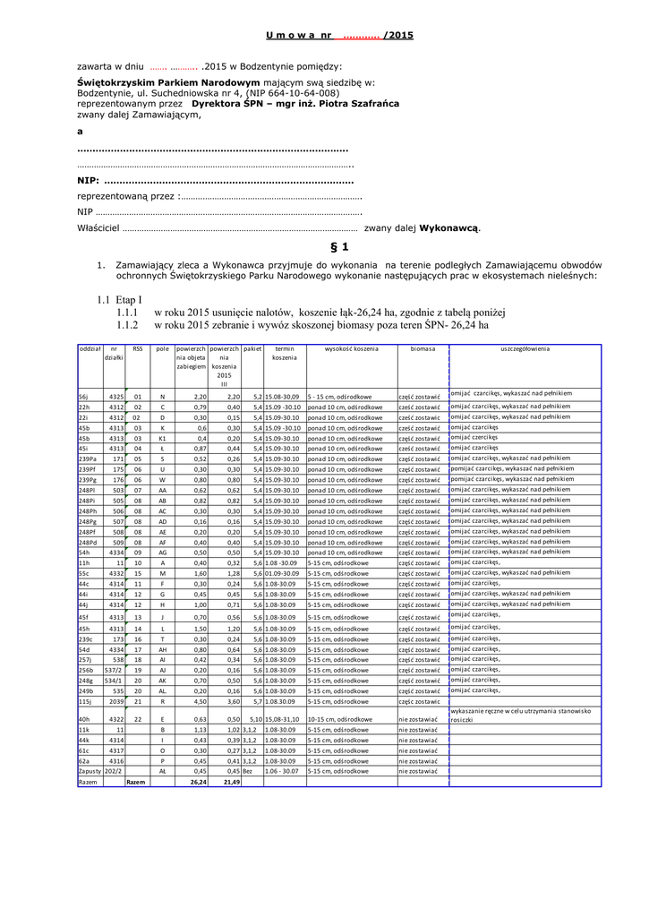 U m o w a nr ………… /2015 zawarta w dniu ……. ……….. .2015 w Bodzentynie pomiędzy: Świętokrzyskim Parkiem Narodowym mającym swą siedzibę w: Bodzentynie, ul. Suchedniowska nr 4, (NIP 664-10-64-008) reprezentowanym przez Dyrektora ŚPN – mgr inż. Piotra Szafrańca zwany dalej Zamawiającym, a …………………………………………………………………………….. …………………………………………………………………………………………………….. NIP: ………………………………………………………………………. reprezentowaną przez :…………………………………………………………………. NIP …………………………………………………………………………………………………. Właściciel ……………………………………………………………………………………… zwany dalej Wykonawcą. §1 1. Zamawiający zleca a Wykonawca przyjmuje do wykonania na terenie podległych Zamawiającemu obwodów ochronnych Świętokrzyskiego Parku Narodowego wykonanie następujących prac w ekosystemach nieleśnych: 1.1 Etap I 1.1.1 1.1.2 oddział w roku 2015 usunięcie nalotów, koszenie łąk-26,24 ha, zgodnie z tabelą poniżej w roku 2015 zebranie i wywóz skoszonej biomasy poza teren ŚPN- 26,24 ha nr działki RSS pole powierzch powierzch pakiet nia objeta nia zabiegiem koszenia 2015 III termin koszenia wysokość koszenia biomasa uszczegółowienia 56j 4325 01 N 2,20 2,20 5,2 15.08-30,09 5 - 15 cm, odśrodkowe część zostawić 22h 4312 02 C 0,79 0,40 5,4 15.09 -30.10 ponad 10 cm, odśrodkowe cześć zostawić omijać czarcikęs, wykaszać nad pełnikiem 22i 4312 02 D 0,30 0,15 5,4 15.09-30.10 ponad 10 cm, odśrodkowe cześć zostawic omijać czarcikęs, wykaszać nad pełnikiem 45b 4313 03 K 0,6 0,30 5,4 15.09 -30.10 ponad 10 cm, odśrodkowe cześć zostawić omijać czarcikęs 45b 4313 03 K1 0,4 0,20 5,4 15.09-30.10 ponad 10 cm, odśrodkowe część zostawić omijać czercikęs 45i 4313 04 Ł 0,87 0,44 5,4 15.09-30.10 ponad 10 cm, odśrodkowe cześć zostawić omijać czarcikęs 239Pa 171 05 S 0,52 0,26 5,4 15.09-30.10 ponad 10 cm, odśrodkowe część zostawić omijać czarcikęs, wykaszać nad pełnikiem 239Pf 175 06 U 0,30 0,30 5,4 15.09-30.10 ponad 10 cm, odśrodkowe część zostawić pomijać czarcikęs, wykaszać nad pełnikiem 239Pg 176 06 W 0,80 0,80 5,4 15.09-30.10 ponad 10 cm, odśrodkowe część zostawić pomijać czarcikęs, wykaszać nad pełnikiem 248Pl 503 07 AA 0,62 0,62 5,4 15.09-30.10 ponad 10 cm, odśrodkowe część zostawić omijać czarcikęs, wykaszać nad pełnikiem 248Pi 505 08 AB 0,82 0,82 5,4 15.09-30.10 ponad 10 cm, odśrodkowe część zostawić omijać czarcikęs, wykaszać nad pełnikiem 248Ph 506 08 AC 0,30 0,30 5,4 15.09-30.10 ponad 10 cm, odśrodkowe część zostawić omijać czarcikęs, wykaszać nad pełnikiem 248Pg 507 08 AD 0,16 0,16 5,4 15.09-30.10 ponad 10 cm, odśrodkowe część zostawić omijać czarcikęs, wykaszać nad pełnikiem 248Pf 508 08 AE 0,20 0,20 5,4 15.09-30.10 ponad 10 cm, odśrodkowe część zostawić omijać czarcikęs, wykaszać nad pełnikiem 248Pd 509 08 AF 0,40 0,40 5,4 15.09-30.10 ponad 10 cm, odśrodkowe część zostawić omijać czarcikęs, wykaszać nad pełnikiem 54h 4334 09 AG 0,50 0,50 5,4 15.09-30.10 ponad 10 cm, odśrodkowe część zostawić omijać czarcikęs, wykaszać nad pełnikiem 11h 11 10 A 0,40 0,32 5,6 1.08 -30.09 5-15 cm, odśrodkowe część zostawić omijać czarcikęs, 55c 4332 15 M 1,60 1,28 5,6 01.09-30.09 5-15 cm, odśrodkowe część zostawić omijać czarcikęs, wykaszać nad pełnikiem 44c 4314 11 F 0,30 0,24 5,6 1.08-30.09 5-15 cm, odśrodkowe część zostawić omijać czarcikęs, 44i 4314 12 G 0,45 0,45 5,6 1.08-30.09 5-15 cm, odśrodkowe część zostawić omijać czarcikęs, wykaszać nad pełnikiem 44j 4314 12 H 1,00 0,71 5,6 1.08-30.09 5-15 cm, odśrodkowe część zostawić omijać czarcikęs, wykaszać nad pełnikiem 45f 4313 13 J 0,70 0,56 5,6 1.08-30.09 5-15 cm, odśrodkowe część zostawić omijać czarcikęs, 45h 4313 14 L 1,50 1,20 5,6 1.08-30.09 5-15 cm, odśrodkowe część zostawić omijać czarcikęs, 239c 173 16 T 0,30 0,24 5,6 1.08-30.09 5-15 cm, odśrodkowe część zostawić omijać czarcikęs, 54d 4334 17 AH 0,80 0,64 5,6 1.08-30.09 5-15 cm, odśrodkowe część zostawić omijać czarcikęs, 257j 538 18 AI 0,42 0,34 5,6 1.08-30.09 5-15 cm, odśrodkowe część zostawić omijać czarcikęs, omijać czarcikęs, wykaszać nad pełnikiem 256b 537/2 19 AJ 0,20 0,16 5,6 1.08-30.09 5-15 cm, odśrodkowe część zostawić omijać czarcikęs, 248g 534/1 20 AK 0,70 0,50 5,6 1.08-30.09 5-15 cm, odśrodkowe część zostawić omijać czarcikęs, omijać czarcikęs, 249b 535 20 AL. 0,20 0,16 5,6 1.08-30.09 5-15 cm, odśrodkowe część zostawić 115j 2039 21 R 4,50 3,60 5,7 1.08.30.09 5-15 cm, odśrodkowe częśc zostawic 40h 4322 22 E 0,63 0,50 5,10 15,08-31,10 10-15 cm, odśrodkowe nie zostawiać 11k 11 B 1,13 1,02 3,1,2 1.08-30.09 5-15 cm, odśrodkowe nie zostawiać 44k 4314 I 0,43 0,39 3,1,2 1.08-30.09 5-15 cm, odśrodkowe nie zostawiać 61c 4317 O 0,30 0,27 3,1,2 1.08-30.09 5-15 cm, odśrodkowe nie zostawiać 62a 4316 P 0,45 0,41 3,1,2 1.08-30.09 5-15 cm, odśrodkowe nie zostawiać AŁ 0,45 0,45 Bez 1.06 - 30.07 5-15 cm, odśrodkowe nie zostawiać Zapusty 202/2 Razem Razem 26,24 21,49 wykaszanie ręczne w celu utrzymania stanowisko rosiczki 1.2 Etap II 1.2.1 w roku 2016 usunięcie nalotów, koszenie łąk-26,24 ha, zgodnie z tabelą poniżej. 1.2.2 w roku 2016 zebranie i wywóz skoszonej biomasy poza teren ŚPN- 26,24 ha oddział nr działki RSS pole 56j 22h 22i 45b 45b 45i 239Pa 239Pf 239Pg 248Pl 248Pi 248Ph 248Pg 248Pf 248Pd 54h 11h 55c 44c 44i 44j 4325 4312 4312 4313 4313 4313 171 175 176 503 505 506 507 508 509 4334 11 4332 4314 4314 4314 01 02 02 03 03 04 05 06 06 07 08 08 08 08 08 09 10 15 11 12 12 N C D K K1 Ł S U W A