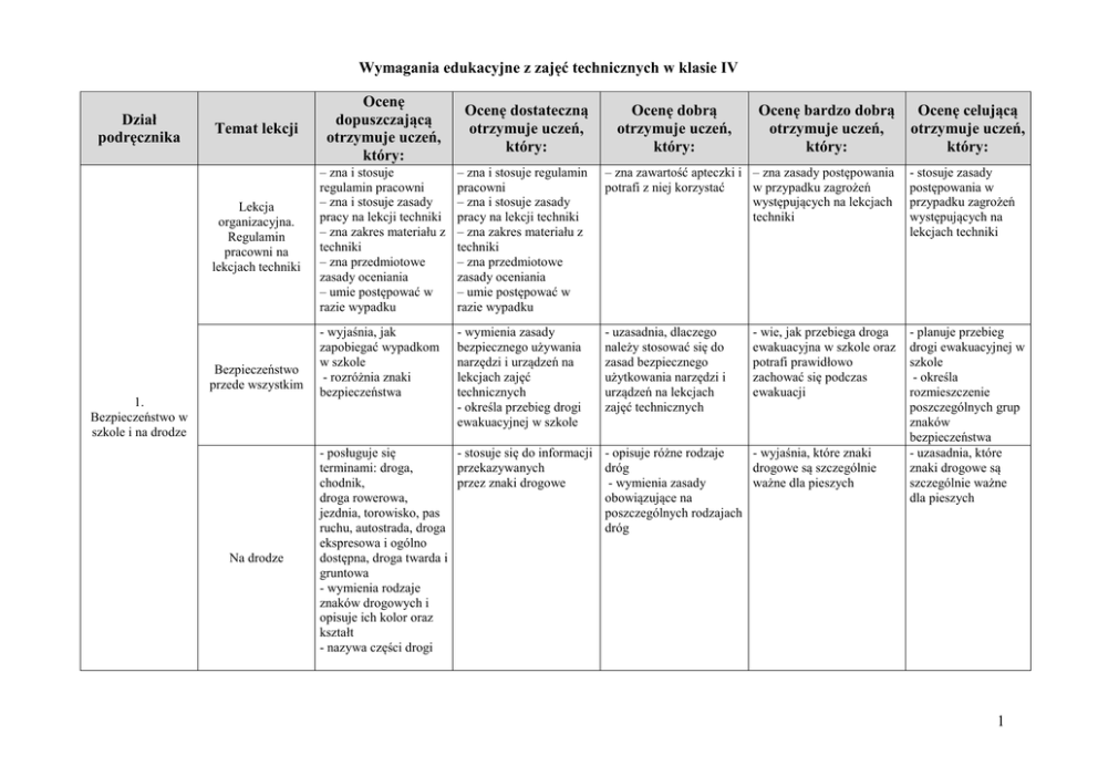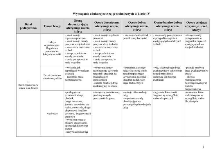 Wymagania edukacyjne z zajęć technicznych w klasie IV Dział podręcznika Temat lekcji Ocenę dopuszczającą otrzymuje uczeń, który: Lekcja organizacyjna. Regulamin pracowni na lekcjach techniki – zna i stosuje regulamin pracowni – zna i stosuje zasady pracy na lekcji techniki – zna zakres materiału z techniki – zna przedmiotowe zasady oceniania – umie postępować w razie wypadku – zna i stosuje regulamin pracowni – zna i stosuje zasady pracy na lekcji techniki – zna zakres materiału z techniki – zna przedmiotowe zasady oceniania – umie postępować w razie wypadku – zna zawartość apteczki i – zna zasady postępowania potrafi z niej korzystać w przypadku zagrożeń występujących na lekcjach techniki - stosuje zasady postępowania w przypadku zagrożeń występujących na lekcjach techniki - wyjaśnia, jak zapobiegać wypadkom w szkole - rozróżnia znaki bezpieczeństwa - wymienia zasady bezpiecznego używania narzędzi i urządzeń na lekcjach zajęć technicznych - określa przebieg drogi ewakuacyjnej w szkole - uzasadnia, dlaczego należy stosować się do zasad bezpiecznego użytkowania narzędzi i urządzeń na lekcjach zajęć technicznych - planuje przebieg drogi ewakuacyjnej w szkole - określa rozmieszczenie poszczególnych grup znaków bezpieczeństwa - uzasadnia, które znaki drogowe są szczególnie ważne dla pieszych Bezpieczeństwo przede wszystkim 1. Bezpieczeństwo w szkole i na drodze Na drodze Ocenę dostateczną otrzymuje uczeń, który: - stosuje się do informacji - posługuje się terminami: droga, przekazywanych chodnik, przez znaki drogowe droga rowerowa, jezdnia, torowisko, pas ruchu, autostrada, droga ekspresowa i ogólno dostępna, droga twarda i gruntowa - wymienia rodzaje znaków drogowych i opisuje ich kolor oraz kształt - nazywa części drogi Ocenę dobrą otrzymuje uczeń, który: Ocenę bardzo dobrą otrzymuje uczeń, który: - wie, jak przebiega droga ewakuacyjna w szkole oraz potrafi prawidłowo zachować się podczas ewakuacji - opisuje różne rodzaje - wyjaśnia, które znaki dróg drogowe są szczególnie ważne dla pieszych - wymienia zasady obowiązujące na poszczególnych rodzajach dróg Ocenę celującą otrzymuje uczeń, który: 1 - właściwie organizuje miejsce pracy - prawidłowo posługuje się narzędziami do obróbki papieru zgodnie z ich przeznaczeniem - wymienia kolejność działań (operacji technologicznych) - wykonuje pracę według przyjętych założeń - dba o porządek i bezpieczeństwo w miejscu pracy - szacuje czas kolejnych działań (operacji technologicznych) - wykonuje pracę w sposób samodzielny - formułuje ocenę gotowej pracy - posługuje się terminami: przejście dla pieszych, sygnalizator - opisuje sposób przechodzenia przez Piechotą po mieście jezdnię na przejściach dla pieszych z sygnalizacją świetlną i bez niej - przedstawia zasadę działania sygnalizatorów na przejściach dla pieszych - wskazuje sytuacje zagrażające bezpieczeństwu pieszego na przejściu dla pieszych - ocenia bezpieczeństwo pieszego w różnych sytuacjach - formułuje reguły - prawidłowo bezpiecznego formułuje reguły przechodzenia przez jezdnię bezpiecznego przechodzenia przez jezdnię i je stosuje - posługuje się terminami: obszar zabudowany i niezabudowany - określa sposób poruszania się po drogach w obszarze niezabudowanym - uzasadnia konieczność noszenia odblasków - wskazuje, na jakich częściach ubrania pieszego należy umieścić odblaski, aby był on widoczny po zmroku na drodze - projektuje element odblaskowy przypinany do plecaka - wskazuje różnice między drogą w obszarze zabudowanym i niezabudowanym - analizuje, jak noszenie odblasków wpływa na widoczność pieszych na drodze - ocenia, z jakimi zagrożeniami na drodze mogą się zetknąć piesi w obszarze niezabudowanym To takie proste!Pan Stop Pieszy poza miastem - wykonuje pracę w sposób twórczy i samodzielny - wykazuje się kreatywnością, projektując element odblaskowy 2 W podróży To takie proste! – Pamiątkowy Album Piesza wycieczka - posługuje się terminami: środki komunikacji publicznej, piktogram, rozkład jazdy - podaje przykłady właściwego zachowania w środkach komunikacji miejskiej - właściwie organizuje miejsce pracy - wymienia kolejność działań (operacji technologicznych) - wyznacza trasę pieszej wycieczki - pakuje plecak samodzielnie i w racjonalny sposób - odczytuje informacje przekazywane przez znaki spotykane na terenie kąpieliska - wyjaśnia znaczenie piktogramów - czyta ze zrozumieniem rozkład jazdy - wybiera na podstawie rozkładu jazdy najdogodniejsze połączenie między miejscowościami - planuje cel wycieczki i dobiera odpowiedni środek transportu, korzystając z rozkładu jazdy - prawidłowo posługuje się narzędziami do obróbki papieru - wykonuje prace zgodnie z założeniami - dba o porządek i bezpieczeństwo w miejscu pracy - projektuje własny piktogram na podstawie gotowych wzorów - odnajduje w rozkładzie jazdy dogodne połączenie z przesiadką - formułuje zasady właściwego zachowania się w środkach komunikacji miejskiej - wyjaśnia, dlaczego piktogramy są uniwersalne - wyznacza trasą wycieczki i prowadzi ja przez dwie lub więcej miejscowości - wybiera dogodne połączenie środkami komunikacji publicznej - projektuje piktogram, wykazując się pomysłowością i samodzielnoscią - posługuje się narzędziami z zachowaniem zasad bezpieczeństwa - szacuje czas kolejnych działań (operacji technologicznych) - wykonuje pracę w sposób samodzielny - formułuje ocenę gotowej pracy - wykonuje pracę w sposób twórczy i samodzielny - wykonuje przewodnik turystyczny po swojej okolicy z uwzględnieniem atrakcji turystycznych - objaśnia oznaczenia - planuje trasę wycieczki, szlaków uwzględniając atrakcje turystycznych turystyczne - określa, jakie zagrożenia niesie ze sobą korzystanie z niestrzeżonych kąpielisk - podaje w przewodniku i