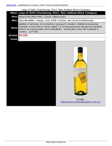 WINniczek - subiektywnie o kuchni, winie i innych przyjemnościach Leap of Faith Chardonnay 2011, New Holland WIne Company Wino: Leap of Faith Chardonnay 2011, New Holland WIne Company Oko: klasycznie złoty kolor, czysty i błyszczący Nos: dojrzałe jabłko, mango, nuty toffie i tostów, ale raczej średniej wagi gładkie i kremowe, brzoskwinie z gorącym masłem; delikatnie kwasowy dodatek w końcówce; dosyć pełne i w sumie poprawne ale jednak banalne; Usta: dobre na imprezę jako wino koktailowe - atrakcyjna cena (do kupienia w Leclerc - 22 PLN) Ocena: 82/100 Cena: * Etykieta zdjęcie Źródło: http://www.newhollandwine.com.au http://winniczek.eu