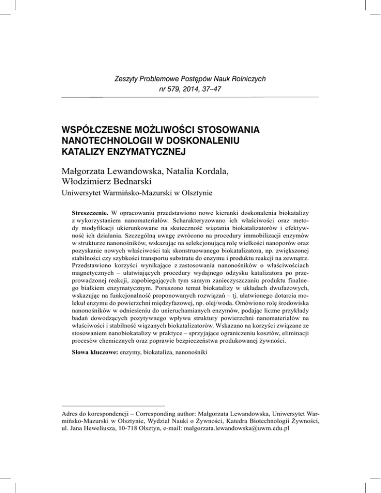Zeszyty Problemowe Postępów Nauk Rolniczych nr 579, 2014, 37–47 WSPÓŁCZESNE MOŻLIWOŚCI STOSOWANIA NANOTECHNOLOGII W DOSKONALENIU KATALIZY ENZYMATYCZNEJ Małgorzata Lewandowska, Natalia Kordala, Włodzimierz Bednarski Uniwersytet Warmińsko-Mazurski w Olsztynie Streszczenie. W opracowaniu przedstawiono nowe kierunki doskonalenia biokatalizy z wykorzystaniem nanomateriałów. Scharakteryzowano ich właściwości oraz metody modyfikacji ukierunkowane na skuteczność wiązania biokatalizatorów i efektywność ich działania. Szczególną uwagę zwrócono na procedury immobilizacji enzymów w strukturze nanonośników, wskazując na selekcjonującą rolę wielkości nanoporów oraz pozyskanie nowych właściwości tak skonstruowanego biokatalizatora, np. zwiększonej stabilności czy szybkości transportu substratu do enzymu i produktu reakcji na zewnątrz. Przedstawiono korzyści wynikające z zastosowania nanonośników o właściwościach magnetycznych – ułatwiających procedury wydajnego odzysku katalizatora po przeprowadzonej reakcji, zapobiegających tym samym zanieczyszczaniu produktu finalnego białkiem enzymatycznym. Poruszono temat biokatalizy w układach dwufazowych, wskazując na funkcjonalność proponowanych rozwiązań – tj. ułatwionego dotarcia molekuł enzymu do powierzchni międzyfazowej, np. olej/woda. Omówiono rolę środowiska nanonośników w odniesieniu do unieruchamianych enzymów, podając liczne przykłady badań dowodzących pozytywnego wpływu struktury powierzchni nanomateriałów na właściwości i stabilność wiązanych biokatalizatorów. Wskazano na korzyści związane ze stosowaniem nanobiokatalizy w praktyce – sprzyjające ograniczeniu kosztów, eliminacji procesów chemicznych oraz poprawie bezpieczeństwa produkowanej żywności. Słowa kluczowe: enzymy, biokataliza, nanonośniki Adres do korespondencji – Corresponding author: Małgorzata Lewandowska, Uniwersytet Warmińsko-Mazurski w Olsztynie, Wydział Nauki o Żywności, Katedra Biotechnologii Żywności, ul. Jana Heweliusza, 10-718 Olsztyn, e-mail: [email protected] 38 M. Lewandowska, N. Kordala, W. Bednarski WSTĘP Postęp w biotechnologii przemysłowej znajduje potwierdzenie między innymi we wzrastającym zainteresowaniu produkcją oraz przemysłowym stosowaniem preparatów enzymatycznych. Źródłem większości z nich (ok. 90%) są mikroorganizmy. Obecnie kilkaset produktów dostępnych na rynku otrzymuje się z wykorzystaniem biokatalizy enzymatycznej [Illanes i in. 2012]. Poprawa bezpieczeństwa produkowanej żywności wymaga podjęcia przedsięwzięć zmierzających do upowszechnienia katalizy enzymatycznej w celu eliminowania procesów chemicznych [Głód i in. 2014]. Uzasadnione jest jednakże ciągłe jej doskonalenie z uwzględnieniem aspektów technologicznych i ekonomicznych. W tym zakresie aktualny pozostaje problem słabej stabilności operacyjnej biokatalizatorów. W celu jej poprawy stosowane są np. metody modyfikacji białek enzymatycznych lub DNA [Illanes i in. 2012]. Ważnym zagadnieniem jest również dążenie do zmniejszenia kosztów pozyskiwania i stosowania preparatów enzymatycznych w produkcji żywności, detergentów, farmaceutyków oraz biopaliw. Sprzyja temu postęp w zakresie technik immobilizacji enzymów przyczyniający się do ich wielokrotnego wykorzystania [Govardhan 1999, Wang i in. 2005, Nair i in. 2007, Guncheva i in. 2014]. W poprawie efektywności procesów enzymatycznych znaczące są osiągnięcia inżynierii bioreaktorowej oraz inżynierii środowiska katalizowanych reakcji [Mahapatro i in. 2004]. Przykładem postępu w wyżej wymienionym zakresie może być zastosowanie hydrolaz w tak zwanej odwróconej syntezie. Znane jest zastosowanie proteaz w katalizie syntezy wiązań peptydowych, karbohydrolaz w reakcji transgalaktozylacji oraz lipaz katalizujących reakcje estryfikacji i transestryfikacji [Hasan i in. 2006, Miletić i in. 2010, Park i in. 2010, Say i in. 2011]. W produkcji preparatów enzymatycznych o oczekiwanych cechach, np. aktywności, selektywności, specyficzności substratowej, stosowana jest inżynieria białek, w której dominują techniki komputerowe, miejscowo ukierunkowana mutageneza oraz procedury ewolucji molekularnej [Illanes i in. 2012]. Do najnowszych rozwiązań w obszarze omawianej problematyki zaliczyć można stosowanie metod nanotechnologicznych. Konsekwencją tych możliwości jest coraz powszechniej stosowana nanobiokataliza [Wang 2006, Kim i in. 2007, Fang i in. 2011, Ansari i Husain 2012, Zhang i in. 2013b]. Postęp w tym zakresie dotyczy głównie nowych technik immobilizacji enzymów w nanostrukturyzowanych matrycach. Charakteryzują się one rozwiniętą powierzchnią, co ułatwia ich wiązanie z enzymami, większym poziomem upakowania, a tym samym korzystniejszą aktywnością biokatalizatora w przeliczeniu na jednostkę masy lub objętości. Jedną ze szczególnie korzystnych właściwości nanostrukturyzowanych materiałów jest ich wielkość mierzona w nanometrach, a więc podobna do wielkości molekuł enzymów. Dominanta ta w połączeniu z innymi korzystnymi cechami nanomateriałów, takimi jak przewodność elektryczna czy oddziaływanie magnetyczne, może być podstawą zaliczenia tych nośników do grupy sprzyjającej poprawie stabilności aktywności immobilizowanych enzymów. Ponadto fizyczne właściwości nanonośników ułatwiają dyfuzję Zeszyty Problemowe Postępów Nauk Rolniczych Współczesne możliwości stosowania nanotechnologii w doskonaleniu katalizy... 39 i mobilność substratów, co sprzyja wysokiej aktywności związanych białek enzymatycznych [Kim i in. 2006a, Liu i in. 2009, Illines i in. 2012]. Do dobrze poznanych nanomateriałów zalicza się: nanorurki węglowe, grafen, tlenki cynku, cyrkonu, krzemu, żelaza oraz złoto i srebro [Kim i in. 2007, Ali i Winterer 2010, Husain i in. 2011, Wang i in. 2011, Ansari i in. 2012, Zhang i in. 2013a, Guncheva i in. 2014, Pav