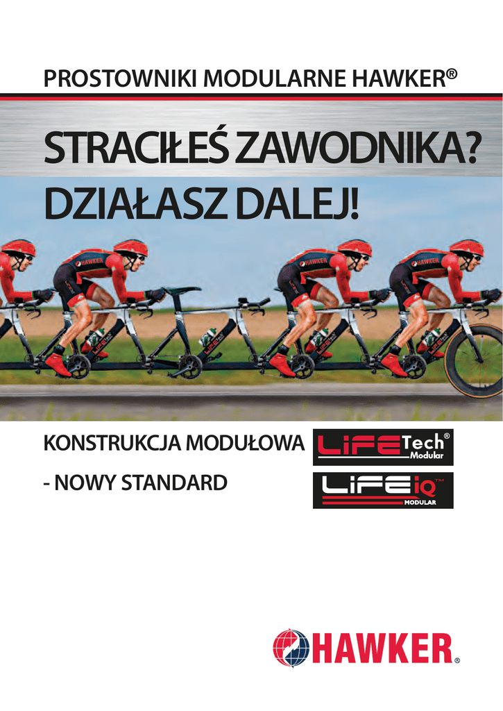 PROSTOWNIKI MODULARNE HAWKER® STRACIŁEŚ ZAWODNIKA? DZIAŁASZ DALEJ! KONSTRUKCJA MODUŁOWA - NOWY STANDARD KONSTRUKCJA MODUŁOWA - NOWY STANDARD MAKSYMALNA WYDAJNOŚĆ I NIEZAWODNOŚĆ Moduły prostowników, funkcjonujące na zasadzie plug & play („podłącz i działaj”) sterowane są przez zaawansowany algorytm, który automatycznie je uruchamia wedle kryterium optymalizacji wydajności ładowania, utrzymując ją stale na najwyższym poziomie. Modułowa struktura jest technologią przełomową, zapewniającą większą niezawodność i uniwersalność. Czasy, gdy usterka niewielkiego podzespołu mogła uniemożliwić uruchomienie prostownika, mamy już za sobą. Jeśli jeden z modułów ulegnie drobnej awarii, wówczas prostownik pomija ten moduł i kontynuuje pracę przy obniżonej mocy, nie przerywając ładowania i nie zakłócając tym samym procesów produkcyjnych w Twojej firmie. MNIEJSZY ŚLAD ENERGETYCZNY Modułowe prostowniki Hawker® obniżają koszty ładowania baterii, ponieważ zużywają mniej energii elektrycznej, co ma również korzystny wpływ na nasze środowisko naturalne. Znakomite parametry ładowania (niski współczynnik przeładowania) w połączeniu z wysoką sprawnością (do 94%) czynią tę gamę prostowników najbardziej oszczędnym rozwiązaniem na rynku. Zintegrowany zaawansowany system regulacji współczynnika mocy (Power Factor Control) pozwala na obniżenie zużycia mocy biernej i redukcję zniekształcenia sygnału prądu zmiennego, wpływając korzystnie na parametry pracy sieci elektrycznej, koszty instalacji oraz zużycia energii. ZOPTYMALIZOWANE ŁADOWANIE Wprowadzając nową linię prostownikow modułowych, zoptymalizowaliśmy charakterystyki ładowania co pozwoliło na skrócenie czasu ładowania od 1 do 2 godzin (w zależności od typu akumulatora). Jesteśmy świadomi, że czas jest jednym z najistotniejszych czynników kosztowych w działalności gospodarczej, staramy się więc stale mieć ten fakt na względzie. Nowa gama inteligentnych prostowników modułowych zapewnia automatyczną identyfikację baterii, większą wydajność i sprawność ładowania oraz kontrolę współczynnika mocy, co pozwala idealnie dostosować parametry ładowania do potrzeb przy jednoczesnym zachowaniu wszystkich standardowych korzyści płynących z zastosowania technologii wysokiej częstotliwości. ELASTYCZNE ROZWIĄZANIA I UPROSZCZONA OBSŁUGA Rozwiązanie, jakim jest prostownik modułowy, może być stosowane do akumulatorów o szerokim zakresie pojemności, co daje możliwość redukcji liczby i ilości typów urządzeń ładujących. Zmniejszona ilość prostowników pozwala na zaoszczędzenie przestrzeni magazynowej przy tej samej wielkości floty i przy niezmiennych zadaniach produkcyjnych. Rozbudowana funkcja autodiagnostyki pozwala na szybką i pewną reakcję serwisu w stanach awaryjnych sprowadzając większość napraw do prostej czynności wymiany modułu. Uniwersalne moduly – w danym zakresie - są stale dostępne i w nagłych sytuacjach mogą być dostarczone do samodzielnej wymiany. “Optymalizacja ładowania poprzez zastosowanie nowoczesnej budowy modułowej” PODSTAWOWE CECHY ŁADOWANIE Ładowanie wyrównawcze Autodiagnostyka Ładowanie kompensacyjne Ekran LCD Ładowanie odsiarczające Optymalizowany czas ładowania ELASTYCZNOŚĆ Szeroki zakres charakterystyk ładowania Wielonapięciowy Dla różnych pojemności, z możliwością zwiększenia mocy wyjściowej 1 i 3 -fazowe KOMUNIKACJA prostownik 3 fazowy - 4 modułowy USB do odczytu danych (odczyt i załadowanie) KONSTRUKCJA prostownik 1 fazowy - 3 modułowy Lekka i nowoczesna konstrukcja Wolnostojące lub montowane na ścianie Budowa modułowa Wyświetlacz LCD z menu do zaprogramowania przez użytkownika Uchwyt podtrzymujący przewody TECHNOLOGIA PRZYJAZNA DLA ŚRODOWISKA Obniżony ślad węglowy przy mniejszym współczynniku ładowania (mniejsze zużycie energii) Oszczędność energii: sprawność do 94% Zmniejszone zużycie mocy biernej dzięki zintegrowanej, aktywnej korekcie współczynnika mocy Zużycie poniżej 10W w trybie oczekiwania/ spoczynku (stand by) wnętrze 3-modułowego urządzenia Zgodność z najnowszymi normami (Europa, US, Azja) Lifetech Modular Moduły 1 kW Moduły 3,5 kW Obudowy z 1, 3 i 6 gniazdami na moduły Obudowy z 4 i 6 gniazdami na moduły 1-fazowe - 86-230V 3-fazowe 400-480V Zakres napięć ładowania: 12-24-36/48 V od 1 kW do 6 kW Zastosowanie: bloki XFC , akumulatory VRLA (żelowe, AGM) standardowe otwarte o zredukowanej obsłudze (Water Less®), duże obciążenia prostownik Lifetech® 1 kW Zakres napięć ładowania: 24/36/48V od 3,5 kW do 21 kW 72/80V od 3,5 kW do 21 kW Zastosowanie: bloki XFC , akumulatory VRLA (żelowe, AGM) standardowe otwarte o zredukowanej obsłudze (Water Less®), duże obciążenia PODSTAWOWE CECHY ŁADOWANIE Ładowanie wyrównawcze Autodiagnostyka Ładowanie kompensacyjne Ładowanie odsiarczające Zoptymalizowany czas ładowania Bezłukowe odłączanie (opcjonalne) Kolorowy ekran TFT Odpowiednie do akumulatorów z profilem szybkiego ładowania, (Water Less® 20 i XFC™ 2V) Automatyczne przystosowanie profilu ładowania do temperatury dzięki współpracy z kontrolerem Wi-IQ® ELASTYCZNOŚĆ Szeroki zakres charakterystyk ładowania prostownik 3 fazowy 4 modułowy Wieloprofilowe zastosowanie: automatycznie dopasowane dzięki Wi-IQ® Dla różnych pojemności, z możliwością zwiększenia mocy wyjściowej prostownik 1 fazowy - 3 modułowy Wielonapięciowy 1i 3-fazowe KOMUNIKACJA Komunikacja bezprzewodowa pomiędzy prostownikiem i akumulatorem za pomocą Wi-IQ® i Wi-IQ®2 USB do pobierania i ładowania danych Połączenie Ethernet z LifeNetwork™ (opcjonalne) KONSTRUKCJA Lekka i nowoczesna konstrukcja WI IQ - opcjonalnie Wolnostojące lub montowane na ścianie Budowa modułowa Kolorowy ekran TFT 4,3” z menu do zaprogramowania przez użytkownika wnętrze 4-modułowego urządzenia Kolory tła ekranu dopasowane do sta