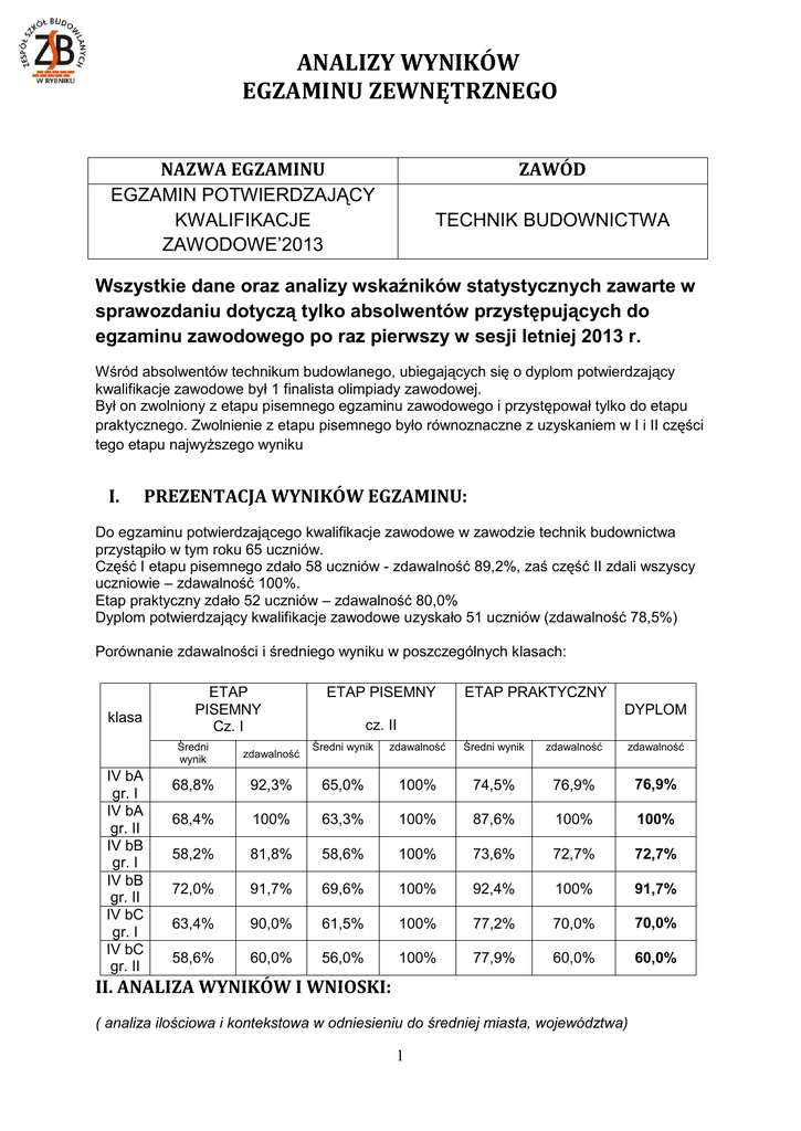 ANALIZY WYNIKÓW EGZAMINU ZEWNĘTRZNEGO NAZWA EGZAMINU EGZAMIN POTWIERDZAJĄCY KWALIFIKACJE ZAWODOWE’2013 ZAWÓD TECHNIK BUDOWNICTWA Wszystkie dane oraz analizy wskaźników statystycznych zawarte w sprawozdaniu dotyczą tylko absolwentów przystępujących do egzaminu zawodowego po raz pierwszy w sesji letniej 2013 r. Wśród absolwentów technikum budowlanego, ubiegających się o dyplom potwierdzający kwalifikacje zawodowe był 1 finalista olimpiady zawodowej. Był on zwolniony z etapu pisemnego egzaminu zawodowego i przystępował tylko do etapu praktycznego. Zwolnienie z etapu pisemnego było równoznaczne z uzyskaniem w I i II części tego etapu najwyższego wyniku I. PREZENTACJA WYNIKÓW EGZAMINU: Do egzaminu potwierdzającego kwalifikacje zawodowe w zawodzie technik budownictwa przystąpiło w tym roku 65 uczniów. Część I etapu pisemnego zdało 58 uczniów - zdawalność 89,2%, zaś część II zdali wszyscy uczniowie – zdawalność 100%. Etap praktyczny zdało 52 uczniów – zdawalność 80,0% Dyplom potwierdzający kwalifikacje zawodowe uzyskało 51 uczniów (zdawalność 78,5%) Porównanie zdawalności i średniego wyniku w poszczególnych klasach: klasa IV bA gr. I IV bA gr. II IV bB gr. I IV bB gr. II IV bC gr. I IV bC gr. II ETAP PISEMNY Cz. I Średni wynik zdawalność 68,8% ETAP PISEMNY ETAP PRAKTYCZNY DYPLOM cz. II Średni wynik zdawalność Średni wynik zdawalność zdawalność 92,3% 65,0% 100% 74,5% 76,9% 76,9% 68,4% 100% 63,3% 100% 87,6% 100% 100% 58,2% 81,8% 58,6% 100% 73,6% 72,7% 72,7% 72,0% 91,7% 69,6% 100% 92,4% 100% 91,7% 63,4% 90,0% 61,5% 100% 77,2% 70,0% 70,0% 58,6% 60,0% 56,0% 100% 77,9% 60,0% 60,0% II. ANALIZA WYNIKÓW I WNIOSKI: ( analiza ilościowa i kontekstowa w odniesieniu do średniej miasta, województwa) 1 ANALIZY WYNIKÓW EGZAMINU ZEWNĘTRZNEGO Analiza ilościowa zdawalności w kontekście województwa Zdawalność w województwie Zdawalność w szkole ETAP PISEMNY 87,21% 89,23% ETAP PRAKTYCZNY 67,38% 80,00% DYPLOM 63,74% 78,46% Wniosek: Zdawalność egzaminu potwierdzającego kwalifikacje zawodowe w naszej szkole w zawodzie technik budownictwa była znacznie wyższa od zdawalności w województwie. Analiza ilościowa średniego wyniku w kontekście województwa ETAP PISEMNY Cz. I ETAP PISEMNY Cz. II ETAP PRAKTYCZNY Średni wynik w województwie Średni wynik w szkole 62,77% 65,14% 60,69% 62,69% 75,24% 80,42% Wniosek: Średnie wyniki uzyskane w naszej szkole z poszczególnych etapów egzaminu w naszej szkole były wyższe od średnich wyników w województwie. 2 ANALIZY WYNIKÓW EGZAMINU ZEWNĘTRZNEGO Analiza jakościowa- ocena stopnia trudności w etapie pisemnym Wskaźnik łatwości zadań zestawów egzaminacyjnych etapu pisemnego (zadania od 1. do 15.) Wskaźnik łatwości zadań – zadania od 1. do 15. Numery zadań 1. 2. 3. 4. 5. 6. 7. 8. 9. 10. 11. 12. 13. 14. 15. województwo 0,76 0,35 0,48 0,46 0,41 0,45 0,75 0,33 0,68 0,73 0,81 0,88 0,40 0,34 0,55 Szkoła 0,78 0,51 0,72 0,42 0,40 0,51 0,77 0,34 0,68 0,74 0,82 0,92 0,51 0,35 0,65 Wskaźnik łatwości zadań zestawów egzaminacyjnych etapu pisemnego (zadania od 16. do 30.) Wskaźnik łatwości zadań – zadania od 16. do 30. Numery zadań 16. 17. 18. 19. 20. 21. 22. 23. 24. 25. 26. 27. 28. 29. 30. województwo 0,88 0,90 0,45 0,39 0,55 0,95 0,88 0,42 0,53 0,81 0,42 0,37 0,53 0,53 0,77 Szkoła 0,85 0,94 0,43 0,48 0,46 0,92 0,88 0,40 0,60 0,86 0,58 0,35 0,51 0,43 0,74 Wskaźnik łatwości zadań zestawów egzaminacyjnych etapu pisemnego (zadania od 31. do 45.) Wskaźnik łatwości zadań – zadania od 31. do 45. Numery zadań 31. 32. 33. 34. 35. 36. 37. 38. 39. 40. 41. 42. 43. 44. 45. województwo 0,44 0,90 0,59 0,80 0,53 0,57 0,67 0,67 0,90 0,82 0,65 0,60 0,84 0,46 0,31 Szkoła 0,49 0,85 0,75 0,77 0,54 0,65 0,65 0,72 0,89 0,74 0,69 0,71 0,88 0,51 0,40 Wskaźnik łatwości zadań zestawów egzaminacyjnych etapu pisemnego (zadania od 46. do 60.) Wskaźnik łatwości zadań – zadania od 46. do 60. Numery zadań 46. 47. 48. 49. 50. 51. 52. 53. 54. 55. 56. 57. 58. 59. 60. województwo 0,90 0,80 0,36 0,90 0,92 0,75 0,47 0,78 0,22 0,71 0,33 0,31 0,32 0,79 0,65 Szkoła 0,98 0,74 0,28 0,89 0,91 0,74 0,63 0,80 0,31 0,68 0,35 0,26 0,32 0,83 0,57 3 ANALIZY WYNIKÓW EGZAMINU ZEWNĘTRZNEGO Wskaźnik łatwości zadań zestawów egzaminacyjnych etapu pisemnego (zadania od 61. do 70.) Wskaźnik łatwości zadań – zadania od 61. do 70. Numery zadań 61. 62. 63. 64. 65. 66. 67. 68. 69. 70. województwo 0,80 0,97 0,61 0,82 0,29 0,87 0,40 0,82 0,89 0,34 Szkoła 0,80 0,95 0,58 0,80 0,34 0,86 0,48 0,88 0,85 0,51 - ocena stopnia trudności poszczególnych elementów w etapie praktycznym Wartość wskaźnika 0–0,19 Interpretacja 0,20–0,49 bardzo trudne % - owa ilość pytań w poszczególnych kategoriach trudne brak 0,50–0,69 0,70–0,89 łatwe umiarkowanie trudne 26% 26% 0,90–1 bardzo łatwe 10% 38% Wskaźnik łatwości poszczególnych elementów pracy egzaminacyjnej w etapie praktycznym w zawodzie technik budownictwa 0,99 0,99 0,83 0,75 0,74 0,64 0,62 0,75 0,90 0,78 0,76 0,80 0,85 0,91 [Wskaźnik łatwości ] 1,00 0,88 0,99 1,00 1,20 0,60 0,40 0,20 0,00 I II III IV V [Elementy pracy] 4 VI VII VIII Szkoła województwo NAZWA EGZAMINU EGZAMIN POTWIERDZAJĄCY KWALIFIKACJE ZAWODOWE’2013 ZAWÓD TECHNIK GEODETA Wszystkie dane oraz analizy wskaźników statystycznych zawarte w sprawozdaniu dotyczą tylko absolwentów przystępujących do egzaminu zawodowego po raz pierwszy w sesji letniej 2013 r. I. PREZENTACJA WYNIKÓW EGZAMINU: Do egzaminu potwierdzającego kwalifikacje zawodowe w zawodzie technik budownictwa przystąpiło w tym roku 28(27) uczniów. Część I etapu pisemnego zdało 28 uczniów - zdawalność 100%, II część zdali również wszyscy uczniowie – zdawalność 100%. Etap praktyczny zdało 21 uczniów – zdawalność 77,0% Dyplom potwierdzający kwalifikacje zawodowe uzyskało 21 uczniów (zdawalność 75,0%) II. ANALIZA WYNIKÓW I WNIOSKI: Analiza ilościowa zdawalności w 