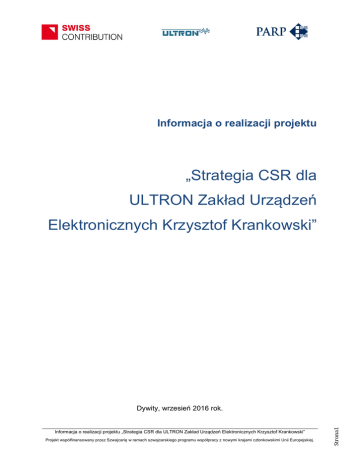 Informacja o realizacji projektu „Strategia CSR dla ULTRON Zakład Urządzeń Elektronicznych Krzysztof Krankowski” Informacja o realizacji projektu „Strategia CSR dla ULTRON Zakład Urządzeń Elektronicznych Krzysztof Krankowski” Projekt współfinansowany przez Szwajcarię w ramach szwajcarskiego programu współpracy z nowymi krajami członkowskimi Unii Europejskiej. Strona1 Dywity, wrzesień 2016 rok. Wprowadzenie - opis zrealizowanego projektu Projekt pn.: „Strategia CSR dla ULTRON Zakład Urządzeń Elektronicznych Krzysztof Krankowski” polegał na opracowaniu i wdrożeniu strategii Społecznej Odpowiedzialności Biznesu (CSR) w sposób kompleksowy i trwały, której założenia stanowiły jednocześnie cele szczegółowe projektu. Projekt był współfinansowany przez Szwajcarię w ramach szwajcarskiego programu współpracy z nowymi krajami członkowskimi Unii Europejskiej. Dzięki realizacji projektu wdrożyliśmy strategię Społecznej Odpowiedzialności Biznesu (CSR) w 3 obszarach (środowisko, relacje z pracownikami, relacje z otoczeniem), bowiem tylko takie podejście zostało ocenione jako adekwatne do zagadnień odpowiedzialności społecznej. Projekt swym zasięgiem zapewnił objęcie wszystkich interesariuszy, w tym: takie kategorie podmiotów zewnętrznych jak: a) kontrahenci (potencjalni klienci, dostawcy, odbiorcy), b) przedstawiciele grup społeczności lokalnej, c) władz administracyjnych, d) instytucje publiczne, e) organizacje pozarządowe, oraz f) wszyscy pracownicy firmy ULTRON. Zasięg oddziaływania zrealizowanego projektu to Polska, kraje europejskie, kraje na świecie poza Europą gdzie funkcjonują wyroby Ultron. Celem opracowanej strategii było wdrożenie firmy ULTRON w proces kształtowania warunków do przekształcenia społeczeństwa (firmy i jej otoczenia) – w myśl zasady wynikającej z Raportu Narodów Zjednoczonych o Rozwoju Społecznym – w społeczeństwo ekonomicznie efektywne, społecznie sprawiedliwe i ekologicznie trwałe. Ponadto dzięki realizacji projektu firma ULTRON stała się przyjazna dla środowiska naturalnego, co gwarantuje partnerski dialog z pracownikami i kontrahentami, a także jest zaangażowaną w zwiększenie poziomu życia lokalnej Informacja o realizacji projektu „Strategia CSR dla ULTRON Zakład Urządzeń Elektronicznych Krzysztof Krankowski” Projekt współfinansowany przez Szwajcarię w ramach szwajcarskiego programu współpracy z nowymi krajami członkowskimi Unii Europejskiej. Strona2 społeczności. Osiągnięte cele szczegółowe w ramach zrealizowanego projektu Osiągnięte cele szczegółowe projektu dotyczyły trzech obszarów działalności przedsiębiorstwa ULTRON: 1. ŚRODOWISKO. 2. RELACJE Z PRACOWNIKAMI. 3. RELACJE Z OTOCZENIEM. W każdym z wyżej wymienionych obszarów były następujące: Ad. 1. Obszar Środowisko Przedsiębiorstwo ULTORN nie legitymowało się do tej pory wdrożonymi standardami pracy i produkcji istotnymi z punktu widzenia odbiorców, mimo że przestrzega wdrożonych zasad i przepisów dbania o środowisko naturalne, to nie miała spisanych wewnętrznych standardów określających zasady dbałości o środowisko. Dzięki realizacji projektu „Strategia CSR dla ULTRON Zakład Urządzeń Elektronicznych Krzysztof Krankowski” wdrożenie wymagań międzynarodowej normy systemu zarządzania środowiskiem wg najnowszego standardu ISO 14001:2015 „System zarządzania środowiskiem” zapewniło osiągnięcie światowych standardów w zakresie ochrony środowiska. Ocenę w zakresie spełniania wymagań normy ISO 14001:2015 przeprowadziła brytyjska, akredytowana jednostka certyfikująca ISOQAR Informacja o realizacji projektu „Strategia CSR dla ULTRON Zakład Urządzeń Elektronicznych Krzysztof Krankowski” Projekt współfinansowany przez Szwajcarię w ramach szwajcarskiego programu współpracy z nowymi krajami członkowskimi Unii Europejskiej. Strona3 – numer przyznanego certyfikatu: 5226. Osiągnięte cele szczegółowe w ramach zrealizowanego projektu - ciąg dalszy Ad. 2. Obszar Relacje z pracownikami Projekt, ze względu na specyfikację działalności ULTRON zakładał aktualizację wymagań do standardów normy ISO 9001:2015 „System zarządzania jakością”, ze szczególną uwagą na określenie kontekstu organizacji, stron zainteresowanych oraz aspekty bezpieczeństwa i higieny pracy. Uzyskaliśmy pozytywną ocenę i rekomendację brytyjskiej, akredytowanej jednostki certyfikującej ISOQAR – numer przyznanego certyfikatu: 5226. Ponadto w ramach realizacji projektu uwzględniono wymagania standardu Społecznej Odpowiedzialności Biznesu AA1000, który został wypracowany przez Instytut na rzecz Społecznej i Etycznej Odpowiedzialności (Institute of Social and Ethical AccountAbility), włączający kwestie społeczne i etyczne do zarządzania strategicznego organizacji i jej działalności. Ze względu na wielostronność standardu AA1000, projekt zakładał przygotowanie się firmy do jego wdrożenia i dzięki temu przedsiębiorstwo ULTRON posiada system oceny pracowników jak również system motywacji. Dzięki temu Informacja o realizacji projektu „Strategia CSR dla ULTRON Zakład Urządzeń Elektronicznych Krzysztof Krankowski” Projekt współfinansowany przez Szwajcarię w ramach szwajcarskiego programu współpracy z nowymi krajami członkowskimi Unii Europejskiej. Strona4 osiągnięto poprawę zarządzania personelem i kwestii bezpieczeństwa i higieny pracy. Osiągnięte cele szczegółowe w ramach zrealizowanego projektu - ciąg dalszy 3. Obszar Relacje z otoczeniem Dzięki wypracowanej Strategii Odpowiedzialności Biznesowej sformułowano kierunki i zasady działalności społecznej, co objawia się tym, że ULTRON efektywnie bierze udział w życiu lokalnej społeczności oraz w życiu społecznym poprzez wspomaganie/wspieranie działalności pożytku publicznego. Ponadto nawiązaliśmy współpracę z organizacją pozarządową, za