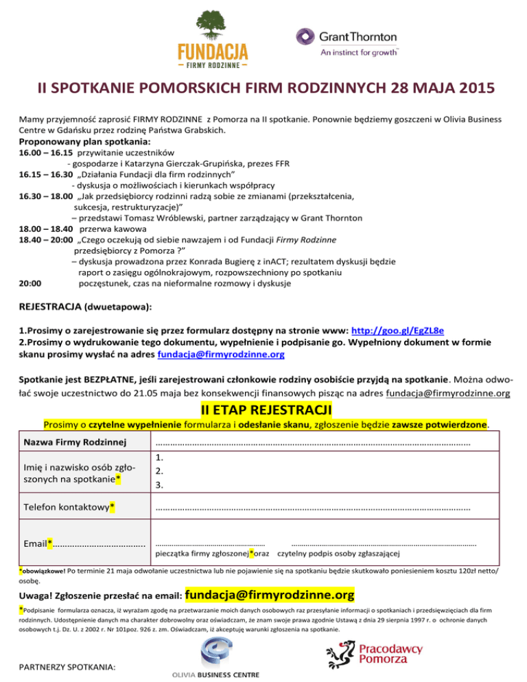 II SPOTKANIE POMORSKICH FIRM RODZINNYCH 28 MAJA 2015 Mamy przyjemność zaprosić FIRMY RODZINNE z Pomorza na II spotkanie. Ponownie będziemy goszczeni w Olivia Business Centre w Gdańsku przez rodzinę Państwa Grabskich. Proponowany plan spotkania: 16.00 – 16.15 przywitanie uczestników - gospodarze i Katarzyna Gierczak-Grupińska, prezes FFR 16.15 – 16.30 „Działania Fundacji dla firm rodzinnych” - dyskusja o możliwościach i kierunkach współpracy 16.30 – 18.00 „Jak przedsiębiorcy rodzinni radzą sobie ze zmianami (przekształcenia, sukcesja, restrukturyzacje)” – przedstawi Tomasz Wróblewski, partner zarządzający w Grant Thornton 18.00 – 18.40 przerwa kawowa 18.40 – 20:00 „Czego oczekują od siebie nawzajem i od Fundacji Firmy Rodzinne przedsiębiorcy z Pomorza ?” – dyskusja prowadzona przez Konrada Bugierę z inACT; rezultatem dyskusji będzie raport o zasięgu ogólnokrajowym, rozpowszechniony po spotkaniu 20:00 poczęstunek, czas na nieformalne rozmowy i dyskusje REJESTRACJA (dwuetapowa): 1.Prosimy o zarejestrowanie się przez formularz dostępny na stronie www: http://goo.gl/EgZL8e 2.Prosimy o wydrukowanie tego dokumentu, wypełnienie i podpisanie go. Wypełniony dokument w formie skanu prosimy wysłać na adres [email protected] Spotkanie jest BEZPŁATNE, jeśli zarejestrowani członkowie rodziny osobiście przyjdą na spotkanie. Można odwołać swoje uczestnictwo do 21.05 maja bez konsekwencji finansowych pisząc na adres [email protected] II ETAP REJESTRACJI Prosimy o czytelne wypełnienie formularza i odesłanie skanu, zgłoszenie będzie zawsze potwierdzone. Nazwa Firmy Rodzinnej ………………………………………………………………………………………………………………… Imię i nazwisko osób zgłoszonych na spotkanie* 1. 2. 3. Telefon kontaktowy* ………………………………………………………………………………………………………………… Email*……………………………….. ……………………………………………… ………………………………………………………………………………. pieczątka firmy zgłoszonej*oraz czytelny podpis osoby zgłaszającej *obowiązkowe! Po terminie 21 maja odwołanie uczestnictwa lub nie pojawienie się na spotkaniu będzie skutkowało poniesieniem kosztu 120zł netto/ osobę. Uwaga! Zgłoszenie przesłać na email: [email protected] *Podpisanie formularza oznacza, iż wyrażam zgodę na przetwarzanie moich danych osobowych raz przesyłanie informacji o spotkaniach i przedsięwzięciach dla firm rodzinnych. Udostępnienie danych ma charakter dobrowolny oraz oświadczam, że znam swoje prawa zgodnie Ustawą z dnia 29 sierpnia 1997 r. o ochronie danych osobowych t.j. Dz. U. z 2002 r. Nr 101poz. 926 z. zm. Oświadczam, iż akceptuję warunki zgłoszenia na spotkanie. PARTNERZY SPOTKANIA: