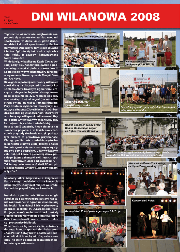 Tekst i zdjęcia: Jacek Sasin DNI WILANOWA 2008 Tegoroczne wilanowskie świętowanie rozpoczęło się w sobotę 6 września zawodami sportowymi w klubie Sinus, gdzie dzieci, młodzież i dorośli rywalizowali o Puchar Burmistrza Dzielnicy w turniejach squasha i tenisa. Zgłosiło się tak wielu chętnych z całej Polski, że zawody kontynuowano także nazajutrz. W niedzielę, w kaplicy na Kępie Zawadowskiej odbył się „Koncert królewski”, a podczas niego muzyka i pieśni z czasów Jana III Sobieskiego (w tym także utwory tureckie) w wykonaniu Stowarzyszenia Muzyki Dawnej Ars Nova. Kilka godzin później mieszkańcy Wilanowa spotkali się na placu przed dzwonnicą kościoła św. Anny. Tu odbyło się pierwsze, uroczyste odegranie hejnału, skomponowanego specjalnie na 325. rocznicę odsieczy wiedeńskiej. Hejnał zagrał (na wszystkie strony świata) na trąbce Tomasz Kirszling. Przy ostatnim wykonaniu towarzyszyli mu muzycy z Bractwa Złotej Blachy. Utwór bardzo podobał się wilanowianom, którzy swą aprobatę wyrazili gromkimi brawami. Hejnał będzie wykonywany w Wilanowie, przy każdej rocznicy wiktorii wiedeńskiej. Była to część września, kiedy cieszyła nas słoneczna pogoda, a w takich okolicznościach przyrody słuchanie muzyki pod gołym niebem to prawdziwa przyjemność. Dlatego publiczność z radością wysłuchała koncertu Bractwa Złotej Blachy, a także tłumnie zjawiła się na wieczornym występie Ewy Bem z zespołem. Udany w każdym calu (takcie) koncert pierwszej damy polskiego jazzu zakończył cykl letnich spotkań muzycznych „Jazz pod gwiazdami”. Także tego wieczoru, w Galerii SD odbyło się zakończenie wystawy „Wilanów oczami artystów”. „Czarodziejski flet” w ogrodzie biblioteki Nieustraszeni zdobywcy pucharów (Klub SINUS) Każdy mógł dostać świątecznego lizaka Zawodnicy rywalizujący o Puchar Burmistrza Wilanowa w squashu Hejnał, skomponowany przez Kamila Koseckiego zagrał na trąbce Tomasz Kirszling Wilanowianie przyjęli brawami pierwsze wykonanie hejnału na 325. rocznicę odsieczy wiedeńskiej „Koncert Królewski” w kaplicy na Kępie Zawadowskiej Miłośnicy Alicji Majewskiej i Zbigniewa Korcza mogli podziwiać ich na koncercie plenerowym, który miał miejsce we środę, 9 września, przy ul. Sytej na Zawadach. Najmłodsza publiczność Wilanowa mogła spotkać się z bajkowymi postaciami na scenie rozstawionej w ogródku wilanowskiej biblioteki. Tam dzieci i ich wychowawcy obejrzeli spektakl pt. „Czarodziejski flet”. Po jego zakończeniu na dzieci czekały słodkie upominki w postaci lizaków, które dzieciom rozdawali burmistrzowie dzielnicy i pracownicy biblioteki. Wieczorem, na tej samej scenie, miłośnicy dobrego humoru spotkali się z kabaretem „Koń Polski”. Salwy braw, obolałe od śmiechu policzki i brzuchy widzów, załzawione oczy - to efekt obecności koszalińskich kabareciarzy w Wilanowie. Kabaret Koń Polski Ewa Bem z zespołem Kabaret Koń Polski parodiuje zaspół Ich Troje Niewiele jest miejsc na ziemi, gdzie w tak krótkim czasie powiedziano tyle pięknych słów o książce, o jej znaczeniu w rozwoju wyobraźni, wrażliwości i osobowości człowieka. Takim miejscem 9 września była Biała Sala wilanowskiego pałacu. Tu swoją kulminację miały obchody 50lecia Biblioteki Publicznej w Wilanowie. Były nagrody, upominki, ciekawe odczyty o książce i roli w jej upowszechnianiu (o rozkochiwaniu w książce) jaką pełni biblioteka przy ul. Radosnej. Specjalnie nakręcony film przedstawił dokonania placówki i przypomniał jej barwną historię. Dni Wilanowa organizowane są we wrześniu dla uczczenia zwycięstwa Jana III Sobieskiego pod Wiedniem (1683 r.). Tradycyjnie, wśród szeregu imprez rozrywkowych, mają miejsce także historyczne pokazy i debaty. Osobie polskiego króla poświęcona była debata „Dole i niedole Jana Sobieskiego”, która w deszczowy wieczór ściągnęła do wilanowskiej pijalni czekolady miłośników spotkań z historią. Wzięli w niej udział znawcy tematu: prof. Dariusz Kołodziejczyk, prof. Wiesław Majewski i prof. Mirosław Nagielski. Wiktorię wiedeńską upamiętniło także Muzeum Pałac w Wilanowie. 10 września dyrektor muzeum, Paweł Jaskanis, dokonał uroczystego otwarcia wystawy „Król Jan III i towarzysze broni”. Oglądać ją można w pałacowych wnętrzach do 11 listopada br. W uzupełnieniu historycznego tła wilanowskiego święta, w niedzielę 14 września w sali widowiskowo-sportowej przy ul. Gubinowskiej odbyła się projekcja filmu „Na odsiecz Wiedniowi”. Pogoda nie dopisała, ale to nie zniechęciło wilanowian do udziału we wspólnej zabawie Uroczystości z okazji 50-lecia wilanowskiej biblioteki; Biała Sala Muzeum Pałac w Wilanowie Debata historyczna w pijalni czekolady Pamiątkowy ceryfikat od Zarządu Dzielnicy Wilanów dla wilanowskiej biblioteki „Król Jan III i towarzysze broni” - otwarcie wystawy Jan III wśród zwiedzajacych Tu królewskie korony robili dla siebie mali królowie i małe królewny Wszechobecny Kubuś Puchatek odwiedził także Skrzydła husarskie namiot wilanowskiej - wilanowski hit sezonu 2008 biblioteki Najbardziej oblegany był „kącik” zabaw dziecięcych z wielkimi nadmuchanymi zamkami, trampolinami, krzywymi lustrami, pociągiem, karuzelą i nieodzowną – przy takich piknikach – watą cukrową. Dzieci mogły spotkać się z wszędobylskim Kubusiem Puchatkiem, zrobić sobie z papieru królewską koronę lub skrzydła husarskie, a także sprawdzić swoje zdolności artystyczne przy malowaniu obrazków bądź puszczaniu baniek mydlanych. Odważniejsi próbowali swoich sił w rzucie włócznią, fechtunku oraz strzelaniu z muszkietu. W jednym z namiotów bita była okazyjna moneta, a ochotnicy, których nie brakowało, mogli bić ją własnoręcznie, uderzając ciężkim młotem w stemple i metalowy krążek. Gościem specjalnym namiotu biblioteki wilanowskiej był Bohdan Butenko, r
