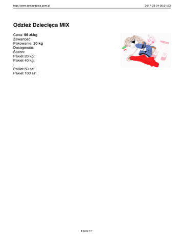 http://www.taniaodziez.com.pl 2017-03-04 06:31:23 Odzież Dziecięca MIX Cena: 56 zł/kg Zawartość: Pakowanie: 20 kg Dostępność: Sezon: Pakiet 20 kg: Pakiet 40 kg: : Pakiet 50 szt.: Pakiet 100 szt.: Strona 1/1