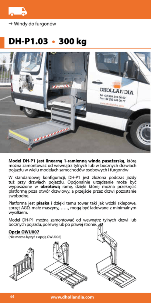 Windy do furgonów DH-P1.03 • 300 kg Model DH-P1 jest linearną 1-ramienną windą pasażerską, którą można zamontować od wewnątrz tylnych lub w bocznych drzwiach pojazdu w wielu modelach samochodów osobowych i furgonów W standardowej konfiguracji, DH-P1 jest złożona podczas jazdy tuż przy drzwiach pojazdu. Opcjonalnie urządzenie może być wyposażone w obrotową ramę, dzięki której można przekręcić platformę poza otwór drzwiowy, a przejście przez drzwi pozostanie swobodne. Platforma jest płaska i dzięki temu towar taki jak wózki sklepowe, sprzęt AGD, małe maszyny,……, mogą być ładowane z minimalnym wysiłkiem. Model DH-P1 można zamontować od wewnątrz tylnych drzwi lub bocznych pojazdu, po lewej lub po prawej stronie. Opcja OWU007 (Nie można łączyć z opcją OWU006) DXF/GEO: 44 www.dhollandia.com 70 Podstawowy model, prosty i uniwersalny OWU006 w pozycji do jazdy zamontowana z prawej strony Udźwig windy UDŹWIG PC OWU006 w pozycji roboczej zamontowana z prawej strony Masa Wymiary montażowe [zobacz str. 15] MU Standard OWU006 300 kg 500 mm 1.5 kNm 1260 mm 123 kg 139 kg RAMIĘ 600 700 K max. 700 950 Specyfikacja techniczna Rama windy • 1 ramię podnoszące • Standard = stała rama: zamknięta platforma stoi w świetle drzwi • Opcja OWU006 = rama obrotowa: w pozycji do jazdy platforma może być złożona na boczną ścianę zabudowy Siłowniki 1 siłownik podnoszenia Rodzaj pracy Płaska platforma, jazda poziomami Materiał platformy Stalowa rama + aluminiowe profile Wyposażenie platformy • Automatyczny roll-stop na końcu platformy • Automatyczny mostek i ochrona stóp na początku platformy Standardowa długość platformy • 1080 - 1170 - 1260 mm • Dłuższe platformy na życzenie jako opcja (OWP002.L) Standardowa szerokość platformy 820 standard / 720 opcja (OWP002.W) Standardowy sterownik [zobacz str. 10] OAE001 Standardowe wykończenie ramy windy Protection PLUS [OAT102] Skorzystaj ze wskazówek zamieszczonych na stronach 14-15 45