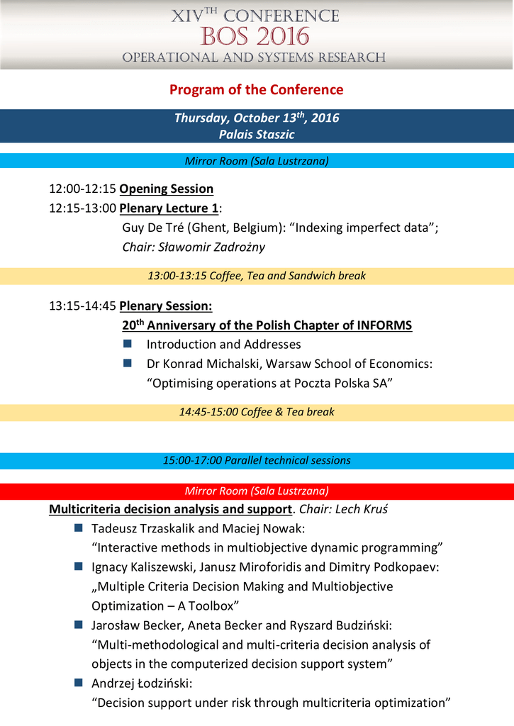 Program of the Conference Thursday, October 13th, 2016 Palais Staszic Mirror Room (Sala Lustrzana) 12:00-12:15 Opening Session 12:15-13:00 Plenary Lecture 1: Guy De Tré (Ghent, Belgium): “Indexing imperfect data”; Chair: Sławomir Zadrożny 13:00-13:15 Coffee, Tea and Sandwich break 13:15-14:45 Plenary Session: 20th Anniversary of the Polish Chapter of INFORMS Introduction and Addresses Dr Konrad Michalski, Warsaw School of Economics: “Optimising operations at Poczta Polska SA” 14:45-15:00 Coffee & Tea break 15:00-17:00 Parallel technical sessions Mirror Room (Sala Lustrzana) Multicriteria decision analysis and support. Chair: Lech Kruś Tadeusz Trzaskalik and Maciej Nowak: “Interactive methods in multiobjective dynamic programming” Ignacy Kaliszewski, Janusz Miroforidis and Dimitry Podkopaev: „Multiple Criteria Decision Making and Multiobjective Optimization – A Toolbox” Jarosław Becker, Aneta Becker and Ryszard Budziński: “Multi-methodological and multi-criteria decision analysis of objects in the computerized decision support system” Andrzej Łodziński: “Decision support under risk through multicriteria optimization” Skłodowska-Curie room (Sala Marii Skłodowskiej Curie) Planning, scheduling and resource management. Chair: Krzysztof Szkatuła W. Ogryczak, T. Śliwiński, J. Hurkała, M. Kaleta, P. Pałka, B. Kozłowski: “Large-scale periodic routing problem for supporting planning of mobile personnel tasks” David Chen, Rowan Wang, Zhenzhen Yan, Saif Benjaafar and Oualid Jouini: “Appointment systems under service level constraints” Maciej Michalik and Tadeusz Witkowski: “An imperialist competitive algorithm for the job-shop scheduling problem” Piotr Modliński and Tadeusz Witkowski: “Solving flexible job-shop problem by greedy-brutal algorithm” Dariusz Banaś, Jerzy Michnik and Krzysztof S. Targiel: “System modelling and control of organization business processes characteristics for decision making support” 17:00-17:15 Coffee & Tea break Mirror Room (Sala Lustrzana) 17:15-18:00 Plenary Lecture 2: Andrzej Piotr Wierzbicki: “Positive feedback and catastrophic forecasts”. Chair: Jan W. Owsiński 18:00-18:45 Plenary Lecture 3: Helena Lindskog: “Time, money & attitudes towards globalization - results of comparative study in Sweden and Poland”. Chair: Janusz Kacprzyk 19:00-21:00 Welcome reception (upper floor of Palais Staszic) Friday, October 14th, 2016 Building of the Systems Research Institute 9:00-9:45 Room 200 Plenary Lecture 3: Tadeusz Baczko: “The Microeconomic Foundations of Innovation Policy”. Chair: Andrzej Kałuszko 9:45-10:00 Coffee & Tea break 10:00-12:30 Parallel technical sessions Room 113 Analysing and modelling social and economic phenomena. Chair: Jan Gadomski Lech Kruś and Irena Woroniecka-Leciejewicz: “Analysis of strategies in a monetary-fiscal game. The case of Poland” Marek Antosiewicz: “Heterogeneous DSGE model with searchand-matching frictions” Andrzej Jarynowski and Andrzej Buda: “Diffusion paths between product life-cycles in European phonographic market” Przemysław Dominiak, Jacek Mercik and Agata Szymańska: “On intellectual capital flows modelling” Rafał Bieńkowski, Krzysztof Leśniewski and Weronika Radziszewska: “Spatial data analysis in archaeology: computeraided selection of priority location for archaeological survey” Room 116 Networks, infrastructure, energy. Chair: Jan Studziński Jolanta Jarnicka and Zbigniew Nahorski: “Estimation of means in a bivariate discrete-time process” Grzegorz Zalewski and Włodzimierz Ogryczak: “Network dimensioning with minimum unfairness cost for efficiency” Weronika Radziszewska, Zbigniew Nahorski and Jörg Verstraete: “Microgrids and energy management systems in the Smart City context” Piotr Sapiecha, Jan W. Owsiński, Krzysztof Sęp et al.: “The mobile client-server application using the routing algorithms for the shortest commutation time in public transport” 12:30-13:00 Lunch (cafeteria downstairs) Papers presented in the joint sessions with IWIFSGN workshop: Jan W. Owsiński, Jarosław Stańczak, Aleksy Barski and Krzysztof Sęp: “The Main Quickest Centre Access Hubs in a Big City. The Evolutionary Approach” (session B, 13:05-13:25) Leszek Klukowski: “Determining the estimate of the equivalence relation for moderate and large size sets” (session E, 17:00-17:20) Hanna Borzęcka: „Linguistic summaries in fuzzy OLAP Cubes” (session F, 16:40-17:40)