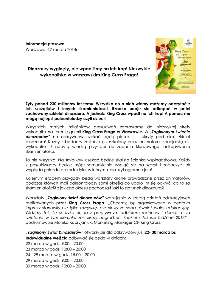 Informacja prasowa Warszawa, 17 marca 2014r. Dinozaury wyginęły, ale wpadliśmy na ich trop! Niezwykłe wykopalisko w warszawskim King Cross Praga! Żyły ponad 230 milionów lat temu. Wszystko co o nich wiemy możemy odczytać z ich szczątków i innych skamieniałości. Rzadko udaje się odkopać w pełni zachowany szkielet dinozaura. A jednak: King Cross wpadł na ich trop! A pomóc mu mogą najlepsi paleontolodzy czyli dzieci! Wszystkich małych miłośników poszukiwań zapraszamy do niezwykłej strefy wykopalisk na terenie galerii King Cross Praga w Warszawie. W „Zaginionym świecie dinozaurów” na odkrywców czekać będą piasek i .....ukryty pod nim szkielet dinozaura! Każdy z badaczy zostanie przeszkolony przez animatora- specjalistę ds. wykopalisk. Z nabytą wiedzą przystąpi do zadania kluczowego: odkopywania skamieniałości. To nie wszystko! Na śmiałków czekać będzie skalista ścianka wspinaczkowa. Każdy z poszukiwaczy będzie mógł samodzielnie wspiąć się na szczyt i zobaczyć jak wygląda gniazdo pterodaktyla, w którym ktoś ukrył ogromne jajo! Kolejnym etapem przygody będą warsztaty arche prowadzone przez animatorów, podczas których mali paleontolodzy sami określą co udało im się odkryć: co to za skamieniałości? z jakiego okresu pochodzą? jaki to gatunek dinozaura? Warsztaty „Zaginiony świat dinozaurów” wpisują się w szereg działań edukacyjnych realizowanych przez King Cross Praga. „Chcemy, by organizowane w centrum imprezy stanowiły nie tylko rozrywkę, ale niosły ze sobą również walor edukacyjny. Widzimy też, że spotyka się to z pozytywnym odbiorem rodziców i dzieci, a za działania w tym kierunku zostaliśmy nagrodzeni Znakiem Jakości KidZone 2013” podsumowuje Monika Kupryjaniuk, Marketing Manager CH King Cross. „Zaginiony Świat Dinozaurów” otworzy się dla odkrywców już 22- 30 marca br. Indywidualne wejścia odbywać się będą w dniach: 22 marca w godz. 9:00 – 20:00 23 marca w godz. 10:00 – 20:00 24 - 28 marca w godz. 15:00 – 20:00 29 marca w godz. 9:00 – 20:00 30 marca w godz. 10:00 – 20:00 Wejścia dla grup zorganizowanych – przedszkoli, szkół, grup zajęciowych będą możliwe od poniedziałku 24 marca do piątku 28 marca w godzinach 9:30 – 14:30, po uprzedniej rezerwacji miejsca pod numerem telefonu +48 518 024 687. Lokalizacja: CH King Cross Praga, ul. Jubilerska 1/3, Warszawa Do „Zaginionego Świata Dinozaurów” wstęp jest bezpłatny! Więcej informacji o projekcie: www.zaginionyswiatdinozaurow.pl Centrum Handlowe King Cross Praga Centrum Handlowe King Cross Praga zostało otwarte w 1996 roku na Pradze Południe jako pierwsze centrum prawobrzeżnej Warszawy i jedno z pierwszych w stolicy. Położone jest w bezpośredniej bliskości ważnego węzła komunikacyjnego prowadzącego z centrum miasta w kierunku Lublina i Terespola. Powierzchnia centrum wynosi blisko 27 tys. m kw., z czego znaczną część zajmuje hipermarket Real,-. Do dyspozycji Klientów, King Cross Praga oddaje ponad 70 punktów usługowohandlowych, dzięki którym możliwe staje się załatwienie wielu potrzeb codziennego życia w jednym miejscu. Wśród kluczowych najemców centrum znajdują się m.in. RTV Euro AGD, Sephora, CCC, Reserved, Tchibo, Camaieu, Orsay czy Vision Express. CH King Cross Praga zarządzane jest przez firmę DTZ. CH King Cross Praga: www.KingCrossPraga.pl ; www.facebook.com/KingCrossPraga DTZ DTZ jest jedną z największych na świecie spółek świadczących usługi na rynku nieruchomości. Firma dostarcza klientom biznesowym, najemcom powierzchni komercyjnych oraz inwestorom kompleksowych usług, w skład których wchodzą: doradztwo inwestycyjne, pośrednictwo w wynajmie powierzchni handlowych, biurowych i magazynowych, property i facility management, doradztwo inwestycyjno-budowlane, wyceny, asset management. Firma zatrudnia 27 000 osób, które pracują w 225 oddziałach zlokalizowanych na terenie 45 krajów. Więcej informacji znajduje się na stronie www.dtz.com. Kontakt dla mediów: [email protected]