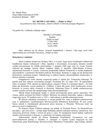 Ks. Marek Pluta Sesja Odpowiedzialnych END Kazimierz Biskupi – 2007 KS. HENRI CAFFAREL – „Pójdź za Mną” (na podstawie Jean Allemand, „Henri Caffarel. Człowiek przejęty Bogiem”) Na grobie Ks. Caffarela widnieje napis: HENRI CAFFAREL Kapłan „Pójdź za mną” 2.VIII.1903 19.IV.19030 18.IX.1996 Daty odnoszą się do chrztu, święceń kapłańskich i śmierci. Całe jego życie było odpowiedzią na wezwanie Chrystusa: „Pójdź za mną”. Dzieciństwo i młodość Henri Caffarel urodził się 30 lipca 1903, w Lyonie. Jego ojciec Ferdinand Caffarel był handlarzem tkanin wełnianych i filcu. Zgodnie z ówczesnym zwyczajem, dziecko zostało szybko przyniesione do źródła chrzcielnego: 2 sierpnia 1903 jego wuj, ks. Louis Venard, ochrzcił go nadając imiona Henri Auguste Marie w bazylice Saint-Martin d’Ainay, najstarszym kościele w Lyonie. Cioteczny pradziadek Gabriel Venard był w liczbie kapłanów męczenników z pontonów Rochefort podczas Rewolucji. Rodzina w ciągu stu lat dostarczyła Kościołowi czternastu księży. Odmalowuje to dobrze bardzo chrześcijańskie środowisko, w którym dziecko wzrastało. Osiągnąwszy wiek szkolny rozpoczął naukę w szkole Św. Franciszka Salezego. W parafii pod tym samym wezwaniem przyjął I Komunię Św. 22 maja 1911. W poprzednim roku, 8 sierpnia 1910, ukazał się dekret Quam singulari Piusa X o komunii dzieci. „To była łaska dla Kościoła, wyzna później ks. Caffarel, a także dla mnie. Jeśli Eucharystia tworzy Kościół, to tworzy także świętych w Kościele. Dekretem Piusa X źródło eucharystyczne zostało szeroko otwarte dla spragnionego ludu chrześcijańskiego”. Młody Henri kontynuuje naukę w szkole prowadzonej przez ojców marystów. Nie wiemy, jakim uczniem był Henri Caffarel. Możemy się jedynie domyślać, sądząc z dalszego ciągu jego życia. W każdym razie w 1921 r. zdał maturę w profilu matematycznym. W okresie szkolnym uczestniczy w swojej parafii Św. Jana w kółkach zainteresowań oraz w zebraniach i konferencjach Stowarzyszenia Młodzieży Katolickiej. W tym czasie bierze udział w rekolekcjach głoszonych przez marystę, o. Plazenet. Wówczas rodzi się pierwsza myśl o kapłaństwie. Po maturze Henri Caffarel zapisuje się jednak na Wydział Prawa. Po błyskotliwym początku – jak sam mówi – zostaje nagle dotknięty jakimś rodzajem niemocy umysłowej. Jest zmuszony przerwać studia i wrócić do pracy u ojca. W następnych latach będzie wędrował między uniwersytetem a domem, w zależności od stopnia zmęczenia. Jednocześnie chodzi do Domu Studentów Katolickich. Uczestniczy też, pod przewodnictwem jezuity o. Roullet, w „misjach” w rejonie Lyonu mających na celu odnowienie grup Katolickiego Stowarzyszenia Młodzieży Francuskiej. Jego kolega szkolny 1 François Varillon wspomina: „W niedziele wyjeżdżaliśmy na ewangelizację, były to dla mnie narodziny do życia apostolskiego”. Były nimi także dla Henri Caffarela. W tych latach odbywa też rekolekcje pod przewodnictwem o. Roullet i stawia sobie pytanie, czy nie wstąpić do jezuitów. Powie później z humorem: „W rzeczywistości bardzo szybko zrozumiałem, że z moją głową w kawałkach byłem dla Jezuitów zdyskwalifikowany”. Rok 1923 jest dla Henri Caffarela decydujący. To co było wezwaniem mniej lub bardziej jasnym i szukaniem po omacku drogi życia, krystalizuje się wówczas w definitywne powołanie, ponieważ w marcu 1923 młody człowiek „spotyka” Chrystusa. Mamy proste zwierzenie o tym wydarzeniu uczynione pewnemu dziennikarzowi: „Gdy miałem dwadzieścia lat, Jezus Chrystus w jednej chwili stał się dla mnie Kimś. O, nic szczególnego. Owego odległego marcowego dnia zrozumiałem, że jestem kochany i że kocham, i że od tej chwili ta miłość między Nim a mną będzie na całe życie. Wszystko zostało rozstrzygnięte”. Jeszcze jaśniej mówi o tym w „pożegnalnej konferencji” do odpowiedzialnych Sektorów Equipes Notre-Dame w 1973 r.: „Wspominam początki (Equipes Notre-Dame). W istocie, początki sięgają znacznie dalej niż te 35 lat. Sięgają 50 lat. Dlatego, że w marcu 1923, dokładnie 50 lat temu, pewnego dnia dotarła do mnie świadomość istnienia Chrystusa, życia Chrystusa, miłości Chrystusa, relacji miłości między Chrystusem i człowiekiem, która stanowi treść życia chrześcijańskiego, to było dla mnie jak linia podziału wód. Dla mnie życie dzieli się na przed marcem 1923 i po marcu 1923. To mnie naznaczyło i od tego dnia miałem tylko jedno pragnienie: wejść samemu jak najgłębiej w tę intymną więź z Chrystusem i to drugie pragnienie: doprowadzić do tego innych, ponieważ dla mnie było to najważniejsze w życiu, dało mi radość życia, urok życia, energię życia. Nie mogę nie życzyć również innym tego spotkania z żyjącym Chrystusem, tego odkrycia, że Bóg jest miłością.” Czy jest możliwe dokładniejsze wyjaśnienie tego „spotkania”, które tyle znaczyło dla Henri Caffarela i zaważyło na reszcie jego życia? W 1974 r. publikuje numer specjalny Cahiers sur l’oraison: Dieu, ils l’ont rencontré (Zeszyty o modlitwie: Bóg, oni Go spotkali). Ten numer zawiera siedemnaście wstrząsających świadectw. Ks. Caffarel, który we wprowadzeniu podkreśla to, co w każdym jest wyjątkowe, następnie podejmuje próbę interpretacji, w której zbiera ich rysy wspólne. Czy nie można się tu dopatrywać echa jego własnego doświadczenia? Podkreśla nieprzewidywalność wydarzenia - to Bóg ma inicjatywę; jego piorunującą nagłość, która zapisuje w duszy liniami ognia najmniejsze szczegóły „spotkania”; jego naturę - osobiste spotkanie z Kimś. Kim jest ten Ktoś? Zebrane świadectwa nie są zawsze precyzyjne, mówią bądź o Bogu, bądź o Chrystusie. Dla Henri Caffarela był to bez wątpienia Chrystus. Chrystus, który proponuje „swoją miłość lub dokładniej, wzajemność w miłości