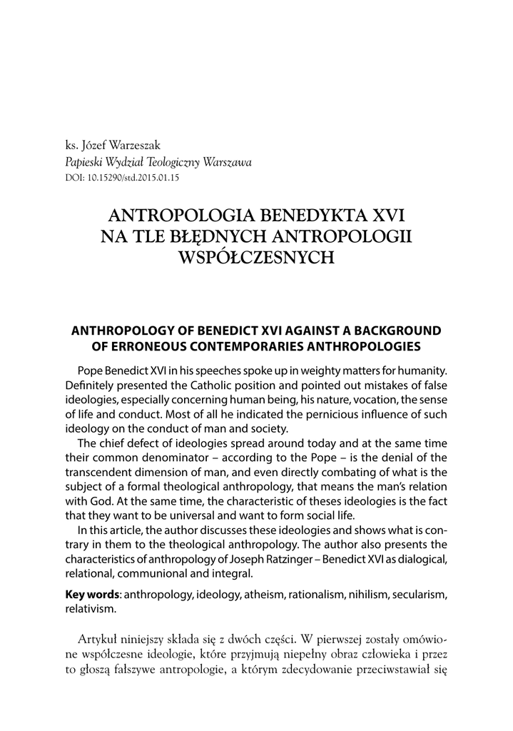 ks. Józef Warzeszak Papieski Wydział Teologiczny Warszawa DOI: 10.15290/std.2015.01.15 ANTROPOLOGIA BENEDYKTA XVI NA TLE BŁĘDNYCH ANTROPOLOGII WSPÓŁCZESNYCH ANTHROPOLOGY OF BENEDICT XVI AGAINST A BACKGROUND OF ERRONEOUS CONTEMPORARIES ANTHROPOLOGIES Pope Benedict XVI in his speeches spoke up in weighty matters for humanity. Definitely presented the Catholic position and pointed out mistakes of false ideologies, especially concerning human being, his nature, vocation, the sense of life and conduct. Most of all he indicated the pernicious influence of such ideology on the conduct of man and society. The chief defect of ideologies spread around today and at the same time their common denominator – according to the Pope – is the denial of the transcendent dimension of man, and even directly combating of what is the subject of a formal theological anthropology, that means the man’s relation with God. At the same time, the characteristic of theses ideologies is the fact that they want to be universal and want to form social life. In this article, the author discusses these ideologies and shows what is contrary in them to the theological anthropology. The author also presents the characteristics of anthropology of Joseph Ratzinger – Benedict XVI as dialogical, relational, communional and integral. Key words: anthropology, ideology, atheism, rationalism, nihilism, secularism, relativism. Artykuł niniejszy składa się z dwóch części. W pierwszej zostały omówione współczesne ideologie, które przyjmują niepełny obraz człowieka i przez to głoszą fałszywe antropologie, a którym zdecydowanie przeciwstawiał się 258 CZŁOWIEK ISTOTA (PO)ZNANA Benedykt XVI w swych przemówieniach. Wytykał błędy dotyczące natury człowieka, jego powołania, sensu życia, fundamentów postępowania. Wskazywał przede wszystkim na zgubny wpływ tych ideologii na postępowanie człowieka i społeczeństwa. Można już na wstępie powiedzieć, że głównym brakiem panujących dziś ideologii, a zarazem ich wspólnym mianownikiem jest – według niego – odmawianie człowiekowi wymiaru transcendentnego, a nawet wręcz zwalczanie tego, co stanowi przedmiot formalny antropologii teologicznej, czyli odniesienia człowieka do Boga. Ideologie te mają to do siebie, że chcą być powszechne i chcą kształtować życie społeczne. Benedykt XVI upatruje źródło współczesnego niewłaściwego spojrzenia na świat i człowieka w ideologii Oświecenia. Oświecenie bowiem zabsolutyzowało rozum i odrzuciło prawdę objawioną. Podjął to następnie i kontynuował pozytywizm redukując człowieka do płaszczyzny wyłącznie materialnej. W związku z podobną wizją człowieka Europa przeżyła i przecierpiała straszliwe błędy jak: ograniczenia ideologiczne filozofii, nauki, a także wiary, nadużywanie religii i rozumu dla celów imperialnych, degradacja człowieka przez materializm teoretyczny i praktyczny czy wreszcie przekształcenie degenerującej się tolerancji w indyferentyzm pozbawiony odniesień do wartości trwałych. Niezależnie od tych wypaczeń Europę charakteryzuje też skłonność do autokratyzmu, który wyróżnia ją w szerokiej panoramie kultur świata1. Na szczęście – jak zauważa Benedykt – dziś upadają paradygmaty ideologiczne, które w niedalekiej przeszłości uzurpowały sobie bycie „naukową” odpowiedzią na problemy społeczne, wskutek czego kwestia społeczna stawała się jednocześnie kwestią antropologiczną. Trzeba więc badać rzeczywistość we wszystkich jej aspektach, a więc również w aspekcie teologicznym, wychodząc ponad wszelki redukcjonizm ideologiczny lub życzenia utopijne; trzeba zarazem okazać się otwartym na każdy prawdziwy dialog i współpracę, pamiętając, że polityka powinna być złożoną równowagą pomiędzy ideałami a interesami. Nigdy jednak nie można zapominać, że wkład chrześcijan może okazać się decydujący tylko wtedy, gdy zrozumienie wiary stanie się zrozumieniem rzeczywistości, kluczem osądu i przekształcenia2. Papież przestrzegał w sposób szczególny, aby nie dać się zwieść owym szkodliwym ideologiom, „które chcą zmieniać świat według wizji czysto ludzkiej”3. Tym Por. Przemówienie do Władz i Korpusu Dyplomatycznego w Wiedniu, sala Hofburg, 7.09.2007. Por. Przemówienie do uczestników XXIV Zgromadzenia Plenarnego Papieskiej Rady Świeckich, 21.05.2010. Por. Przemówienie do uczestników na spotkaniu zorganizowanym przez Papieską Radę „Cor Unum”, 11.11.2011. 1 2 3 ks. J. Warzeszak, Antropologia Benedykta XVI na tle błędnych antropologii współczesnych bardziej wierni nie powinni przyjmować tych ideologii, które są dzisiaj rozsiewane w świecie za swoje, gdyż grozi to utratą własnej tożsamości4. Innym razem zachęcał, by pracować dla dobra wspólnego tak, by się nie rozprzestrzeniały i nie umacniały ideologie, które mogą zaciemniać lub wprowadzać zamieszanie w świadomości – sumieniu i wprowadzać iluzoryczną wizję prawdy i dobra5. Benedykt podkreślał, że nie należy zapominać, iż Kościół, który cierpi prześladowania, z jakich wychodzi wciąż zwycięsko, jest gwarancją, że Bóg jest miłością i zarazem uobecnia miłość Boga do człowieka, a tym samym występuje przeciwko wszelkim ideologiom nienawiści i egoizmu6. To wszystko jest przedmiotem pierwszej części artykułu. Natomiast w drugiej części została scharakteryzowana antropologia Josepha Ratzingera – Benedykta XVI i opisana jako antropologia dialogiczna, relacyjna, komunijna i integralna. Antropologie nie do zaakceptowania przez chrześcijaństwo Ateizm Chodzi przede wszystkim o ateizm materialistyczny, który jest oczywiście zadeklarowanym wrogiem chrześcijaństwa. Wedle Benedykta – to właśnie materializm teoretyczny i praktyczny – dokonały w Europie zasadniczej degradacji człowieka7. O ile panujący w krajach Europy Wschodniej ateizm niszczył nie tylko dus