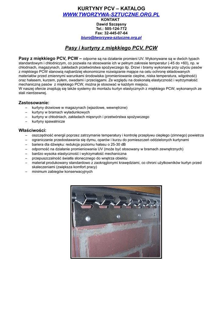 KURTYNY PCV – KATALOG WWW.TWORZYWA-SZTUCZNE.ORG.PL KONTAKT Dawid Szczęsny Tel.: 505-124-772 Fax: 32-445-07-64 [email protected] Pasy i kurtyny z miękkiego PCV, PCW Pasy z miękkiego PCV, PCW – odporne są na działanie promieni UV. Wykonywane są w dwóch typach standardowym i chłodniczym, co pozwala na stosowanie ich w pełnym zakresie temperatur (-45 do +60), np. w chłodniach, magazynach, zakładach przetwórstwa spożywczego itp. Drzwi i bramy wykonane przy użyciu pasów z miękkiego PCW stanowią najbardziej ekonomiczne rozwiązanie mające na celu ochronę składowanych materiałów przed zmiennymi warunkami środowiska (promieniowanie cieplne, niska temperatura, wilgotność) oraz hałasem, kurzem, pyłem, owadami i przeciągami. Ze względu na doskonałą elastyczność i wytrzymałość mechaniczną pasów z miękkiego PCW, można je stosować w każdym miejscu. W naszej ofercie znajdują się także systemy do montażu kurtyn elastycznych z miękkiego PCW, wykonanych ze stali nierdzewnej. Zastosowanie: – – – – kurtyny drzwiowe w magazynach (wjazdowe, wewnętrzne) kurtyny w bramach wyładunkowych kurtyny w chłodniach, zakładach mięsnych i przetwórstwa spożywczego kurtyny spawalnicze Właściwości: – – – – – – – – oszczędność energii poprzez zatrzymanie temperatury i kontrolę przepływu ciepłego (zimnego) powietrza ograniczanie przedostawania się dymu, oparów i kurzu do pomieszczeń oddzielonych kurtynami bariera dla dźwięku: redukcja poziomu hałasu o 25-30 dB odporność na działanie promieniowania UV (może być stosowany w bramach zewnętrznych) bardzo wysoka elastyczność i wytrzymałość mechaniczna przepuszczalność światła słonecznego do wnętrza obiektu materiał produkowany standardowo z zaokrąglonymi krawędziami, co chroni użytkowników kurtyn przed skaleczeniami (zwiększa komfort pracy) minimum zabiegów konserwacyjnych KURTYNY PCV – KATALOG WWW.TWORZYWA-SZTUCZNE.ORG.PL KONTAKT Dawid Szczęsny Tel.: 505-124-772 Fax: 32-445-07-64 [email protected] Pasy i kurtyny z miękkiego PCV, PCW Kolor Bezbarwny Czerwony transparentny Grubość (mm) Wymiar Przeznaczenie Cena za mb * Cena za rolkę* 2 20cm x 50m Standard 6,99 zł 349,50 zł 3 30cm x 50m Standard 14,76 zł 738,00 zł 4 40cm x 50m Standard 27,06 zł 1 353,00 zł 2 20cm x 50m Chłodniczy 9,02 zł 451,00 zł 3 30cm x 50m Chłodniczy 18,45 zł 922,50 zł 4 40cm x 50m Chłodniczy 36,01 zł 1 800,50 zł 2 20cm x 50m Standard 10,02 zł 501,00 zł 3 30cm x 50m Standard 24,14 zł 1 207,00 zł Akcesoria do montażu kurtyn ze stali nierdzewnej Kolor Opis Płytki mocujące Srebrny Wieszak grzebieniowy Wymiar (mm) Cena za szt. * 200 8,20 zł 300 9,84 zł 400 11,07 zł 984 34,44 zł 1066 36,90 zł 1230 45,10 zł 1312 49,20 zł 1476 53,30 zł 1681 69,70 zł *Ceny w złotych netto +23% VAT oparte o kurs EURO mogą się minimalnie różnić od rzeczywistych. *Są to ceny wyjściowe każde zamówienie traktowane jest indywidualnie. Zadzwoń i zapytaj o rabat dla Ciebie !!!! *Powyższy cennik nie jest ofertą handlową w rozumieniu prawa. Galeria KURTYNY PCV – KATALOG WWW.TWORZYWA-SZTUCZNE.ORG.PL KONTAKT Dawid Szczęsny Tel.: 505-124-772 Fax: 32-445-07-64 [email protected]
