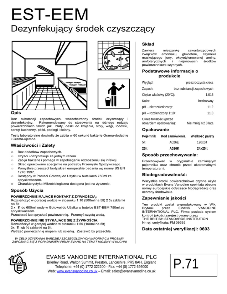 EST-EEM Dezynfekujący środek czyszczący Skład Zawiera mieszankę czwartorzędowych związków amoniaku, glikoeteru, czynnika maskującego jony, oksyetylenowanej aminy, amfoterycznych i niejonowych środków powierzchniowo czynnych. Podstawowe informacje o produkcie Wygląd: przezroczysta ciecz Zapach: bez substancji zapachowych o Ciężar właściwy (20 C): 1.016 Kolor: bezbarwny pH – nierozcieńczony: 11.2 Opis pH – rozcieńczony 1:10: 11.0 Bez substancji zapachowych, wszechstronny środek czyszczący i dezynfekcyjny. Rekomendowany do stosowania na różnego rodzaju powierzchniach takich jak blaty, deski do krojenia, stoły, wagi, lodówki, sprzęt kuchenny, półki, podłogi i ściany. Okres trwałości (przed otwarciem opakowania): Nie mniej niż 3 lata Testy laboratoryjne dowiodły że zabija w 60 sekund bakterie Grama-dodatnie i Grama-ujemne. Pojemnik Właściwości i Zalety • • • • • • • Bez dodatków zapachowych. Czyści i dezynfekuje za jednym razem. Zabija bakterie i pomaga w zapobieganiu roznoszeniu się infekcji. Skład opracowano specjalnie na potrzeby Przemysłu Spożywczego. Pomyślnie przeszedł brytyjskie i europejskie badania wg normy BS EN 1276:1997. Dostępny w Postaci Gotowej do Użytku w butelkach 750ml ze spryskiwaczem. Charakterystyka Mikrobiologiczna dostępna jest na życzenie. Sposób Użycia POWIERZCHNIE MAJĄCE KONTAKT Z ŻYWNOŚCIĄ: Rozcieńczyć w gorącej wodzie w stosunku 1:10 (500ml na 5lt) 2 ½ szklanki na 5lt 2x do 600ml wody w Gotowej do Użytku w butelce EST-EEM 750ml ze spryskiwaczem. Przecierać lub spryskać powierzchnię. Przemyć czystą wodą. POWIERZCHNIE NIE STYKAJĄCE SIĘ Z ŻYWNOŚCIĄ: Rozcieńczyć w gorącej wodzie w stosunku 1:50 (100ml na 5lt) 3x lub ½ szklanki na 5lt. Wytrzeć powierzchnię mopem lub ścierką. Zostawić by przeschła. Opakowanie Kod zamówienia Wielkość palety 5lt A026E 120x5lt 25lt A026K 24x25lt Sposób przechowywania: Przechowywać w oryginalnie zamkniętym pojemniku oraz chronić przed ekstremalnymi temperaturami. Biodegradowalność: Wszystkie środki powierzchniowo czynne użyte w produktach Evans Vanodine spełniają obecne normy europejskie dotyczące biodegradacji oraz ochrony środowiska. Zapewnianie jakości Ten produkt został wyprodukowany w Wlk. Brytanii przez EVANS VANODINE INTERNATIONAL PLC. Firma posiada system kontroli jakości zarejestrowany przez THE BRITISH STANDARDS INSTITUTION Nr rej. certyfikatu: FM 09535 Data ostatniej weryfikacji: 0603 W CELU UZYSKANIA BARDZIEJ SZCZEGÓŁOWYCH INFORMACJI PROSIMY ZAPOZNAĆ SIĘ Z PORADNIKIEM FIRMY EVANS NA TEMAT HIGIENY W KUCHNI EVANS VANODINE INTERNATIONAL PLC Brierley Road, Walton Summit, Preston, Lancashire, PR5 8AH, England Telephone: +44 (0) 1772 322200 - Fax: +44 (0) 1772 626000 Web: www.evansvanodine.co.uk – Email: [email protected] P.71