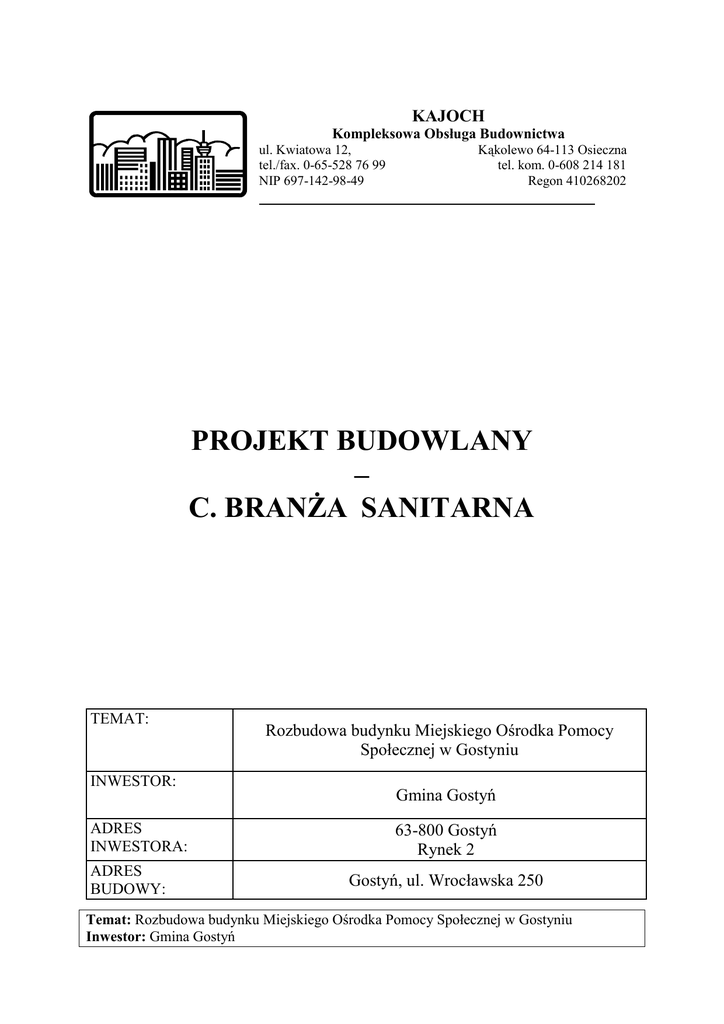KAJOCH Kompleksowa Obsługa Budownictwa ul. Kwiatowa 12, tel./fax. 0-65-528 76 99 NIP 697-142-98-49 Kąkolewo 64-113 Osieczna tel. kom. 0-608 214 181 Regon 410268202 PROJEKT BUDOWLANY – C. BRANśA SANITARNA TEMAT: INWESTOR: ADRES INWESTORA: ADRES BUDOWY: Rozbudowa budynku Miejskiego Ośrodka Pomocy Społecznej w Gostyniu Gmina Gostyń 63-800 Gostyń Rynek 2 Gostyń, ul. Wrocławska 250 Temat: Rozbudowa budynku Miejskiego Ośrodka Pomocy Społecznej w Gostyniu Inwestor: Gmina Gostyń SPIS TREŚCI: I. OPIS TECHNICZNY: 1. PODSTAWA OPRACOWANIA.................................................................................... 58 2. ZAKRES OPRACOWANIA. ......................................................................................... 58 3. INSTALACJA WODOCIĄGOWA. .............................................................................. 59 3.1 ZAPOTRZEBOWANIE NA WODĘ ..................................................................................... 61 3.2 ZESTAWIENIE MATERIAŁÓW......................................................................................... 61 1.1.1 Baterie i punkty czerpalne. ................................................................................... 61 3.2.2 Rury. ..................................................................................................................... 61 3.2.3 Zawory. ................................................................................................................ 62 4. INSTALACJA KANALIZACJI SANITARNEJ. ......................................................... 62 5. INSTALACJA KANALIZACJI DESZCZOWEJ. ....................................................... 63 6. INSTALACJA CENTRALNEGO OGRZEWANIA. ................................................... 64 6.1 ZESTAWIENIE WSPÓŁCZYNNIKÓW PRZENIKANIA CIEPŁA. ............................................. 66 6.2 ODBIORNIKI ................................................................................................................. 66 6.3 ZESTAWIENIE MATERIAŁÓW......................................................................................... 68 6.3.1 Grzejniki. .............................................................................................................. 68 6.3.2 Rury ...................................................................................................................... 69 6.3.3 Zawory i armatura ................................................................................................ 69 7. WENTYLACJA MECHANICZNA. .............................................................................. 69 8. TECHNOLOGIA KOTŁOWNI. ................................................................................... 70 8.1 ZAKRES OPRACOWANIA KOTŁOWNI GAZOWEJ. ............................................................. 70 8.2 TECHNOLOGIA KOTŁOWNI............................................................................................ 70 8.3 WYTYCZNE BUDOWLANE. ............................................................................................ 72 8.4 WYTYCZNE ELEKTRYCZNE........................................................................................... 73 8.5 WYTYCZNE EKSPLOATACJI KOTŁOWNI......................................................................... 73 8.6 OBLICZENIA. ................................................................................................................ 74 8.6.1 Dobór zaworu bezpieczeństwa dla podgrzewacza. .............................................. 74 8.6.2 Dobór naczyń przeponowych ............................................................................... 75 8.7 WYKAZ PODSTAWOWYCH URZĄDZEŃ W KOTŁOWNI. ................................................... 79 9. WEWNĘTRZNA INSTALACJA GAZU. ..................................................................... 80 Temat: Rozbudowa budynku Miejskiego Ośrodka Pomocy Społecznej w Gostyniu Inwestor: Gmina Gostyń II. CZĘŚĆ RYSUNKOWA. Rys. C 1 Projekt zagospodarowania terenu. Rys. C 2 Instalacja wod.-kan. Rzut parteru. Rys. C 3 Instalacja wod.-kan. Rzut I piętra. Rys. C 4 Instalacja wod.-kan. Rzut II piętra. Rys. C 5 Rozwinięcie instalacji wodociągowej. Rys. C 6 Rozwinięcie instalacji kanalizacji sanitarnej. Rys. C 7 Profil instalacji kanalizacji deszczowej. Rys. C 8 Instalacja c.o. i wentylacja mechaniczna. Rzut parteru. Rys. C 9 Instalacja c.o. i wentylacja mechaniczna. Rzut I piętra. Rys. C 10 Instalacja c.o. i wentylacja mechaniczna. Rzut II piętra. Rys. C 11 Rozwinięcie instalacji c.o. Rys. C 12 Rzut kotłowni. Rys. C 13 Schemat technologii kotłowni. Rys. C 14 Wewnętrzna instalacja gazu. Rys. C 15 Aksonometria instalacji gazu. III. ZAŁĄCZNIKI 1. Karta katalogowa wodomierza. 2. Karta katalogowa zaworu antyskaŜeniowego. 3. Karta katalogowa kotła gazowego. 4. Karta katalogowa pogrzewacza wody. 5. Karta katalogowa wentylatora EDM. Temat: Rozbudowa budynku Miejskiego Ośrodka Pomocy Społecznej w Gostyniu Inwestor: Gmina Gostyń OPIS TECHNICZNY DO PROJEKTU BUDOWLANEGO INSTALACJI WODOCIĄGOWEJ, KANALIZACJI SANITARNEJ, KANALIZACJI DESZCZOWEJ, CENTRALANEGO OGRZEWANIA, WENTYLACJI MECHANICZNEJ, TECHNOLOGII KOTŁOWNI ORAZ WEWNĘTRZNEJ INSTALACJI GAZU 1. Podstawa opracowania. − zlecenie inwestora, − plan sytuacyjny z naniesionym aktualnym uzbrojeniem w skali 1:500, − projekt architektoniczno – budowlany, − wizja lokalna, − normy i normatywy. 2. Zakres opracowania. Projekt dotyczy rozbudowy budynku Miejskiego Ośrodka Pomocy Społecznej zlokalizowanego w miejscowości Gostyń przy ul. Wrocławskiej 250. Przedmiotem opracowania jest projekt wewnętrznej instalacji wodociągowej, kanalizacji sanitarnej, kanalizacji deszczowej, centralnego ogrzewania, wentylacji mechanicznej, technologii kotłowni oraz wewnętrznej instalacji gazu. W zakres opracowania dotyczącego projektu instalacji wodociągowej wchodzi rozmieszczenie przyborów sanitarnych, wytyczenie trasy przewodów zimnej,