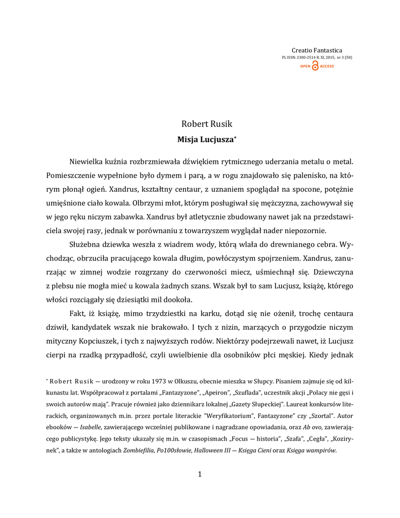 Creatio Fantastica PL ISSN: 2300-2514 R. XI, 2015, nr 3 (50) Robert Rusik Misja Lucjusza* Niewielka kuźnia rozbrzmiewała dźwiękiem rytmicznego uderzania metalu o metal. Pomieszczenie wypełnione było dymem i parą, a w rogu znajdowało się palenisko, na którym płonął ogień. Xandrus, kształtny centaur, z uznaniem spoglądał na spocone, potężnie umięśnione ciało kowala. Olbrzymi młot, którym posługiwał się mężczyzna, zachowywał się w jego ręku niczym zabawka. Xandrus był atletycznie zbudowany nawet jak na przedstawiciela swojej rasy, jednak w porównaniu z towarzyszem wyglądał nader niepozornie. Służebna dziewka weszła z wiadrem wody, którą wlała do drewnianego cebra. Wychodząc, obrzuciła pracującego kowala długim, powłóczystym spojrzeniem. Xandrus, zanurzając w zimnej wodzie rozgrzany do czerwoności miecz, uśmiechnął się. Dziewczyna z plebsu nie mogła mieć u kowala żadnych szans. Wszak był to sam Lucjusz, książę, którego włości rozciągały się dziesiątki mil dookoła. Fakt, iż książę, mimo trzydziestki na karku, dotąd się nie ożenił, trochę centaura dziwił, kandydatek wszak nie brakowało. I tych z nizin, marzących o przygodzie niczym mityczny Kopciuszek, i tych z najwyższych rodów. Niektórzy podejrzewali nawet, iż Lucjusz cierpi na rzadką przypadłość, czyli uwielbienie dla osobników płci męskiej. Kiedy jednak * R o b e rt R usi k ― urodzony w roku 1973 w Olkuszu, obecnie mieszka w Słupcy. Pisaniem zajmuje się od kil- kunastu lat. Współpracował z portalami „Fantazyzone”, „Apeiron”, „Szuflada”, uczestnik akcji „Polacy nie gęsi i swoich autorów mają”. Pracuje również jako dziennikarz lokalnej „Gazety Słupeckiej”. Laureat konkursów literackich, organizowanych m.in. przez portale literackie "Weryfikatorium”, Fantazyzone” czy „Szortal”. Autor ebooków ― Isabelle, zawierającego wcześniej publikowane i nagradzane opowiadania, oraz Ab ovo, zawierającego publicystykę. Jego teksty ukazały się m.in. w czasopismach „Focus ― historia”, „Szafa”, „Cegła”, „Kozirynek”, a także w antologiach Zombiefilia, Po100słowie, Halloween III ― Księga Cieni oraz Księga wampirów. 1 dokładnie obejrzano to, co po jednym, jedynym ciosie zostało z pewnego rycerza, który ośmielił się rzucić taką sugestię w przytomności księcia, plotki te natychmiast ucichły. A przecież Lucjusz był przystojny ― prawie dwa metry wzrostu i góra mięśni, którą opinała opalona skóra, a jednocześnie łagodna twarz i długie blond włosy. Do tego inteligencja, którą książę rozwijał, studiując wszelakie manuskrypty z biblioteki Harpagony, nadwornej wiedźmy. Ale najbardziej znano go ze swych wyczynów, o których śpiewali bardowie po wsiach i mieścinach, a nawet na królewskim dworze. Był jedynym znanym człowiekiem, który pokonał w pojedynczej walce mantikorę. Walczył również z borowikami, wampirami, jedna z pieśni mówiła nawet o pokonaniu smoka. Zawsze, kiedy ją słyszał, uśmiechał się. Nie komentował. Drzwi kuźni nagle się otwarły. Do pomieszczenia weszło bezceremonialnie dwóch ogolonych na łyso mężczyzn. Nosili skórzane, naćwiekowane spodnie, a ich nagie torsy opinały dwa skrzyżowane, również błyszczące srebrnymi punktami pasy. Wzrostem i posturą niewiele ustępowali Lucjuszowi. Stanęli po obu stronach wejścia, szybkim wzrokiem lustrując całe pomieszczenie. Po chwili weszła trzecia osoba. ― Królu ― rzekł krótko Lucjusz, klękając na jedno kolano. ― Wstań, książę. ― Przybysz niedbale machnął ręką. ― W naszej obecności masz przywilej stania i konwersacji, jak równy z równym z naszą skromną osobą. Lucjusz milczał. Wizyta króla, zwłaszcza tak niespodziewana, wiązała się niewątpliwie z jakąś ważną misją. Nie mylił się. ― Wpadłem do Harpagony po nowe eliksiry. Robi najlepsze, a dwór mi się ostatnio powiększył o nowe służące. Nie uwierzysz, jak potrafią człowieka zamęczyć, a lata już nie te ― zarechotał obleśnie, udając, iż nie zauważa zmieszania księcia. ― No dobra, ale my tu nie o chędożeniu gadać wstąpiliśmy. Albo i o chędożeniu, ale później. Najpierw chcielibyśmy się ożenić. Spostrzegł uniesione w geście zdziwienia brwi Lucjusza i Xandrusa. Milczeli, nie śmieli zadać oczywistego pytania osobie, która znana była wzdłuż i wszerz królestwa ze swej jurności. Na szczęście król wybawił ich z kłopotu. 2 ― Spójrzcie. ― Otworzył medalion, pokazując im malutki portrecik. Lucjusz aż westchnął. To była najpiękniejsza kobieta, jaką widział. A widział wiele. Król zamknął oczko naszyjnika i poklepał Lucjusza po ramieniu. ― Życzeniem naszym jest, byś udał się do księstwa Astiic. Towarzyszyć ci będą moi żołnierze, pod dowództwem Jararakki. Oni doprowadzą cię wprost pod szklaną górę, w której uwięziona jest ta piękność. Ty masz tylko wejść do wieży. ― Tylko? ― zdziwił się Lucjusz. ― Tylko. ― Rozumiem, że na straży stoi jakieś paskudztwo? ― Inteligentny superbohater… jakżeż was mało ― zarechotał znowu król, po czym poważniejąc, odparł: ― Tak, stoi. Niestety nie wiem jakie. ― Jak to do cholery nie wiesz! ― krzyknął Lucjusz, po czym zmitygował się, uklęknął i powtórzył pytanie: ― Jak to jego królewska mość nie wie? Dwójka strażników towarzysząca królowi podskoczyła w kierunku księcia, jednak władca niecierpliwym gestem odpędził ich od Lucjusza. Przez chwilę w królewskiej głowie kołatała pokusa, by zobaczyć owe słynne ciosy księcia, ale odgonił od siebie tę myśl. Szkoda było strażników. ― Gdyby ktoś, kogo wysłaliśmy wrócił, pewnie byśmy wiedzieli. Odwrócił się i ruszył ku drzwiom. Na odchodne rzekł: ― Wyjeżdżacie jutro rano. Aha, Harpagona chce się z tobą widzieć. *** Harpagona wyglądała dokładnie tak, jak wiedź