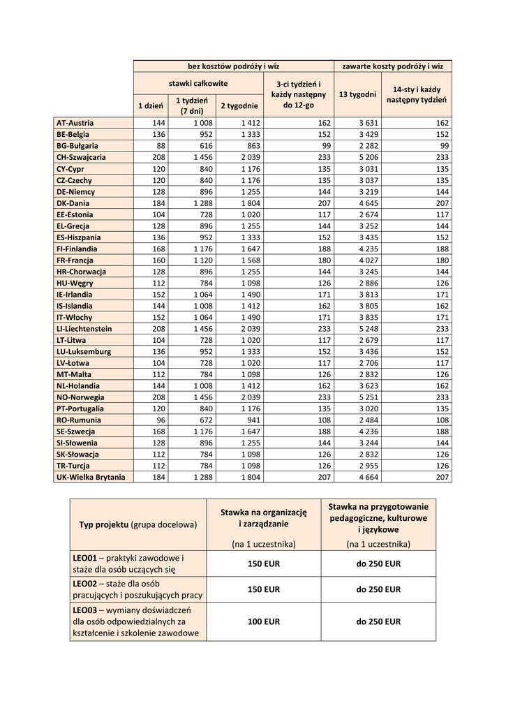 bez kosztów podróży i wiz stawki całkowite 1 dzień AT-Austria BE-Belgia BG-Bułgaria CH-Szwajcaria CY-Cypr CZ-Czechy DE-Niemcy DK-Dania EE-Estonia EL-Grecja ES-Hiszpania FI-Finlandia FR-Francja HR-Chorwacja HU-Węgry IE-Irlandia IS-Islandia IT-Włochy LI-Liechtenstein LT-Litwa LU-Luksemburg LV-Łotwa MT-Malta NL-Holandia NO-Norwegia PT-Portugalia RO-Rumunia SE-Szwecja SI-Słowenia SK-Słowacja TR-Turcja UK-Wielka Brytania 144 136 88 208 120 120 128 184 104 128 136 168 160 128 112 152 144 152 208 104 136 104 112 144 208 120 96 168 128 112 112 184 1 tydzień 2 tygodnie (7 dni) 1 008 1 412 952 1 333 616 863 1 456 2 039 840 1 176 840 1 176 896 1 255 1 288 1 804 728 1 020 896 1 255 952 1 333 1 176 1 647 1 120 1 568 896 1 255 784 1 098 1 064 1 490 1 008 1 412 1 064 1 490 1 456 2 039 728 1 020 952 1 333 728 1 020 784 1 098 1 008 1 412 1 456 2 039 840 1 176 672 941 1 176 1 647 896 1 255 784 1 098 784 1 098 1 288 1 804 zawarte koszty podróży i wiz 3-ci tydzień i każdy następny do 12-go 162 152 99 233 135 135 144 207 117 144 152 188 180 144 126 171 162 171 233 117 152 117 126 162 233 135 108 188 144 126 126 207 13 tygodni 14-sty i każdy następny tydzień 3 631 3 429 2 282 5 206 3 031 3 037 3 219 4 645 2 674 3 252 3 435 4 235 4 027 3 245 2 886 3 813 3 805 3 835 5 248 2 679 3 436 2 706 2 832 3 623 5 251 3 020 2 484 4 236 3 244 2 832 2 955 4 664 162 152 99 233 135 135 144 207 117 144 152 188 180 144 126 171 162 171 233 117 152 117 126 162 233 135 108 188 144 126 126 207 Stawka na organizację i zarządzanie Stawka na przygotowanie pedagogiczne, kulturowe i językowe (na 1 uczestnika) (na 1 uczestnika) LEO01 – praktyki zawodowe i staże dla osób uczących się 150 EUR do 250 EUR LEO02 – staże dla osób pracujących i poszukujących pracy 150 EUR do 250 EUR LEO03 – wymiany doświadczeo dla osób odpowiedzialnych za kształcenie i szkolenie zawodowe 100 EUR do 250 EUR Typ projektu (grupa docelowa)