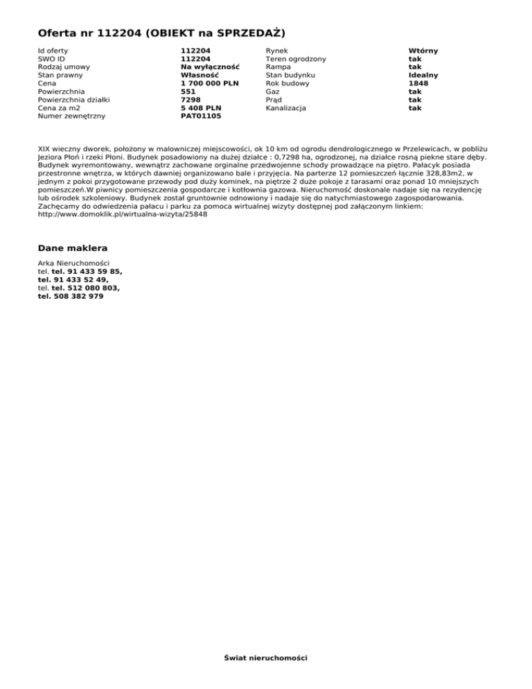 Oferta nr 112204 (OBIEKT na SPRZEDAŻ) Id oferty SWO ID Rodzaj umowy Stan prawny Cena Powierzchnia Powierzchnia działki Cena za m2 Numer zewnętrzny 112204 112204 Na wyłączność Własność 1 700 000 PLN 551 7298 5 408 PLN PAT01105 Rynek Teren ogrodzony Rampa Stan budynku Rok budowy Gaz Prąd Kanalizacja Wtórny tak tak Idealny 1848 tak tak tak XIX wieczny dworek, położony w malowniczej miejscowości, ok 10 km od ogrodu dendrologicznego w Przelewicach, w pobliżu Jeziora Płoń i rzeki Płoni. Budynek posadowiony na dużej działce : 0,7298 ha, ogrodzonej, na działce rosną piekne stare dęby. Budynek wyremontowany, wewnątrz zachowane orginalne przedwojenne schody prowadzące na piętro. Pałacyk posiada przestronne wnętrza, w których dawniej organizowano bale i przyjęcia. Na parterze 12 pomieszczeń łącznie 328,83m2, w jednym z pokoi przygotowane przewody pod duży kominek, na piętrze 2 duże pokoje z tarasami oraz ponad 10 mniejszych pomieszczeń.W piwnicy pomieszczenia gospodarcze i kotłownia gazowa. Nieruchomość doskonale nadaje się na rezydencję lub ośrodek szkoleniowy. Budynek został gruntownie odnowiony i nadaje się do natychmiastowego zagospodarowania. Zachęcamy do odwiedzenia pałacu i parku za pomoca wirtualnej wizyty dostępnej pod załączonym linkiem: http://www.domoklik.pl/wirtualna-wizyta/25848 Dane maklera Arka Nieruchomości tel. tel. 91 433 59 85, tel. 91 433 52 49, tel. tel. 512 080 803, tel. 508 382 979 Świat nieruchomości Powered by TCPDF (www.tcpdf.org)