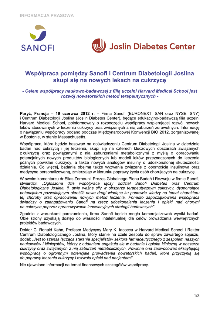 INFORMACJA PRASOWA Współpraca pomiędzy Sanofi i Centrum Diabetologii Joslina skupi się na nowych lekach na cukrzycę - Celem współpracy naukowo-badawczej z filią uczelni Harvard Medical School jest rozwój nowatorskich metod terapeutycznych - Paryż, Francja – 19 czerwca 2012 r. – Firma Sanofi (EURONEXT: SAN oraz NYSE: SNY) i Centrum Diabetologii Joslina (Joslin Diabetes Center), będące edukacyjno-badawczą filią uczelni Harvard Medical School, poinformowały o rozpoczęciu współpracy wspierającej rozwój nowych leków stosowanych w leczeniu cukrzycy oraz związanych z nią zaburzeń zdrowotnych. Informację o nawiązaniu współpracy podano podczas Międzynarodowej Konwencji BIO 2012, zorganizowanej w Bostonie, w stanie Massachusetts. Współpraca, która będzie bazować na doświadczeniu Centrum Diabetologii Joslina w dziedzinie badań nad cukrzycą i jej leczenia, skupi się na czterech kluczowych obszarach związanych z cukrzycą oraz powiązanymi z nią zaburzeniami metabolicznymi z myślą o opracowaniu potencjalnych nowych produktów biologicznych lub modeli leków przeznaczonych do leczenia późnych powikłań cukrzycy, a także nowych analogów insuliny o udoskonalonej skuteczności działania. Co więcej, badania obejmą także wyzwania związane z opornością insulinową oraz medycyną personalizowaną, zmierzając w kierunku poprawy życia osób chorujących na cukrzycę. W swoim komentarzu dr Elias Zerhouni, Prezes Globalnego Pionu Badań i Rozwoju w firmie Sanofi, stwierdził: „Ogłoszona dziś współpraca łączy oddział Sanofi Diabetes oraz Centrum Diabetologiczne Joslina, tj. dwie ważne siły w obszarze terapeutycznym cukrzycy, dysponujące potencjałem pozwalającym określić nowe drogi wiodące ku poprawie wiedzy na temat charakteru tej choroby oraz opracowaniu nowych metod leczenia. Ponadto zapoczątkowana współpraca świadczy o zaangażowaniu Sanofi na rzecz udoskonalania leczenia i opieki nad chorymi na cukrzycę poprzez opracowywanie innowacyjnych strategii badawczych”. Zgodnie z warunkami porozumienia, firma Sanofi będzie mogła komercjalizować wyniki badań. Obie strony uzyskają dostęp do własności intelektualnej dla celów prowadzenia wewnętrznych projektów badawczych. Doktor C. Ronald Kahn, Profesor Medycyny Mary K. Iacocca w Harvard Medical School i Rektor Centrum Diabetologicznego Joslina, który stanie na czele zespołu do spraw zawartego sojuszu, dodał: „Jest to szansa łącząca starania specjalistów sektora farmaceutycznego z zespołem naszych naukowców i klinicystów, którzy z oddaniem angażują się w badania i opiekę kliniczną w obszarze cukrzycy oraz związanych z nią zaburzeń metabolicznych. Powinna ona zaowocować ekscytującą współpracą o ogromnym potencjale prowadzenia nowatorskich badań, które przyczynią się do poprawy leczenia cukrzycy i rozwoju opieki nad pacjentami”. Nie ujawniono informacji na temat finansowych szczegółów współpracy. 1/3 Informacje na temat Centrum Diabetologicznego Joslina Joslin Diabetes Center jest wiodącą światową organizacją specjalizującą się w badaniach nad cukrzycą i opiece klinicznej nad pacjentami. Najlepsi na świecie badacze i klinicyści zatrudnieni w Centrum Diabetologicznym Joslina zapobiegają, leczą oraz starają się wyleczyć cukrzycę i jej powikłania. Spośród instytucji afiliowanych przy uczelni Harvard Medical School, Centrum Joslina jest jednym z akademickich ośrodków medycznych, który prowadzi najbardziej intensywne badania i jest wyjątkowy pod względem wyłącznej koncentracji na cukrzycy. Preparaty opracowane przez jego specjalistów przyczyniają się do poprawy życia osób cierpiących na cukrzycę na całym świecie, oferując największą nadzieję na całkowite wyleczenie choroby. Ośrodek, który został założony w 1898 r. przez jednego lekarza – doktora medycyny Elliotta P. Joslina – obecnie zatrudnia ponad 600 osób reprezentujących 3 główne oddziały. Pierwszym z nich jest Joslin Research – doskonale współpracujący zespół liczący ponad 300 pracowników, w tym 41 badaczy wydziałowych, realizujących największy program badawczy dotyczący zapobiegania i leczenia cukrzycy typu 1 i typu 2 oraz ich długofalowych powikłań, a także ponad 120 osób zdobywających kwalifikacje w ramach stypendiów lekarskich i doktorskich. Drugim jest Joslin Clinic, pierwsza w świecie i najbardziej szanowana placówka zajmująca się leczeniem cukrzycy, z której opieki rocznie korzysta 23 tys. osób dorosłych i dzieci, zorientowana na konkurencyjną i kompleksową opiekę nad pacjentami, prowadzoną przez wysokiej klasy specjalistów w wielu dziedzinach. Trzecim oddziałem jest Joslin Strategic Initiatives, odpowiedzialny za rozwój i wprowadzanie na rynek nowatorskich programów, produktów oraz usług, które poprawiają dostępność wiedzy i umiejętności Centrum Joslina dla pacjentów i klinicystów na całym świecie, z myślą o udoskonalaniu jakości leczenia cukrzycy. Informacje na temat Sanofi Diabetes Sanofi dokłada starań, aby pomóc ludziom w trudnej walce z cukrzycą poprzez dostarczanie im nowatorskich, zintegrowanych i indywidualnych rozwiązań. Wykorzystując cenną wiedzę pochodzącą z kontaktów i współpracy z osobami chorującymi na cukrzycę, firma tworzy partnerstwa w celu oferowania diagnostyki, terapii, usług i urządzeń, łącznie z innowacyjnymi systemami monitorowania poziomu glukozy we krwi. Sanofi prowadzi sprzedaż leków zarówno do wstrzykiwania, jak i doustnych, przeznaczonych dla osób z cukrzycą typu 1 bądź typu 2. Wśród związków znajdujących się w fazie badań jest przeznaczony do wstrzykiwania agonista GLP-1, będący substancją badaną jako pojedynczy czynnik, w połączeniu z insuliną bazową i/lub w połączeniu z doustnymi środkami przeciwcukrzycowymi. Informacje o Sanofi Sanofi jest globalnym dostawcą usług zdrowotnych, zaangażowanym w odkrywan