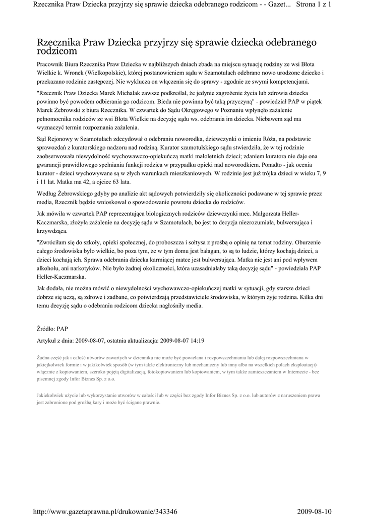 Rzecznika Praw Dziecka przyjrzy się sprawie dziecka odebranego rodzicom - - Gazet... Strona 1 z 1 Rzecznika Praw Dziecka przyjrzy się sprawie dziecka odebranego rodzicom Pracownik Biura Rzecznika Praw Dziecka w najbliższych dniach zbada na miejscu sytuację rodziny ze wsi Błota Wielkie k. Wronek (Wielkopolskie), której postanowieniem sądu w Szamotułach odebrano nowo urodzone dziecko i przekazano rodzinie zastępczej. Nie wyklucza on włączenia się do sprawy - zgodnie ze swymi kompetencjami. "Rzecznik Praw Dziecka Marek Michalak zawsze podkreślał, że jedynie zagrożenie życia lub zdrowia dziecka powinno być powodem odbierania go rodzicom. Bieda nie powinna być taką przyczyną" - powiedział PAP w piątek Marek Żebrowski z biura Rzecznika. W czwartek do Sądu Okręgowego w Poznaniu wpłynęło zażalenie pełnomocnika rodziców ze wsi Błota Wielkie na decyzję sądu ws. odebrania im dziecka. Niebawem sąd ma wyznaczyć termin rozpoznania zażalenia. Sąd Rejonowy w Szamotułach zdecydował o odebraniu noworodka, dziewczynki o imieniu Róża, na podstawie sprawozdań z kuratorskiego nadzoru nad rodziną. Kurator szamotulskiego sądu stwierdziła, że w tej rodzinie zaobserwowała niewydolność wychowawczo-opiekuńczą matki małoletnich dzieci; zdaniem kuratora nie daje ona gwarancji prawidłowego spełniania funkcji rodzica w przypadku opieki nad noworodkiem. Ponadto - jak ocenia kurator - dzieci wychowywane są w złych warunkach mieszkaniowych. W rodzinie jest już trójka dzieci w wieku 7, 9 i 11 lat. Matka ma 42, a ojciec 63 lata. Według Żebrowskiego gdyby po analizie akt sądowych potwierdziły się okoliczności podawane w tej sprawie przez media, Rzecznik będzie wnioskował o spowodowanie powrotu dziecka do rodziców. Jak mówiła w czwartek PAP reprezentująca biologicznych rodziców dziewczynki mec. Małgorzata HellerKaczmarska, złożyła zażalenie na decyzję sądu w Szamotułach, bo jest to decyzja niezrozumiała, bulwersująca i krzywdząca. "Zwróciłam się do szkoły, opieki społecznej, do proboszcza i sołtysa z prośbą o opinię na temat rodziny. Oburzenie całego środowiska było wielkie, bo poza tym, że w tym domu jest bałagan, to są to ludzie, którzy kochają dzieci, a dzieci kochają ich. Sprawa odebrania dziecka karmiącej matce jest bulwersująca. Matka nie jest ani pod wpływem alkoholu, ani narkotyków. Nie było żadnej okoliczności, która uzasadniałaby taką decyzję sądu" - powiedziała PAP Heller-Kaczmarska. Jak dodała, nie można mówić o niewydolności wychowawczo-opiekuńczej matki w sytuacji, gdy starsze dzieci dobrze się uczą, są zdrowe i zadbane, co potwierdzają przedstawiciele środowiska, w którym żyje rodzina. Kilka dni temu decyzję sądu o odebraniu rodzicom dziecka nagłośniły media. Źródło: PAP Artykuł z dnia: 2009-08-07, ostatnia aktualizacja: 2009-08-07 14:19 Żadna część jak i całość utworów zawartych w dzienniku nie może być powielana i rozpowszechniania lub dalej rozpowszechniana w jakiejkolwiek formie i w jakikolwiek sposób (w tym także elektroniczny lub mechaniczny lub inny albo na wszelkich polach eksploatacji) włącznie z kopiowaniem, szeroko pojętą digitalizacją, fotokopiowaniem lub kopiowaniem, w tym także zamieszczaniem w Internecie - bez pisemnej zgody Infor Biznes Sp. z o.o. Jakiekolwiek użycie lub wykorzystanie utworów w całości lub w części bez zgody Infor Biznes Sp. z o.o. lub autorów z naruszeniem prawa jest zabronione pod groźbą kary i może być ścigane prawnie. http://www.gazetaprawna.pl/drukowanie/343346 2009-08-10