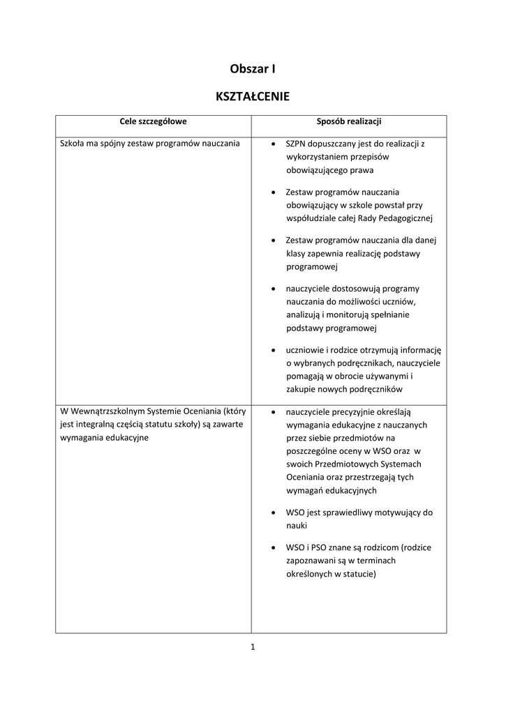 Obszar I KSZTAŁCENIE Cele szczegółowe Sposób realizacji Szkoła ma spójny zestaw programów nauczania W Wewnątrzszkolnym Systemie Oceniania (który jest integralną częścią statutu szkoły) są zawarte wymagania edukacyjne 1 SZPN dopuszczany jest do realizacji z wykorzystaniem przepisów obowiązującego prawa Zestaw programów nauczania obowiązujący w szkole powstał przy współudziale całej Rady Pedagogicznej Zestaw programów nauczania dla danej klasy zapewnia realizację podstawy programowej nauczyciele dostosowują programy nauczania do możliwości uczniów, analizują i monitorują spełnianie podstawy programowej uczniowie i rodzice otrzymują informację o wybranych podręcznikach, nauczyciele pomagają w obrocie używanymi i zakupie nowych podręczników nauczyciele precyzyjnie określają wymagania edukacyjne z nauczanych przez siebie przedmiotów na poszczególne oceny w WSO oraz w swoich Przedmiotowych Systemach Oceniania oraz przestrzegają tych wymagań edukacyjnych WSO jest sprawiedliwy motywujący do nauki WSO i PSO znane są rodzicom (rodzice zapoznawani są w terminach określonych w statucie) W szkole funkcjonują plany pracy z poszczególnych przedmiotów oraz plany wychowawców klasowych Szkoła umożliwia uczniom z trudnościami edukacyjnymi i wychowawczymi zdobycie umiejętności do uzyskania promocji Szkoła umożliwia uczniom wyrównywanie braków i zapobieganie narastaniu opóźnień nauczyciele opracowują plany pracy w ramach nauczanych przedmiotów W planach pracy nauczyciele projektują spełnianie standardów wymagań egzaminacyjnych (ponad przedmiotowych) plan wychowawcy klasowego jest spójny z programem wychowawczym i profilaktycznym szkoły w szkole uczą się dzieci ze specyficznymi trudnościami w nauce dzieci badane są w Poradni Psychologiczno Pedagogicznej pod kątem dostosowania programu nauczania do ich możliwości, orzeczenia o upośledzeniu w stopniu lekkim, dysleksji etc. nauczyciele zdobywają umiejętności do pracy z dziećmi ze specyficznymi trudnościami w nauce nauczyciele dostosowują ocenianie do powyższych wymagań w szkole zwraca się uwagę na dostosowanie egzaminu zewnętrznego do potrzeb uczniów ze specyficznymi i niespecyficznymi trudnościami w nauce dyrekcja i nauczyciele biorą udział w pozyskiwaniu pieniędzy unijnych na realizację programów wyrównujących szanse edukacyjne W szkole istnieje system organizacji zajęć dydaktyczno wyrównawczych W ramach godzin z art. 42 KN W ramach zajęć unijnych 2 W szkole przeprowadzane są diagnozy (w celu obserwacji przyrostu wiedzy u uczniów, ewentualnie prowadzenia działań naprawczych) W szkole analizuje się wyniki sprawdzianu zewnętrznego diagnoza przedszkolna diagnoza pierwszoklasisty diagnozy z wybranych przedmiotów bądź dziedzin wiedzy diagnoza przygotowania szóstoklasistów do sprawdzianu zewnętrznego (sprawdzian próbny) wnioski wykorzystywane są do planowania pracy szkoły : W szkole przeprowadza się badanie umiejętności kluczowych po pierwszym etapie nauczania- po III klasie działania naprawcze praca nad kształceniem najsłabszych umiejętności informacje dla nauczycieli na następnym etapie nauczania- diagnoza W szkole istnieją różne formy pracy z uczniami chcącymi rozwijać swoje umiejętności, zdolności, zainteresowania organizowane są zajęcia pozalekcyjne rozwijające zainteresowania uczniów uczniowie mają możliwość brania udziału w konkursach, przeglądach, zawodach (przygotowywani są do nich) 3 szczebel szkolny szczebel międzyszkolny szczebel gminny szczebel powiatowy Nauczyciele stosują aktywne metody pracy z uczniami W szkole istnieje system nagradzania i promowania uczniów zdolnych, pracowitych, reprezentujących szkołę na zewnątrz Szkoła śledzi losy swoich absolwentów a oni identyfikują się z naszą placówką 4 stosowane są metody aktywizujące na lekcjach, uroczystościach szkolnych prowadzone są innowacje pedagogiczne nauczyciele stosują w pracy z dziećmi metodę projektu indywidualizacja pracy zapewnia szanse osiągania sukcesu każdemu uczniowi zadania uwzględniają predyspozycje uczniów istnieje integracja między przedmiotowa gratulacje na apelu w obecności całej społeczności szkolnej pochwała ustna na oficjalnej uroczystości szkolnej, w obecności rodziców, przedstawicieli władz samorządowych, gości nagrody na zakończenie roku szkolnego stypendium szkolne ( za naukę, za osiągnięcia sportowe) absolwenci na dalszych etapach nauki poszerzają swoje zainteresowania zaszczepione w naszej placówce (udział w określonych konkursach, rajdach, zwiedzanie określonych miejsc, udział w kulturze…) odnotowywane są informacje o wyborach szkół przez naszych absolwentów absolwenci odbywają w naszej placówce praktyki, staże absolwenci uczestniczą w uroczystościach, świętach, zabawach organizowanych przez szkołę Obszar II WYCHOWANIE I OPIEKA Cele szczegółowe Sposób realizacji W szkole funkcjonują: Programy są: Program Wychowawczy tworzone z udziałem całej szkolnej społeczności opiniowane przez rodziców znane całej szkolnej społeczności aktualizowane corocznie Program Profilaktyczny Program Profilaktyki Uzależnień Uczeń w szkole czuje się bezpiecznie Uczniowie mają zapewnioną pomoc psychologiczną i pedagogiczną, pielęgniarską 5 krzesła i ławki dostosowane do wzrostu dyżury nauczycielskie na przerwach, przed i po lekcjach opieka w czasie zajęć pozalekcyjnych i pozaszkolnych opieka w świetlicy szkolnej odprowadzanie dzieci z autobusu szkolnego rano i do autobusu po południu wszelkie przejawy agresji są rozpoznawane, diagnozowane i niwelowane zajęcia pedagogiczne, integracyjne na terenie szkoły kierowanie na zajęcia do Poradni Psychologiczno Pedagogicznej współpraca z pielęgniarką szkolną z terenu przychodni lekarskiej w Warcie (badania przesiewowe i bilansowe, fluoryzacja, badania zdrowotne przed zawodami sportowymi) Szkoła zna środowisko 