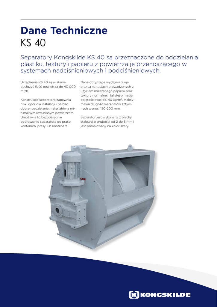 Dane Techniczne KS 40 Separatory Kongskilde KS 40 są przeznaczone do oddzielania plastiku, tektury i papieru z powietrza je przenoszącego w systemach nadciśnieniowych i podciśnieniowych. Urządzenia KS 40 są w stanie obsłużyć ilość powietrza do 40 000 m3/h. Konstrukcja separatora zapewnia niski opór dla instalacji i bardzo dobre rozdzielanie materiałów z minimalnym uwalnianym powietrzem. Umożliwia to bezpośrednie podłączenie separatora do praso kontenera, prasy lub kontenera. Dane dotyczące wydajności oparte są na testach prowadzonych z użyciem mieszanego papieru oraz tektury normalnej i falistej o masie objętościowej ok. 40 kg/m3. Maksymalna długość materiałów sztywnych wynosi 150-200 mm. Separator jest wykonany z blachy stalowej o grubości od 2 do 3 mm i jest pomalowany na kolor szary. Dane techniczne Wykres strat ciśnienia mm WG KS 40 Wydajność40.000 m3/h 5.000 kg/h 120 Silnik 4,0 kW Masa 1.190 kg Prędkość Obr./min.19 KS 40 Maksym.350 ciśnienie H2O 80 40 40000 32000 24000 16000 0 8000 0 m3/h Akcesoria Długość wlotu (mm) Długość wylotu (mm) KS 40 KS 40 FK 500 576 976 FK 600 576 976 FK 700 - - FK 800 576 976* * Dostępny również z wylotem 90 ° z dwoma przyłączami FK 800. Wymiary Type KS 40 AB C D E F G H I K L M N O P R 600750 2000700 4902080680 12001200 680 1689 580 218025681598 Kongskilde Polska Sp. z o.o. Tel. 024 355 96 15 [email protected] www.kongskilde.com - Subject to modifications. Średnica rury 123001885 KPL/PL/KS 40/DATA/0416 Standardowe redukcje, 2 mm pomalowane na kolor szary