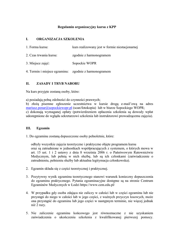 Regulamin organizacyjny kursu z KPP I. ORGANIZACJA SZKOLENIA 1. Forma kursu: kurs realizowany jest w formie niestacjonarnej 2. Czas trwania kursu: zgodnie z harmonogramem 3. Miejsce zajęć: Sopockie WOPR 4. Termin i miejsce egzaminu: zgodnie z harmonogramem II. ZASADY I TRYB NABORU Na kurs przyjęte zostaną osoby, które: a) posiadają pełną zdolności do czynności prawnych; b) złożą pisemne zgłoszenie uczestnictwa w kursie drogą e-mail’ową na adres [email protected] (scan/fotokopia) lub w biurze Sopockiego WOPR; c) dokonają wymaganej opłaty (potwierdzeniem opłacenia szkolenia są dowody wpłat udostępnione do wglądu sekretarzowi szkolenia lub instruktorowi prowadzącemu zajęcia). III. Egzamin 1. Do egzaminu zostaną dopuszczone osoby pełnoletnie, które: odbyły wszystkie zajęcia teoretyczne i praktyczne objęte programem kursu oraz są zatrudnione w jednostkach współpracujących z systemem, o których mowa w art. 15 ust. 1 i 2 ustawy z dnia 8 września 2006 r. o Państwowym Ratownictwie Medycznym, lub pełnią w nich służbę, lub są ich członkami (zaświadczenie o zatrudnieniu, pełnieniu służby lub aktualna legitymacja członkowska). 2. Egzamin składa się z części teoretycznej i praktycznej. 3. Pozytywny wynik egzaminu teoretycznego stanowi warunek konieczny dopuszczenia do egzaminu praktycznego. Pytania egzaminacyjne dostępne są na stronie Centrum Egzaminów Medycznych w Łodzi https://www.cem.edu.pl/ 4. W przypadku gdy osoba zdająca nie zaliczy w całości lub w części egzaminu lub nie przystąpi do niego w całości lub w jego części, z ważnych przyczyn losowych, może ona przystąpić do egzaminu lub jego części w następnym terminie, nie więcej jednak niż 2 razy. 5. Nie zaliczenie egzaminu końcowego jest równoznaczne z nie uzyskaniem zaświadczenia o ukończeniu szkolenia z kwalifikowanej pierwszej pomocy. IV. Postanowienia końcowe. 1. W przypadku rezygnacji przez uczestnika ze szkolenia, Organizator a) zwraca 80% dokonanych wpłat za szkolenie, jeżeli rezygnacja nastąpiła nie później niż 14 dni przed rozpoczęciem szkolenia, b) zwraca 50 dokonanych wpłat za szkolenie, jeżeli rezygnacja nastąpiła w terminie krótszym niż 14 dni przed rozpoczęciem szkolenia, c) nie zwraca dokonanych wpłat za szkolenie, jeżeli rezygnacja nastąpiła po rozpoczęciu szkolenia. 2. Pisemne złożenie zgłoszenia uczestnictwa w kursie/repetytorium jest jednoznaczne z potwierdzeniem zapoznania się z powyższymi zasadami i akceptacją niniejszego regulaminu. 3. Uczestnik szkolenia może zostać skreślony z listy uczestników a) w przypadku łamania zasad współżycia społecznego lub zachowania niezgodnego z etyką ratownika, b) w przypadku używania lub bycia pod wpływem alkoholu lub środków odurzających. 4. Ze względów organizacyjnych harmonogram zajęć może ulec zmianie (godziny i tematyka zajęć). Zmianie nie powinny podlegać określone w harmonogramie dni. 5. ORGANIZATOR ZASTRZEGA SOBIE PRAWO NIE PRZYJĘCIA NA SZKOLENIE Z POWODU BRAKU WOLNYCH MIEJSC LUB W PRZYPADKU NIE SPEŁNIENIA PRZEZ KANDYDATA WYMOGÓW FORMALNYCH ORAZ ODWOŁANIA SZKOLENIA W PRZYPADKU ZBYT MAŁEJ LICZBY ZAINTERESOWANYCH. W TAKIEJ SYTUACJI ORGANIZATOR ZOBOWIĄZUJE SIĘ DO ZWROTU WPŁACONYCH PRZEZ KANDYDATÓW OPŁAT ZA KURS. Organizator szkolenia