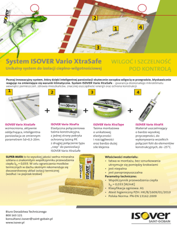 2 4 1 3 System ISOVER Vario XtraSafe Unikalny system do izolacji cieplno-wilgotnościowej WILGOĆ I SZCZELNOŚĆ POD KONTROLĄ Poznaj innowacyjny system, który dzięki inteligentnej paroizolacji skutecznie zarządza wilgocią w przegrodzie, błyskawicznie reagując na zmieniające się warunki klimatyczne. System ISOVER Vario XtraSafe – gwarancja doskonałego mikroklimatu wewnątrz pomieszczeń, zdrowia mieszkańców, znacznej oszczędności energii oraz ochrona konstrukcji. 1 2 + ISOVER Vario XtraSafe wzmocniona, aktywnie oddychająca, inteligentna paroizolacja ze zmiennym parametrem Sd=0,3-20m. 3 4 + ISOVER Vario XtraFix Elastyczna połączeniowa taśma konstrukcyjna, z jednej strony pokryta ochronną taśmą PP, z drugiej połączenie typu „rzep” do paroizolacji ISOVER Vario XtraSafe SUPER-MATA to to wysokiej jakości wełna mineralna szklana o znakomitym współczynniku przewodzenia ciepła λD = 0,033. W celu ograniczenia mostków termicznych w dachu skośnym rekomenduje się dwuwarstwowy układ izolacji termicznej (wzdłuż i w poprzek krokwi) Biuro Doradztwa Technicznego 800 163 121 [email protected] www.isover.pl + ISOVER Vario XtraTape Taśma montażowa o unikatowej elastyczności i rozciągliwości oraz bardzo dużej sile klejenia ISOVER Vario XtraFit Materiał uszczelniający o bardzo wysokiej przyczepności, do wykonywania wszelkich połączeń folii do elementów konstrukcyjnych, do -25°C. Właściwości materiału: • łatwa w montażu, bez sznurkowania utrzymuje się pomiędzy krokwiami • jest niepalna • jest paroprzepuszczalna Parametry techniczne: • Współczynnik przewodzenia ciepła λD = 0,033 [W/mK] • Klasyfikacja ogniowa: A1 • Atest higieniczny PZH: HK/B/1609/01/2010 • Polska Norma: PN-EN 13162:2009 1 2 Paroszczelność (zima) Sd=0,3: zatrzymuje przepływ wilgoci z pomieszczeń do konstrukcji Funkcja wysuszania (lato) Sd=20: pozwala usunąć wilgoć z konstrukcji 2 1 Izolacja lub termorenowacja poddasza [1] 1 Przyklej taśmę ISOVER Vario XtraFix do krokwi, dla bezpieczeństwa przyczep dodatkowo zszywką co 20 cm. UWAGA: Pamiętaj aby w przypadku profili metalowych, odtłuścić je przed przyklejeniem taśmy. 2 Przyłóż paroizolację ISOVER Vario XtraSafe do krokwi napisami do wewnątrz, przyciśnij ręką. Pozostaw 20 cm zakład na następną warstwę folii ISOVER Vario XtraSafe. [2] 2-składnikowa, trwale elastyczna masa klejąca ISOVER Vario XtraFit, zmienia swój kolor pod wpływem stabilizowania w czasie: od [1] jasnozielonego – zaraz po użyciu do [2] ciemnozielonego – masa w pełni ustabilizowana. UWAGA: Pamiętaj aby w przypadku profili metalowych, odtłuścić je przed przyklejeniem taśmy. Pamiętaj, że: 3 Zaklej krawędzie folii ISOVER Vario XtraSafe, taśmą ISOVER Vario XtraTape 4 Użyj masę klejącą ISOVER Vario XtraFit do połączenia folii paroizolacyjnej ISOVER Vario XtraSafe do konstrukcji , np. ściany szczytowej. stosując dwuwarstwowy układ izolacji eliminujesz mostki termiczne należy zachować co najmniej 2,5 cm szczelinę wentylacyjną w przestrzeni między wełną a pokryciem dachu istotne jest zachowanie ciągłości izolacji uzyskanie pełnej wydajności systemu ISOVER Vario uzależnione jest szczególnie od poprawnej, szczelnej instalacji.
