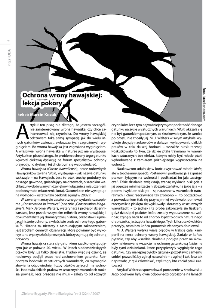PRZYRODA tekst: Marcin Kozak A rtykuł ten piszę nie dlatego, że jestem szczególnie zainteresowany wroną hawajską, czy chcę zainteresować nią czytelnika. Do wrony hawajskiej odczuwam taką samą sympatię jak do wielu innych gatunków zwierząt, zwłaszcza tych zagrożonych wyginięciem. Bo wrona hawajska jest zagrożona wyginięciem. A właściwie, wrona hawajska w naturze już nie występuje. Artykuł ten piszę dlatego, że problem ochrony tego gatunku wywołał ciekawą dyskusję na forum specjalistów ochrony przyrody, i o dyskusji tej chciałbym się wypowiedzieć. Wrona hawajska (Corvus hawaiiensis), przez rodowitych Hawajczyków zwana ‘alala, występuje – jak nazwa gatunku wskazuje – na Hawajach. Jest to ptak trochę podobny do naszego gawrona, gniazdujący na drzewach, o szerokim wachlarzu wydobywanych dźwięków (włącznie z miauczeniem podobnym do miauczenia kota). Gatunek ten nie występuje na wolności – ostatni taki osobnik zginął w 2002 r. W czwartym zeszycie zeszłorocznego wydania czasopisma „Conservation in Practice” (obecnie „Conservation Magazine”), Mark Jerome Walters, weterynarz i profesor dziennikarstwa, lecz przede wszystkim miłośnik wrony hawajskiej i dokumentalista jej dramatycznej historii, przedstawił ujmującą historię ochrony, a właściwie prób ochrony tego gatunku1). Historia ta, niestety z zasmucającym zakończeniem, jest źródłem cennych obserwacji, które powinny być wykorzystane w przyszłości przez tych, którzy zajmują się ochroną przyrody. Wrona hawajska stała się gatunkiem rzadko występującym już w połowie 20. wieku. W latach siedemdziesiątych ptaków były już tylko dziesiątki. Trudno więc się dziwić, że naukowcy podjęli prace nad zachowaniem gatunku. Rozpoczęto hodowlę w sztucznych warunkach, co wymagało złowienia odpowiedniej liczby ptaków żyjących na wolności. Hodowla dzikich ptaków w sztucznych warunkach może się powieść, lecz przecież nie musi – zależy to od różnych „Zielone Brygady. Pismo Ekologów” nr 3 (224) / 2007 foto. istockphoto.com Ochrona wrony hawajskiej: lekcja pokory czynników, lecz tym najważniejszym jest podatność danego gatunku na życie w sztucznych warunkach. ‘Alala okazała się nie być gatunkiem podatnym, co skutkowało tym, że samice po prostu nie znosiły jaj. M. J. Walters w swym artykule krytykuje decyzję naukowców o dalszym wyłapywaniu dzikich ptaków w celu dalszej hodowli – wszakże nieskutecznej. Poskutkowało to tym, że dzikie ptaki trzymano w warunkach sztucznych bez efektu, którym miały być młode ptaki wyhodowane z zamiarem późniejszego wypuszczenia na wolność. Naukowcom udało się w końcu wychować młode ‘alala, ale w trochę inny sposób. Postanowili podbierać jaja z gniazd ptakom żyjącym na wolności i podkładać im jaja „zastępcze”. Takie działania zwiększają szansę wyklucia pisklęcia z jaj poprzez minimalizację niebezpieczeństw, na jakie jaja – a potem i wyklute pisklęta – są narażone w warunkach naturalnych. I choć rzeczywiście tak zrobiono – i to początkowo z powodzeniem (tak się przynajmniej wydawało, ponieważ rzeczywiście pisklęta się wykluwały i dorastały w sztucznych warunkach) – to jednak i ta próba zakończyła się fiaskiem, gdyż dziesiątki ptaków, które zostały wypuszczone na wolność, zginęły bądź to od chorób, bądź to od ich naturalnego drapieżnika, jastrzębia hawajskiego. Tych kilka ptaków, które przeżyły, zostało w końcu ponownie złapanych do niewoli. M. J. Walters wytyka wiele błędów w trakcie całej kampanii na rzecz ochrony wrony hawajskiej. Zadaje w końcu pytanie, czy aby wszelkie działania podjęte przez naukowców nakierowane wszakże na ochronę gatunkową ‘alala nie były tymi działaniami, które przyspieszyły wyginięcie tego gatunku. Czy nie lepiej byłoby gatunek pozostawić samemu sobie i pozwolić, by zginął naturalnie – a zginął i tak, lecz tak naprawdę „z ręki człowieka”, czyli tego, kto chciał ptaki uratować? Artykuł Waltersa spowodował poruszenie w środowisku. Jego objawem były dwie odpowiedzi ogłoszone na łamach Konkurs Krakowski Klub Wegetarian „Żyj i pozwól żyć innym” zaprasza do wzięcia udziału w konkursie na wiersz prowegetariański. Jeden autor może przesłać od 1 do 3 wierszy (każdy w trzech egzemplarzach), na adres: Śródmiejski Ośrodek Kultury, Klub Wegetarian, ul Mikołajska 2, 31-027 Kraków, koniecznie z dopiskiem: „Konkurs Weg.” do dnia 30.8.2007. Nagrody: • I miejsce – roczna prenumerata „Zielonych Brygad”. • I, II i III miejsce – wydrukowanie wierszy w „Zielonych Brygadach”, oraz w „Lamelli”. Autorzy nagrodzonych i wyróżnionych wierszy będą mogli również zaprezentować swoje utwory na spotkaniu w Klubie Wegetarian. Wyniki konkursu zostaną ogłoszone 2.10.2007 o godz.18.00 na spotkaniu Klubu Wegetarian. Patronat: Śródmiejski Ośrodek Kultury. Patronat medialny: Wydawnictwo „Zielone Brygady”. Bliższe informacje: [email protected] „Zielone Brygady. Pismo Ekologów” nr 3 (224) / 2007 o stwierdzenie, że gdybyśmy nic nie zrobili, byłoby lepiej. Myślenie takie ma jednak pewne wady. Po pierwsze, „mądry Polak po szkodzie”, czego tłumaczyć nie trzeba – jak widać, nie tylko do naszej nacji przysłowie to się odnosi. Po drugie, trudno jest mi uwierzyć, że przemyślane działania (oczywiście takie, które mają na celu ochronę gatunku czy gatunków, a nie ochronę czyichś interesów czy poglądów, czy choćby czyjegoś „widzimisię”) mogą być gorsze niż nie robienie niczego. Każdy projekt ma swoją specyfikę, a każdy gatunek swoje wymagania i swoją podatność na ochronę. Żyjemy w czasach, w których jak największy wysiłek powinien zostać włożony w ochronę przyrody – a zastawianie się, co kiedyś zrobiono dobrze, a co źle, nie jest stratą czasu. Może być to przyczynek do sukcesów