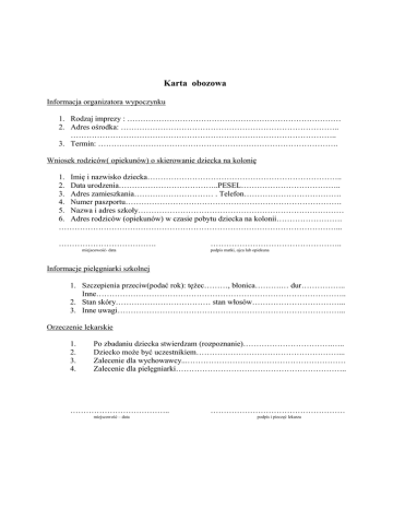 Karta obozowa Informacja organizatora wypoczynku 1. Rodzaj imprezy : ……………………………………………………………………… 2. Adres ośrodka: ……………………………………………………………………….. ……………………………………………………………………………………….. 3. Termin: ………………………………………………………………………………. Wniosek rodziców( opiekunów) o skierowanie dziecka na kolonię 1. Imię i nazwisko dziecka……………………………………………………………….. 2. Data urodzenia………………………………..PESEL……………………………….. 3. Adres zamieszkania………………………… . Telefon………………………………. 4. Numer paszportu………………………………………………………………………. 5. Nazwa i adres szkoły…………………………………………………………………… 6. Adres rodziców (opiekunów) w czasie pobytu dziecka na kolonii……………………. ……………………………………………………………………………………………... ………………………………. miejscowość- data ………………………………………….. podpis matki, ojca lub opiekuna Informacje pielęgniarki szkolnej 1. Szczepienia przeciw(podać rok): tężec………, błonica……….… dur…………….. Inne………………………………………………………………………………….. 2. Stan skóry……………………………… stan włosów……………………………... 3. Inne uwagi…………………………………………………………………………... Orzeczenie lekarskie 1. 2. 3. 4. Po zbadaniu dziecka stwierdzam (rozpoznanie)…………………………….….. Dziecko może być uczestnikiem………………………………………………... Zalecenie dla wychowawcy...…………………………………………………… Zalecenie dla pielęgniarki……………………………………………………….. ……………………………….. miejscowość – data …………………………………………… podpis i pieczęć lekarza Informacja rodziców ( opiekunów) o dziecku: 1. Przebyte choroby ( podać w którym roku życia): Odra……………….., ospa………… różyczka……………….., świnka……………….., szkarlatyna……………………….. żółtaczka zakaźna……………….,choroby nerek (jakie)………………………………. astma……………….., padaczka……………….., inne choroby……………………… 2. Dziecka występowały w ostatnim roku lub występują obecnie: drgawki, utraty przytomności, zaburzenia równowagi, omdlenia, częste bóle brzucha, częste bóle głowy, lęki nocne, trudności w zasypianiu, tiki, moczenie nocne, wymioty, krwawienie z nosa, przewlekły kaszel( katar lub anginy), duszności, bóle stawów, szybkie męczenie się, niedosłuch, jąkanie, inne………………………………………………...…………… 3. Czy dziecko przyjmuje stale leki. Jeżeli tak, to jakie i w jakich dawkach………………. 4. Dziecko jest: nieśmiałe, ma trudności w nawiązywaniu kontaktów, nadpobudliwe. Inne informacje o usposobieniu dziecka……………………………………………………… 5. Dziecko jest uczulone: tak-nie. Jeżeli tak, podać na co………………………………… 6. Jazdę autokarem znosi: dobrze – źle. 7. Inne uwagi o zdrowiu dziecka…………………………………………………………… W razie zagrożenia życia dziecka zgadzam się na jego leczenie szpitalne, zabiegi diagnostyczne, operacje. STWIERDZAM, ŻE PODAŁAM/ ŁEM WSZYSTKIE ZNANE MI INFORMACJE O DZIECKU, KTÓRE MOGĄ POMÓC W ZAPEWNIENIU MU WŁAŚCIWEJ OIPIEKI W CZASIE POBYTU NA KOLONII. ………………………………… miejscowość – data …………………………………………… podpis matki, ojca lub opiekuna Dodatkowe warunki uczestnictwa Uczestnik obozu zobowiązany jest uczestniczyć we wszystkich imprezach organizowanych przez wychowawców, stosować się do regulaminów obozu oraz poleceń wychowawców. 1. Uczestnik powinien zabrać ze sobą niezbędny ekwipunek (ubrania, obuwie, przybory toaletowe itp. 2. Organizatorzy nie ponoszą odpowiedzialności materialnej za sprzęt RTV i rzeczy wartościowe uczestników. 3. Uczestnik zobowiązany jest zabrać ze sobą odpowiedni dokument tożsamości ( paszport, legitymację szkolną). 4. W przypadku spożywania alkoholu, przebywania pod jego wpływem lub poważnego naruszenia regulaminu obozu, uczestnik zostanie wydalony z placówki wypoczynku na koszt własny.( rodzice przyjeżdżają i odbierają dziecko) 5. Uczestnik ponosi odpowiedzialność za szkody wyrządzone podczas pobytu na obozie 6. Niniejsze warunki są integralną częścią umowy kupna – sprzedaży.