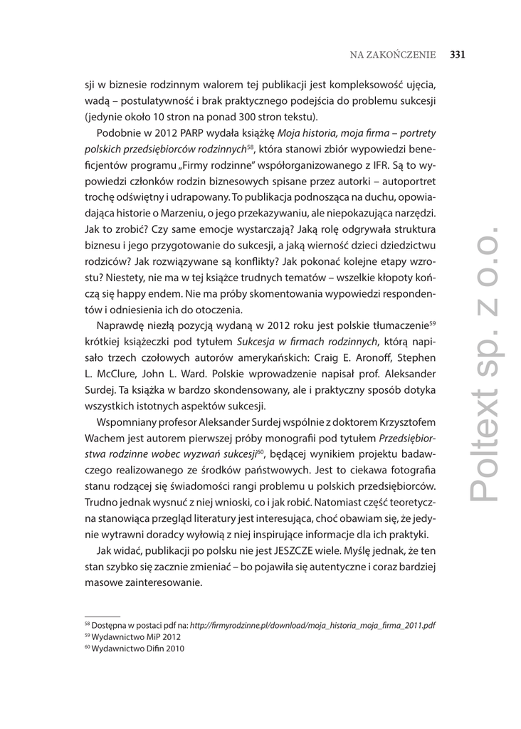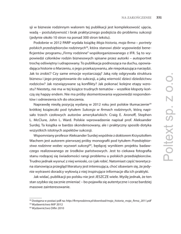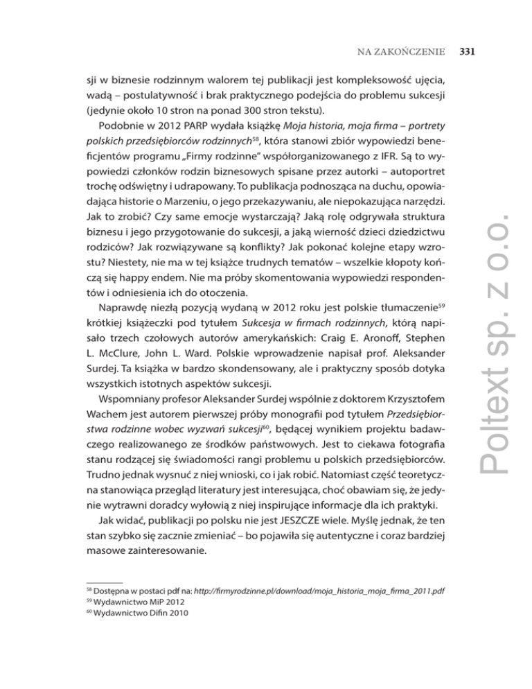 sji w biznesie rodzinnym walorem tej publikacji jest kompleksowość ujęcia, wadą – postulatywność i brak praktycznego podejścia do problemu sukcesji (jedynie około 10 stron na ponad 300 stron tekstu). Podobnie w 2012 PARP wydała książkę Moja historia, moja firma – portrety polskich przedsiębiorców rodzinnych58, która stanowi zbiór wypowiedzi beneficjentów programu „Firmy rodzinne” współorganizowanego z IFR. Są to wypowiedzi członków rodzin biznesowych spisane przez autorki – autoportret trochę odświętny i udrapowany. To publikacja podnosząca na duchu, opowiadająca historie o Marzeniu, o jego przekazywaniu, ale niepokazująca narzędzi. Jak to zrobić? Czy same emocje wystarczają? Jaką rolę odgrywała struktura biznesu i jego przygotowanie do sukcesji, a jaką wierność dzieci dziedzictwu rodziców? Jak rozwiązywane są konflikty? Jak pokonać kolejne etapy wzrostu? Niestety, nie ma w tej książce trudnych tematów – wszelkie kłopoty kończą się happy endem. Nie ma próby skomentowania wypowiedzi respondentów i odniesienia ich do otoczenia. Naprawdę niezłą pozycją wydaną w 2012 roku jest polskie tłumaczenie59 krótkiej książeczki pod tytułem Sukcesja w firmach rodzinnych, którą napisało trzech czołowych autorów amerykańskich: Craig E. Aronoff, Stephen L. McClure, John L. Ward. Polskie wprowadzenie napisał prof. Aleksander Surdej. Ta książka w bardzo skondensowany, ale i praktyczny sposób dotyka wszystkich istotnych aspektów sukcesji. Wspomniany profesor Aleksander Surdej wspólnie z doktorem Krzysztofem Wachem jest autorem pierwszej próby monografii pod tytułem Przedsiębiorstwa rodzinne wobec wyzwań sukcesji60, będącej wynikiem projektu badawczego realizowanego ze środków państwowych. Jest to ciekawa fotografia stanu rodzącej się świadomości rangi problemu u polskich przedsiębiorców. Trudno jednak wysnuć z niej wnioski, co i jak robić. Natomiast część teoretyczna stanowiąca przegląd literatury jest interesująca, choć obawiam się, że jedynie wytrawni doradcy wyłowią z niej inspirujące informacje dla ich praktyki. Jak widać, publikacji po polsku nie jest JESZCZE wiele. Myślę jednak, że ten stan szybko się zacznie zmieniać – bo pojawiła się autentyczne i coraz bardziej masowe zainteresowanie. 58 Dostępna w postaci pdf na: http://firmyrodzinne.pl/download/moja_historia_moja_firma_2011.pdf Wydawnictwo MiP 2012 60 Wydawnictwo Difin 2010 59 331 Poltext sp. z o.o. NA ZAKOŃCZENIE