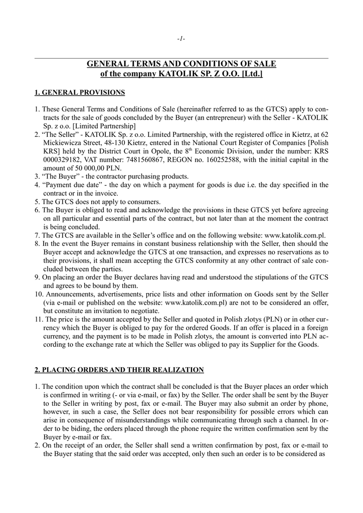 -1- GENERAL TERMS AND CONDITIONS OF SALE of the company KATOLIK SP. Z O.O. [Ltd.] 1. GENERAL PROVISIONS 1. These General Terms and Conditions of Sale (hereinafter referred to as the GTCS) apply to contracts for the sale of goods concluded by the Buyer (an entrepreneur) with the Seller - KATOLIK Sp. z o.o. [Limited Partnership] 2. “The Seller” - KATOLIK Sp. z o.o. Limited Partnership, with the registered office in Kietrz, at 62 Mickiewicza Street, 48-130 Kietrz, entered in the National Court Register of Companies [Polish KRS] held by the District Court in Opole, the 8th Economic Division, under the number: KRS 0000329182, VAT number: 7481560867, REGON no. 160252588, with the initial capital in the amount of 50 000,00 PLN. 3. “The Buyer” - the contractor purchasing products. 4. “Payment due date” - the day on which a payment for goods is due i.e. the day specified in the contract or in the invoice. 5. The GTCS does not apply to consumers. 6. The Buyer is obliged to read and acknowledge the provisions in these GTCS yet before agreeing on all particular and essential parts of the contract, but not later than at the moment the contract is being concluded. 7. The GTCS are available in the Seller’s office and on the following website: www.katolik.com.pl. 8. In the event the Buyer remains in constant business relationship with the Seller, then should the Buyer accept and acknowledge the GTCS at one transaction, and expresses no reservations as to their provisions, it shall mean accepting the GTCS conformity at any other contract of sale concluded between the parties. 9. On placing an order the Buyer declares having read and understood the stipulations of the GTCS and agrees to be bound by them. 10. Announcements, advertisements, price lists and other information on Goods sent by the Seller (via e-mail or published on the website: www.katolik.com.pl) are not to be considered an offer, but constitute an invitation to negotiate. 11. The price is the amount accepted by the Seller and quoted in Polish zlotys (PLN) or in other currency which the Buyer is obliged to pay for the ordered Goods. If an offer is placed in a foreign currency, and the payment is to be made in Polish zlotys, the amount is converted into PLN according to the exchange rate at which the Seller was obliged to pay its Supplier for the Goods. 2. PLACING ORDERS AND THEIR REALIZATION 1. The condition upon which the contract shall be concluded is that the Buyer places an order which is confirmed in writing (- or via e-mail, or fax) by the Seller. The order shall be sent by the Buyer to the Seller in writing by post, fax or e-mail. The Buyer may also submit an order by phone, however, in such a case, the Seller does not bear responsibility for possible errors which can arise in consequence of misunderstandings while communicating through such a channel. In order to be biding, the orders placed through the phone require the written confirmation sent by the Buyer by e-mail or fax. 2. On the receipt of an order, the Seller shall send a written confirmation by post, fax or e-mail to the Buyer stating that the said order was accepted, only then such an order is to be considered as -2- acknowledged. The only circumstance such a written confirmation is not required, is when the Seller and the Buyer remain in permanent business cooperation, and then the fact of the order’s acceptance is its actual realization. Permanent business cooperation shall be understood to mean placing at least the second order. 3. Subject to exceptions stipulated in these GTCS, since the moment the order is acknowledged by the Seller, it must not be cancelled without the Seller’s agreement. In the event the Buyer intends to cancel its order, it shall bear all costs already incurred by the Seller in connection with the accepted order and its preparation. 4. An order should bear at least: the Buyer’s data (name of the company/firm, its address, VAT number, phone number), the quantity and the kind of ordered Goods, a preferred date and conditions of the Goods receipt (delivery). The Seller reserves the right to cancel an order in the event there is no contact with the Buyer. 5. Orders are accepted from Monday through Friday, from 8:00 to 16:00. 6. The subjects of the contracts of sale are the Goods which are currently offered by the Seller or the ones brought in by the Buyer’s special order. Some of the offered Goods can be out of the Seller’s stock. Upon the terms provided below in sub-paragraph 7, in the case of ordering Goods which are not in stock, the Seller shall inform the Buyer about their unavailability and give their estimated delivery time. The above complies also to the Goods which are available only by special order. 7. If the Parties do not decide otherwise, the order’s realization period is from 7 to 14 business days since the day the Seller received the order. Delivery of Goods by the Seller is executed subject to timely and proper internal delivery. In the case the ordered Goods are not in stock, the Seller shall inform the Buyer by e-mail or fax, within 7 working days since the day the order was placed, about the estimated availability time/date concerning these Goods. If, within two days, the Seller will not receive a statement from the Buyer by fax or e-mail saying that the Buyer does not accept these conditions, it shall be deemed that the Buyer agrees to conclude a contract on these conditions. 8. If the delivery time is prolonged or changed by the Buyer or in the case the Goods are not accepted by the Buyer, the Seller has the right to charge the Buyer with transport and storage costs in the amount of 0,1% to 5% of the Goods’ value - depending on the shelf-life of the Goods, for each day the Goods are stored. 9. The Seller at its own discretion, reserves the right to suspend the realization of the order in full or in parts, or to renounce from the realization of the further part of the order in full or in parts, in the eve
