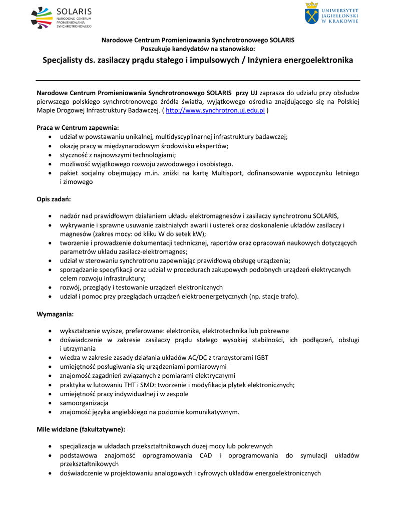 Narodowe Centrum Promieniowania Synchrotronowego SOLARIS Poszukuje kandydatów na stanowisko: Specjalisty ds. zasilaczy prądu stałego i impulsowych / Inżyniera energoelektronika Narodowe Centrum Promieniowania Synchrotronowego SOLARIS przy UJ zaprasza do udziału przy obsłudze pierwszego polskiego synchrotronowego źródła światła, wyjątkowego ośrodka znajdującego się na Polskiej Mapie Drogowej Infrastruktury Badawczej. ( http://www.synchrotron.uj.edu.pl ) Praca w Centrum zapewnia: udział w powstawaniu unikalnej, multidyscyplinarnej infrastruktury badawczej; okazję pracy w międzynarodowym środowisku ekspertów; styczność z najnowszymi technologiami; możliwość wyjątkowego rozwoju zawodowego i osobistego. pakiet socjalny obejmujący m.in. zniżki na kartę Multisport, dofinansowanie wypoczynku letniego i zimowego Opis zadań: nadzór nad prawidłowym działaniem układu elektromagnesów i zasilaczy synchrotronu SOLARIS, wykrywanie i sprawne usuwanie zaistniałych awarii i usterek oraz doskonalenie układów zasilaczy i magnesów (zakres mocy: od kliku W do setek kW); tworzenie i prowadzenie dokumentacji technicznej, raportów oraz opracowań naukowych dotyczących parametrów układu zasilacz-elektromagnes; udział w sterowaniu synchrotronu zapewniając prawidłową obsługę urządzenia; sporządzanie specyfikacji oraz udział w procedurach zakupowych podobnych urządzeń elektrycznych celem rozwoju infrastruktury; rozwój, przeglądy i testowanie urządzeń elektronicznych udział i pomoc przy przeglądach urządzeń elektroenergetycznych (np. stacje trafo). Wymagania: wykształcenie wyższe, preferowane: elektronika, elektrotechnika lub pokrewne doświadczenie w zakresie zasilaczy prądu stałego wysokiej stabilności, ich podłączeń, obsługi i utrzymania wiedza w zakresie zasady działania układów AC/DC z tranzystorami IGBT umiejętność posługiwania się urządzeniami pomiarowymi znajomość zagadnień związanych z pomiarami elektrycznymi praktyka w lutowaniu THT i SMD: tworzenie i modyfikacja płytek elektronicznych; umiejętność pracy indywidualnej i w zespole samoorganizacja znajomość języka angielskiego na poziomie komunikatywnym. Mile widziane (fakultatywne): specjalizacja w układach przekształtnikowych dużej mocy lub pokrewnych podstawowa znajomość oprogramowania CAD i oprogramowania do symulacji przekształtnikowych doświadczenie w projektowaniu analogowych i cyfrowych układów energoelektronicznych układów wiedza z zakresu budowy i zasady działania stacji transformatorowych uprawnienia SEP Grupa I do 15 kV Miejsce pracy: Kraków CV wraz z listem motywacyjnym proszę przysyłać na adres e-mail: [email protected] z tytułem Specjalista ds. zasilaczy prądu stałego. W CV proszę umieścić klauzulę: Wyrażam zgodę na przetwarzanie moich danych osobowych w celach rekrutacji, zgodnie z Ustawą z dn. 29 sierpnia 1997 r. o ochronie danych osobowych (Dz. U. z 2002 r. Nr 101, poz. 926 z późniejszymi zmianami). Zastrzegamy sobie prawo do kontaktu tylko z wybranymi Kandydatami.