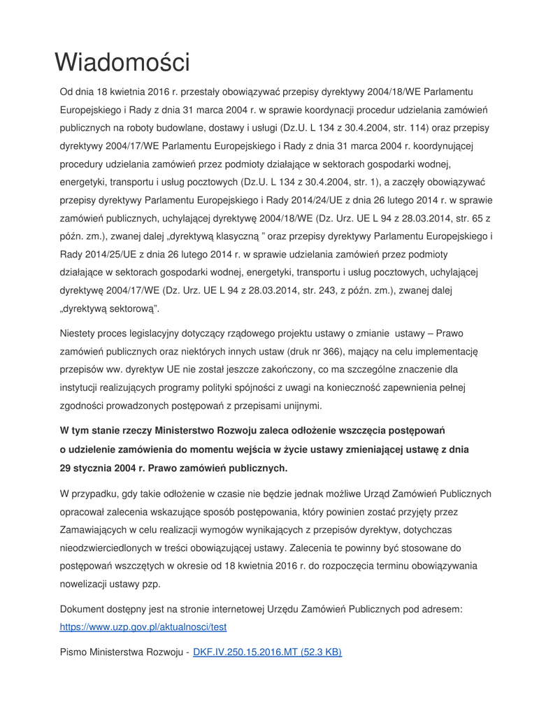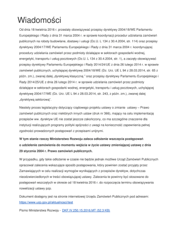 Wiadomości Od dnia 18 kwietnia 2016 r. przestały obowiązywać przepisy dyrektywy 2004/18/WE Parlamentu Europejskiego i Rady z dnia 31 marca 2004 r. w sprawie koordynacji procedur udzielania zamówień publicznych na roboty budowlane, dostawy i usługi (Dz.U. L 134 z 30.4.2004, str. 114) oraz przepisy dyrektywy 2004/17/WE Parlamentu Europejskiego i Rady z dnia 31 marca 2004 r. koordynującej procedury udzielania zamówień przez podmioty działające w sektorach gospodarki wodnej, energetyki, transportu i usług pocztowych (Dz.U. L 134 z 30.4.2004, str. 1), a zaczęły obowiązywać przepisy dyrektywy Parlamentu Europejskiego i Rady 2014/24/UE z dnia 26 lutego 2014 r. w sprawie zamówień publicznych, uchylającej dyrektywę 2004/18/WE (Dz. Urz. UE L 94 z 28.03.2014, str. 65 z późn. zm.), zwanej dalej „dyrektywą klasyczną ” oraz przepisy dyrektywy Parlamentu Europejskiego i Rady 2014/25/UE z dnia 26 lutego 2014 r. w sprawie udzielania zamówień przez podmioty działające w sektorach gospodarki wodnej, energetyki, transportu i usług pocztowych, uchylającej dyrektywę 2004/17/WE (Dz. Urz. UE L 94 z 28.03.2014, str. 243, z późn. zm.), zwanej dalej „dyrektywą sektorową”. Niestety proces legislacyjny dotyczący rządowego projektu ustawy o zmianie ustawy – Prawo zamówień publicznych oraz niektórych innych ustaw (druk nr 366), mający na celu implementację przepisów ww. dyrektyw UE nie został jeszcze zakończony, co ma szczególne znaczenie dla instytucji realizujących programy polityki spójności z uwagi na konieczność zapewnienia pełnej zgodności prowadzonych postępowań z przepisami unijnymi. W tym stanie rzeczy Ministerstwo Rozwoju zaleca odłożenie wszczęcia postępowań o udzielenie zamówienia do momentu wejścia w życie ustawy zmieniającej ustawę z dnia 29 stycznia 2004 r. Prawo zamówień publicznych. W przypadku, gdy takie odłożenie w czasie nie będzie jednak możliwe Urząd Zamówień Publicznych opracował zalecenia wskazujące sposób postępowania, który powinien zostać przyjęty przez Zamawiających w celu realizacji wymogów wynikających z przepisów dyrektyw, dotychczas nieodzwierciedlonych w treści obowiązującej ustawy. Zalecenia te powinny być stosowane do postępowań wszczętych w okresie od 18 kwietnia 2016 r. do rozpoczęcia terminu obowiązywania nowelizacji ustawy pzp. Dokument dostępny jest na stronie internetowej Urzędu Zamówień Publicznych pod adresem: https://www.uzp.gov.pl/aktualnosci/test Pismo Ministerstwa Rozwoju - DKF.IV.250.15.2016.MT (52.3 KB)
