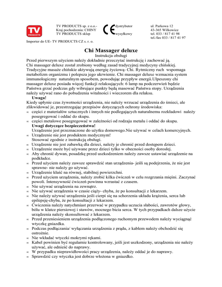TV PRODUCTS sp. z o.o.Kraj pochodzenia: CHINY TV PRODUCTS sklep dystrybutor wysyłkowy ul. Parkowa 12 43-365 Wilkowice tel. 033 / 817 41 98 tel./fax 033 / 817 41 97 Importer do UE- TV PRODUCTS CZ s. r. o. Chi Massager deluxe Instrukcja obsługi Przed pierwszym użyciem należy dokładnie przeczytać instrukcję i zachować ją. Chi massager deluxe został zrobiony według zasad tradycyjnej medycyny chińskiej. Tradycyjne masaże chińskie aktywują energię życiową- Chi. Rytmiczny ruch wspomaga metabolizm organizmu i polepsza jego ukrwienie. Chi massager deluxe wzmacnia system immunologiczny naturalnym sposobem, powodując przypływ energii.Ulpeszony chi massager deluxe posiada więcej funkcji relaksujących: 6 lamp na podczerwień będzie Państwa grzać podczas gdy wibrujące punkty będą masować Państwa stopy. Urządzenia należy używać rano do pobudzenia witalności i wieczorem dla relaksu. Uwaga! Kiedy upłynie czas żywotności urządzenia, nie należy wrzucać urządzenia do śmieci, ale zlikwidować je, przestrzegając przepisów dotyczących ochrony środowiska: • części z materiałów sztucznych i innych nie podlegających naturalnemu rozkładowi należy posegregować i oddać do skupu. • części metalowe posegregować w zależności od rodzaju metalu i oddać do skupu. Uwagi dotyczące bezpieczeństwa! Urządzenie jest przeznaczone do użytku domowego.Nie używać w celach komercyjnych. • Urządzenie nie jest produktem medycznym! Stosować zgodnie z instrukcją obsługi. • Urządzenie nie jest zabawką dla dzieci, należy je chronić przed dostępem dzieci. • Urządzenie może być używane przez dzieci tylko w obecności osoby dorosłej. • Aby chronić dywan, posadzkę przed uszkodzeniem należy zawsze ustawiać urządzenie na podkładce. • Przed użyciem należy zawsze sprawdzić stan urządzenia- jeśli są podejrzenia, że nie jest sprawne- nie należy go używać. • Urządzenie kłaść na równej, stabilnej powierzchni. • Przed użyciem urządzenia, należy zrobić kilka ćwiczeń w celu rozgrzania mięśni. Zaczynać powoli. Intensywność ćwiczeń powinna wzrastać z czasem. • Nie używać urządzenia na zewnątrz. • Nie używać urządzenia w czasie ciąży- chyba, że po konsultacji z lekarzem. • Nie należy używać urządzenia jeśli cierpi się na schorzenia układu krążenia, serca lub epilepsję-chyba, że po konsultacji z lekarzem. • Ćwiczenia należy natychmiast przerwać w przypadku uczucia słabości, zawrotów głowy, bólu w klatce piersiowej i stawów, mocnego bicia serca. W tych przypadkach dalsze użycie urządzenia należy skonsultować z lekarzem. • Przed przeniesieniem urządzenia podłączonego ruchomym przewodem należy wyciągnąć wtyczkę gniazdka. • Podczas podłączania/ wyłączania urządzenia z prądu, z kablem należy obchodzić się ostrożnie. • Nie wkładać wtyczki mokrymi rękami. • Kabel powinien być regularnie kontrolowany, jeśli jest uszkodzony, urządzenia nie należy używać, ale odnieść do naprawy. • W przypadku nieprawidłowości pracy urządzenia, należy oddać je do naprawy. • Sprawdzić czy wtyczka jest dobrze włożona w gniazdko. Chronić przed wilgocią. Chronić przed działaniem ekstremalnych temperatur (mniej niż 5˚ więcej niż 40˚) • Trzymać w bezpiecznej odległości od materiałów łatwopalnych. • Używać tylko oryginalnego sprzętu. • Przed czyszczeniem wyłączyć urządzenie z prądu. • Nie używać urządzenia jako stojaka na różne przedmioty. • Naprawę zlecać fachowcom. • Przestrzegać wskazówek dotyczących bezpieczeństwa. Użycie 1. położyć chi massager deluxe na równej, stabilnej powierzchni, tak aby wszystkie 4 gumowe nóżki były w stabilnej pozycji. 2. ubrać się wygodnie i ściągnąć obuwie. 3. przed rozpoczęciem ćwiczeń radzimy wypić szklankę wody, co korzystnie wpłynie na przemianę materii w organizmie. 4. podłączyć urządzenie do prądu. Położyć się na plecach. Pod dolną część łydki podłożyć wałek, na który nakłada się molitanową podkładkę. Nogi wyłożyć na podkładkę, w zasięgu ręki przygotować pilota. Funkcje chi Włączyć urządzenie naciśnięciem przycisku ON/ OFF na pilocie. Na czasowniku można ustawić wybrany czas ćwiczenia (1- 15 min.) do czasu przywyknięcia do ćwiczeń radzimy zacząć od 2- 3 min. Ćwiczyć należy 1 lub 2x dziennie- rano dla witalności, wieczorem dla relaksu. Z dnia na dzień można wydłużać czas ćwiczeń do 15 min. Po upłynięciu ustawionego czasu, urządzenie automatycznie się wyłączy. Nie należy od razu wstawać, ale poleżeć przez chwilę w pozycji relaksującej, dzięki czemu energia chi będzie lepiej przepływać przez Państwa ciało. Uwaga: po włączeniu urządzenia należy przytrzymać przycisk ON/ OFF przez 3 sekundy. Warianty ćwiczeń 1. metoda relaksacyjna: położyć się na plecach, ręce włożyć pod siebie, wewnętrzną częścią dłoni w górę. Położenie to działa relaksująco. Pomaga na bezsenność i stres. Wibracje przechodzą od stóp do głów. 2. ułożyć się na plecach ręce włożyć za głowę. Ćwiczy się w ten sposób mięśnie ramion i klatki piersiowej i uwalnia się napięcie mięśniowe. 3. metoda stretchingowa.: położyć się na plecach i wyciągnąć ręce do tyłu, za głowę. Metoda ta oddziałuje dobrze na system nerwowy. 4. Jeśli poczują Państwo słabość lub zawroty głowy, należy natychmiast przerwać ćwiczenie. 10 min. ćwiczenia na chi massager deluxe odpowiada 1 godzinnemu spacerowi. Dlatego można ćwiczyć też bardziej intensywnie. Można odczuwać lekki ból- jak po godzinnym spacerze. Po kilku razach wykonywania ćwiczeń ból powinien zniknąć. 5. Funkcja masażu podczerwienią. Włączyć urządzenie naciśnięciem przycisku ON/ OFF. Za pomocą przycisku na stoperze ustawić czas ćwiczeń od 1 min. do 15 min. Włączyć funkcję masażu podczerwienią przez wciśn