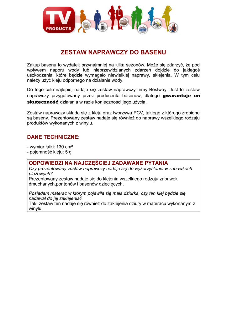 ZESTAW NAPRAWCZY DO BASENU Zakup basenu to wydatek przynajmniej na kilka sezonów. Może się zdarzyć, że pod wpływem naporu wody lub nieprzewidzianych zdarzeń dojdzie do jakiegoś uszkodzenia, które będzie wymagało niewielkiej naprawy, sklejenia. W tym celu należy użyć kleju odpornego na działanie wody. Do tego celu najlepiej nadaje się zestaw naprawczy firmy Bestway. Jest to zestaw naprawczy przygotowany przez producenta basenów, dlatego gwarantuje on skuteczność działania w razie konieczności jego użycia. Zestaw naprawczy składa się z kleju oraz tworzywa PCV, takiego z którego zrobione są baseny. Prezentowany zestaw nadaje się również do naprawy wszelkiego rodzaju produktów wykonanych z winylu. DANE TECHNICZNE: - wymiar łatki: 130 cm² - pojemność kleju: 5 g ODPOWIEDZI NA NAJCZĘŚCIEJ ZADAWANE PYTANIA Czy prezentowany zestaw naprawczy nadaje się do wykorzystania w zabawkach plażowych? Prezentowany zestaw nadaje się do klejenia wszelkiego rodzaju zabawek dmuchanych,pontonów i basenów dziecięcych. Posiadam materac w którym pojawiła się mała dziurka, czy ten klej będzie się nadawał do jej zaklejenia? Tak, zestaw ten nadaje się również do zaklejenia dziury w materacu wykonanym z winylu.