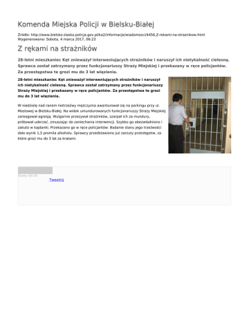 Komenda Miejska Policji w Bielsku-Białej Źródło: http://www.bielsko.slaska.policja.gov.pl/ka2/informacje/wiadomosci/4456,Z-rekami-na-straznikow.html Wygenerowano: Sobota, 4 marca 2017, 06:23 Z rękami na strażników 28-letni mieszkaniec Kęt znieważył interweniujących strażników i naruszył ich nietykalność cielesną. Sprawca został zatrzymany przez funkcjonariuszy Straży Miejskiej i przekazany w ręce policjantów. Za przestępstwa te grozi mu do 3 lat więzienia. 28-letni mieszkaniec Kęt znieważył interweniujących strażników i naruszył ich nietykalność cielesną. Sprawca został zatrzymany przez funkcjonariuszy Straży Miejskiej i przekazany w ręce policjantów. Za przestępstwa te grozi mu do 3 lat więzienia. W niedzielę nad ranem nietrzeźwy mężczyzna awanturował się na parkingu przy ul. Mostowej w Bielsku-Białej. Na widok umundurowanych funkcjonariuszy Straży Miejskiej zareagował agresją. Wulgarnie przezywał strażników, szarpał ich za mundury, próbował uderzać, zmuszając do zaniechania interwencji. Szybko go obezwładniono i zakuto w kajdanki. Przekazano go w ręce policjantów. Badanie stanu jego trzeźwości dało wynik 1,5 promila alkoholu. Sprawcy przedstawiono już zarzuty przestępstw, za które grozi mu do 3 lat za kratami. Ocena: 0/5 (0) Tweetnij