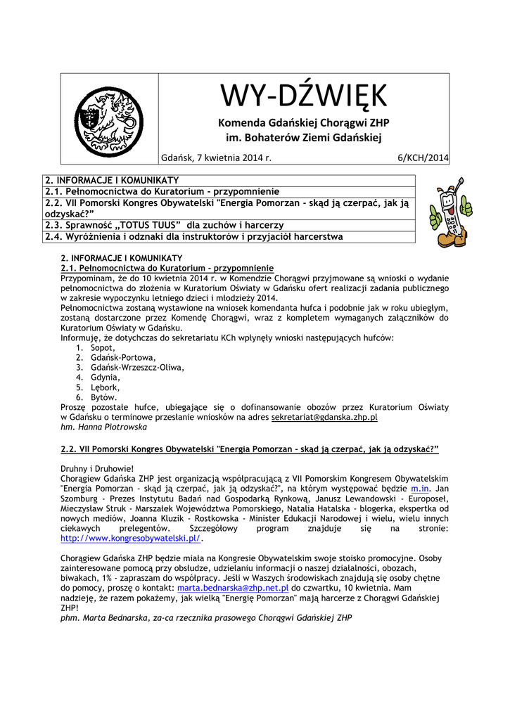 WY-DŹWIĘK Komenda Gdańskiej Chorągwi ZHP im. Bohaterów Ziemi Gdańskiej Gdańsk, 7 kwietnia 2014 r. 6/KCH/2014 2. INFORMACJE I KOMUNIKATY 2.1. Pełnomocnictwa do Kuratorium - przypomnienie 2.2. VII Pomorski Kongres Obywatelski "Energia Pomorzan - skąd ją czerpać, jak ją odzyskać?” 2.3. Sprawność „TOTUS TUUS” dla zuchów i harcerzy 2.4. Wyróżnienia i odznaki dla instruktorów i przyjaciół harcerstwa 2. INFORMACJE I KOMUNIKATY 2.1. Pełnomocnictwa do Kuratorium - przypomnienie Przypominam, że do 10 kwietnia 2014 r. w Komendzie Chorągwi przyjmowane są wnioski o wydanie pełnomocnictwa do złożenia w Kuratorium Oświaty w Gdańsku ofert realizacji zadania publicznego w zakresie wypoczynku letniego dzieci i młodzieży 2014. Pełnomocnictwa zostaną wystawione na wniosek komendanta hufca i podobnie jak w roku ubiegłym, zostaną dostarczone przez Komendę Chorągwi, wraz z kompletem wymaganych załączników do Kuratorium Oświaty w Gdańsku. Informuję, że dotychczas do sekretariatu KCh wpłynęły wnioski następujących hufców: 1. Sopot, 2. Gdańsk-Portowa, 3. Gdańsk-Wrzeszcz-Oliwa, 4. Gdynia, 5. Lębork, 6. Bytów. Proszę pozostałe hufce, ubiegające się o dofinansowanie obozów przez Kuratorium Oświaty w Gdańsku o terminowe przesłanie wniosków na adres [email protected] hm. Hanna Piotrowska 2.2. VII Pomorski Kongres Obywatelski "Energia Pomorzan - skąd ją czerpać, jak ją odzyskać?” Druhny i Druhowie! Chorągiew Gdańska ZHP jest organizacją współpracującą z VII Pomorskim Kongresem Obywatelskim "Energia Pomorzan - skąd ją czerpać, jak ją odzyskać?", na którym występować będzie m.in. Jan Szomburg - Prezes Instytutu Badań nad Gospodarką Rynkową, Janusz Lewandowski - Europoseł, Mieczysław Struk - Marszałek Województwa Pomorskiego, Natalia Hatalska - blogerka, ekspertka od nowych mediów, Joanna Kluzik - Rostkowska - Minister Edukacji Narodowej i wielu, wielu innych ciekawych prelegentów. Szczegółowy program znajduje się na stronie: http://www.kongresobywatelski.pl/. Chorągiew Gdańska ZHP będzie miała na Kongresie Obywatelskim swoje stoisko promocyjne. Osoby zainteresowane pomocą przy obsłudze, udzielaniu informacji o naszej działalności, obozach, biwakach, 1% - zapraszam do współpracy. Jeśli w Waszych środowiskach znajdują się osoby chętne do pomocy, proszę o kontakt: [email protected] do czwartku, 10 kwietnia. Mam nadzieję, że razem pokażemy, jak wielką "Energię Pomorzan" mają harcerze z Chorągwi Gdańskiej ZHP! phm. Marta Bednarska, za-ca rzecznika prasowego Chorągwi Gdańskiej ZHP 2.3. Sprawność „TOTUS TUUS” dla zuchów i harcerzy Przypominamy o możliwości zdobywania nowej sprawności “TOTUS TUUS” – mamy nadzieję, że dzięki niej zuchy i harcerze poznają życie bł. Jana Pawła II i przygotują się do aktywnego i świadomego przeżycia zbliżającej się Kanonizacji Papieża Polaka. W Wy-Dźwięku nr 2/2014 dostępnym na stronie: http://gdanska.zhp.pl/?main=7&sub=74&item=536 znajdziecie symbole sprawności, wymagania oraz propozycje, które można wykorzystać do zorganizowania zbiórki dla całej Gromady/Drużyny. Sprawność można zdobywać w dowolnym terminie, ale dla osób, które zdobędą ją w tym roku harcerskim – plakietka sprawności jest gratis. Prosimy drużynowych o przysłanie wykazu osób, które podjęły się tego zadania na adres: [email protected] (do dnia 15.05.2014). Pod tym samym adresem czekamy również na informacje i ciekawostki, które będą efektem pracy Waszych zuchów i harcerzy zdobywających sprawność “TOTUS TUUS”. Przygotowania do zbliżającej się Uroczystości oraz zdobywanie sprawności, to również okazja do zacieśnienia lub nawiązania współpracy z Waszymi Kapelanami. Jeżeli potrzebujecie pomocy w “skontaktowaniu się” z Księdzem – piszcie na adres: [email protected] , [email protected] lub dzwońcie: 501159722 hm. Anna Deptuła. Życzymy powodzenia! ... i tradycyjnie zachęcamy do kontaktu z nami. Zespół Wychowania Duchowego 2.4. Wyróżnienia i odznaki dla instruktorów i przyjaciół harcerstwa Druhno Komendantko, Druhu Komendancie! Przypominamy o możliwości składania wniosków o przyznanie wyróżnień i odznak instruktorom i przyjaciołom harcerstwa. Warto rozważyć przyznanie odznaczeń szczególnie przed zbliżającymi się zjazdami w hufcach. Więcej szczegółów, regulaminy i wnioski do pobrania na www.gdansk.zhp.pl > dokumenty > nagrody i wyróżnienia Wyróżnienie – „Instruktorskie debiuty” 1. 2. Wyróżnienie przyznawane jest drużynowym ZHP w stopniu przewodnika/przewodniczki, którzy odnieśli pierwsze sukcesy wychowawcze a ich postawa jest godna do naśladowania. Wyróżnienie może być przyznane instruktorom nie później niż dwa lata po złożeniu Zobowiązania Instruktorskiego. Honorowa Odznaka – „Zasłużony Instruktor Chorągwi Gdańskiej ZHP” 1. 2. Odznakę przyznaje się instruktorom ZHP w stopniu minimum podharcmistrza, którzy swoją działalnością wnieśli wkład do funkcjonowania i rozwoju Chorągwi Gdańskiej ZHP - wspólnoty hufców i instruktorów. W szczególności wymaga się, by kandydat do Odznaki spełniał łącznie następujące warunki: a. pracował na funkcji instruktorskiej przez okres co najmniej 6 lat, b. kierował zadaniem programowym lub kursem instruktorskim przynajmniej na poziomie hufca, c. pełnił funkcje instruktorskie na obozie harcerskim, kolonii zuchowej, bądź zimowisku, d. pozyskał środki dla harcerskiej działalności, e. był wyróżniającym się instruktorem na terenie chorągwi lub hufca. Odznaka „Przyjaciel Chorągwi Gdańskiej ZHP” 1. Odznakę przyznaje się osobom, które przez wiele lat, systematycznie wspierały działalność Chorągwi Gdańskiej ZHP. phm. Dorota Urbanowicz, członek Komendy Chorągwi Gdańskiej ZHP