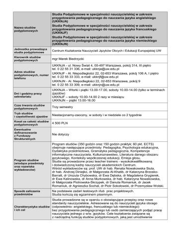 Nazwa studiów podyplomowych Studia Podyplomowe w specjalności nauczycielskiej w zakresie przygotowania pedagogicznego do nauczania języka angielskiego (UKKNJA) Studia Podyplomowe w specjalności nauczycielskiej w zakresie przygotowania pedagogicznego do nauczania języka francuskiego (UKKNJF) Studia Podyplomowe w specjalności nauczycielskiej w zakresie przygotowania pedagogicznego do nauczania języka niemieckiego (UKKNJN) Jednostka prowadząca studia podyplomowe Centrum Kształcenia Nauczycieli Języków Obcych i Edukacji Europejskiej UW Kierownik studiów podyplomowych mgr Marek Biedrzycki Adres studiów podyplomowych, numer telefonu UKKNJA - ul. Nowy Świat 4, 00-497 Warszawa, pokój 314, III piętro tel. 0 22 55 31 336, e-mail: [email protected] UKKNJF - Al. Niepodległości 22, 02-653 Warszawa, pokój 106 A, I piętro tel. 0 22 55 33 333, e-mail: [email protected] UKKNJN - Al. Niepodległości 22, 02-653 Warszawa, pokój 9 tel. 0 22 55 33 309, e-mail: [email protected] Dni i godziny pracy sekretariatu UKKNJA – Wtorki i piątki 13.00-17.00, soboty 10.00-14.00 (tylko w terminach zjazdów) UKKNJF – soboty 10.00-14.00 2 razy w miesiącu UKKNJN – piątki 13.00-16.00 Czas trwania studiów podyplomowych Trzy semestry Tryb studiów i częstotliwość zjazdów Niestacjonarny-zaoczny, w soboty i w niedziele co 2 tygodnie Koszt za całość studiów podyplomowych 4 500 PLN Ewentualne dofinansowanie z Funduszy Strukturalnych Nie dotyczy Program studiów (wiodące przedmioty oraz nazwiska wykładowców) Program studiów (350 godzin oraz 150 godzin praktyk; 60 pkt. ECTS) obejmuje następujące przedmioty: Pedagogika, Psychologia edukacyjna, Dydaktyka przedmiotowa, Gramatyka pedagogiczna, Kompetencje informatyczne nauczyciela, Kulturoznawstwo, Literatura danego obszaru językowego, Konteksty współczesnej edukacji, Emisja głosu. Studia są prowadzone przez teacher trainers - wysokokwalifikowaną i doświadczoną kadrę nauczycieli akademickich Centrum. Wśród wykładowców są: prof. UW dr hab. Renata Nowakowska Siuta, dr hab. Andrzej Diniejko, dr Małgorzata Al-Khatib, dr Katarzyna BrzoskoBarratt, dr Urszula Chybowska, dr Ewa Dębska, dr Magdalena Grygierek, dr Ewa Kalinowska, dr Anna Murkowska, dr hab. Katarzyna Nowakowska, dr Małgorzata Piotrowska-Skrzypek, dr Danuta Romaniuk, dr Jacek Romaniuk, dr Agnieszka Sochal, dr Piotr Sokołowski, dr Przemysław Wolski. Sposób zaliczania przedmiotów Na podstawie zadań testowych i/lub prac projektowych. Studia kończą się egzaminem pisemnym. Studia prowadzone są w oparciu o obowiązujące przepisy oraz nowe standardy nauczycielskie. Adresowane są do nauczycieli języka obcego Charakterystyka studiów (odpowiednio: angielskiego, francuskiego lub niemieckiego) i ich cel bez przygotowania pedagogicznego lub osób zamierzających podjąć pracę nauczyciela jednego z w/w. języków. Cele kształcenia związane są z nadrzędną funkcją studiów podyplomowych, jaką jest umożliwienie uczestnikom zdobycia zarówno kompetencji, jak i formalnie uznawanych kwalifikacji uprawniających do wykonywania zawodu nauczyciela języka angielskiego, francuskiego lub niemieckiego dla wszystkich czterech etapów szkolnych/szczebli edukacyjnych w polskim systemie szkolnictwa. Sylwetka absolwenta Absolwent studiów będzie przygotowany do kompleksowej realizacji dydaktycznych, wychowawczych i opiekuńczych zadań szkoły. Będzie posiadał kwalifikacje w zakresie: - wybranej specjalności językowej (nauczanie języka angielskiego lub nauczanie języka francuskiego lub nauczanie języka niemieckiego), w zakresie pozwalającym na przekazywanie jej w sposób kompetentny oraz na samodzielne jej pogłębianie i aktualizację, a także na integrowanie jej z innymi dziedzinami wiedzy, - psychologii i pedagogiki wieku szkolnego, umożliwiającej pełnienie funkcji wychowawczych i opiekuńczych, wspieranie wszechstronnego rozwoju uczniów, indywidualizowanie procesu nauczania, zaspokajanie szczególnych potrzeb edukacyjnych uczniów, organizowanie życia społecznego na poziomie klasy, szkoły i środowiska lokalnego, współpracę z innymi nauczycielami, rodzicami i społecznością lokalną, - dydaktyki przedmiotowej na każdym z czterech szkolnych etapów edukacyjnych, w stopniu umożliwiającym skuteczne prowadzenie lekcji, rozbudzanie zainteresowań poznawczych oraz wspieranie rozwoju intelektualnego uczniów przez umiejętny dobór metod aktywizujących, technik nauczania i środków dydaktycznych, a także badanie i ocenianie osiągnięć uczniów oraz własnej praktyki, - posługiwania się technologią informacyjną, w tym jej wykorzystywania w nauczaniu języka obcego. Absolwent studiów podyplomowych będzie również przygotowany do podejmowania działań upowszechniających wzory dobrej praktyki pedagogicznej oraz do kierowania własnym rozwojem zawodowym i osobowym. Wymagany od absolwenta poziom języka obcego warunkujący pełne kwalifikacje to co najmniej C1 ESOKJ. Rekrutacja: dwa razy w roku akademickim (styczeń, wrzesień) Wszystkie wymagane dokumenty Podanie o przyjęcie na studia (druk do pobrania w sekretariacie oraz na stronach internetowych poszczególnych Kolegiów), życiorys, 1 zdjęcie, odpis dyplomu ukończenia studiów II stopnia oraz jego kserokopia, kserokopia certyfikatu potwierdzającego znajomość języka angielskiego, francuskiego lub niemieckiego oraz oryginał do wglądu, kserokopia dowodu osobistego oraz oryginał do wglądu. Wymagany poziom znajomości języka obcego warunkujący przyjęcie na studia podyplomowe: co najmniej B2 według Europejskiego Systemu Opisu Kształcenia Językowego (ESOKJ) Osoby ze znajomością języka obcego, które nie posiadają certyfikatu obowiązuje rozmowa kwalifikacyjna potwierdzająca ich biegłość językową. Jednocześnie kandydatom rekomenduje się przystąpienie do kursu danego języka obcego organizowanego przez Szkołę Języków Obcych UW przygotowującego do egzaminów certyfikacy