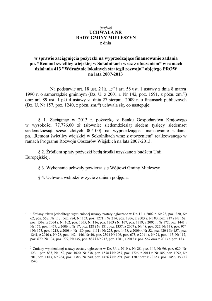 (projekt) UCHWAŁA NR RADY GMINY MIELESZYN z dnia w sprawie zaciągnięcia pożyczki na wyprzedzające finansowanie zadania pn. ”Remont świetlicy wiejskiej w Sokolnikach wraz z otoczeniem” w ramach działania 413 ”Wdrażanie lokalnych strategii rozwoju” objętego PROW na lata 2007-2013 Na podstawie art. 18 ust. 2 lit. „c” i art. 58 ust. 1 ustawy z dnia 8 marca 1990 r. o samorządzie gminnym (Dz. U. z 2001 r. Nr 142, poz. 1591, z późn. zm. 1)) oraz art. 89 ust. 1 pkt 4 ustawy z dnia 27 sierpnia 2009 r. o finansach publicznych (Dz. U. Nr 157, poz. 1240, z późn. zm.2)) uchwala się, co następuje: § 1. Zaciągnąć w 2013 r. pożyczkę z Banku Gospodarstwa Krajowego w wysokości 77.776,00 zł (słownie: siedemdziesiąt siedem tysięcy siedemset siedemdziesiąt sześć złotych 00/100) na wyprzedzające finansowanie zadania pn. „Remont świetlicy wiejskiej w Sokolnikach wraz z otoczeniem” realizowanego w ramach Programu Rozwoju Obszarów Wiejskich na lata 2007-2013. § 2. Źródłem spłaty pożyczki będą środki uzyskane z budżetu Unii Europejskiej. § 3. Wykonanie uchwały powierza się Wójtowi Gminy Mieleszyn. § 4. Uchwała wchodzi w życie z dniem podjęcia. 1 ) 2 ) Zmiany tekstu jednolitego wymienionej ustawy zostały ogłoszone w Dz. U. z 2002 r. Nr 23, poz. 220, Nr 62, poz. 558, Nr 113, poz. 984, Nr 153, poz. 1271 i Nr 214, poz. 1806, z 2003 r. Nr 80, poz. 717 i Nr 162, poz. 1568, z 2004 r. Nr 102, poz. 1055, Nr 116, poz. 1203 i Nr 167, poz. 1759, z 2005 r. Nr 172, poz. 1441 i Nr 175, poz. 1457, z 2006 r. Nr 17, poz. 128 i Nr 181, poz. 1337, z 2007 r. Nr 48, poz. 327, Nr 138, poz. 974 i Nr 173, poz. 1218, z 2008 r. Nr 180, poz. 1111 i Nr 223, poz. 1458, z 2009 r. Nr 52, poz. 420 i Nr 157, poz. 1241, z 2010 r. Nr 28, poz. 142 i 146, Nr 40, poz. 230 i Nr 106, poz. 675, z 2011 r. Nr 21, poz. 113, Nr 117, poz. 679, Nr 134, poz. 777, Nr 149, poz. 887 i Nr 217, poz. 1281, z 2012 r. poz. 567 oraz z 2013 r. poz. 153. Zmiany wymienionej ustawy zostały ogłoszone w Dz. U. z 2010 r. Nr 28, poz. 146, Nr 96, poz. 620, Nr 123, poz. 835, Nr 152, poz. 1020, Nr 238, poz. 1578 i Nr 257, poz. 1726, z 2011 r. Nr 185, poz. 1092, Nr 201, poz. 1183, Nr 234, poz. 1386, Nr 240, poz. 1426 i Nr 291, poz. 1707 oraz z 2012 r. poz. 1456, 1530 i 1548. UZASADNIENIE do uchwały Nr Rady Gminy Mieleszyn z dnia Gmina Mieleszyn realizuje zadanie w ramach działania 413 „Wdrażanie lokalnych strategii rozwoju” objętego PROW na lata 2007-2013 zgodnie z podpisaną umową o przyznanie pomocy z Samorządem Województwa Wielkopolskiego na realizację zadania pn. „Remont świetlicy wiejskiej w Sokolnikach wraz z otoczeniem”. W świetle zapisu art. 89 ust. 1 pkt 4 ustawy z dnia 27 sierpnia 2009 r. o finansach publicznych (Dz. U. Nr 157, poz. 1240, z późn. zm.) jednostki samorządu terytorialnego mogą zaciągać pożyczki na wyprzedzające finansowanie działań finansowanych ze środków pochodzących z budżetu Unii Europejskiej. Zgodnie z uchwałą Nr XIV/115/2012 Rady Gminy Mieleszyn z dnia 28 grudnia 2012 r. w sprawie uchwały budżetowej na rok 2013 planowane jest zaciągnięcie kredytu na wyprzedzające finansowanie powyższego zadania. W powyższym stanie rzeczy podjęcie przedmiotowej uchwały jest w pełni uzasadnione.