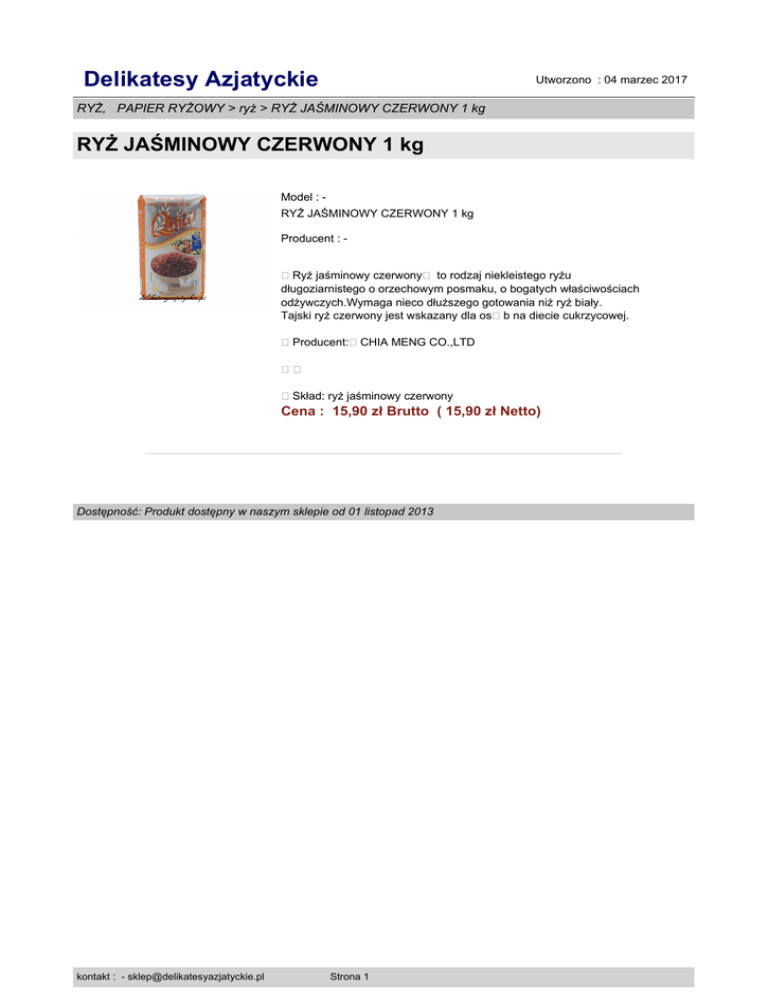 Delikatesy Azjatyckie Utworzono : 04 marzec 2017 RYŻ, PAPIER RYŻOWY > ryż > RYŻ JAŚMINOWY CZERWONY 1 kg RYŻ JAŚMINOWY CZERWONY 1 kg Model : RYŻ JAŚMINOWY CZERWONY 1 kg Producent : Ryż jaśminowy czerwony� to rodzaj niekleistego ryżu długoziarnistego o orzechowym posmaku, o bogatych właściwościach odżywczych.Wymaga nieco dłuższego gotowania niż ryż biały. Tajski ryż czerwony jest wskazany dla os�b na diecie cukrzycowej. Producent:�CHIA MENG CO.,LTD � Skład: ryż jaśminowy czerwony Cena : 15,90 zł Brutto ( 15,90 zł Netto) Dostępność: Produkt dostępny w naszym sklepie od 01 listopad 2013 kontakt : - [email protected] Strona 1