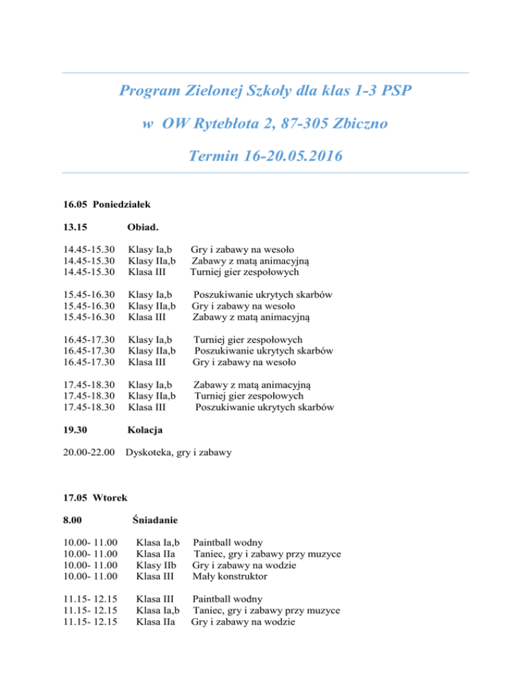 Program Zielonej Szkoły dla klas 1-3 PSP w OW Rytebłota 2, 87-305 Zbiczno Termin 16-20.05.2016 16.05 Poniedziałek 13.15 Obiad. 14.45-15.30 14.45-15.30 14.45-15.30 Klasy Ia,b Klasy IIa,b Klasa III Gry i zabawy na wesoło Zabawy z matą animacyjną Turniej gier zespołowych 15.45-16.30 15.45-16.30 15.45-16.30 Klasy Ia,b Klasy IIa,b Klasa III Poszukiwanie ukrytych skarbów Gry i zabawy na wesoło Zabawy z matą animacyjną 16.45-17.30 16.45-17.30 16.45-17.30 Klasy Ia,b Klasy IIa,b Klasa III Turniej gier zespołowych Poszukiwanie ukrytych skarbów Gry i zabawy na wesoło 17.45-18.30 17.45-18.30 17.45-18.30 Klasy Ia,b Klasy IIa,b Klasa III Zabawy z matą animacyjną Turniej gier zespołowych Poszukiwanie ukrytych skarbów 19.30 Kolacja 20.00-22.00 Dyskoteka, gry i zabawy 17.05 Wtorek 8.00 Śniadanie 10.00- 11.00 10.00- 11.00 10.00- 11.00 10.00- 11.00 Klasa Ia,b Klasa IIa Klasy IIb Klasa III Paintball wodny Taniec, gry i zabawy przy muzyce Gry i zabawy na wodzie Mały konstruktor 11.15- 12.15 11.15- 12.15 11.15- 12.15 Klasa III Klasa Ia,b Klasa IIa Paintball wodny Taniec, gry i zabawy przy muzyce Gry i zabawy na wodzie 11.15- 12.15 Klasa IIb Mały konstruktor 12.30- 13.30 12.30- 13.30 12.30- 13.30 12.30- 13.30 Klasa IIb Klasa III Klasa Ia,b Klasa IIa Paintball wodny Taniec, gry i zabawy przy muzyce Gry i zabawy na wodzie Mały konstruktor 15.00- 16.00 15.00- 16.00 15.00- 16.00 15.00- 16.00 Klasa IIa Klasa IIb Klasa III Klasa Ia,b Paintball wodny Taniec, gry i zabawy przy muzyce Gry i zabawy na wodzie Mały konstruktor 16.30- 18.30 Team building klasy I-III 19.00- 21.00 Kolacja przy ognisku (gry i zabawy) 14.00 Obiad 18.05 Środa 8.15 Śniadanie Zwiedzamy Toruń godz. 9.15 - spotkanie z przewodnikami w Brodnicy, przejazd do Torunia godz. 10.45 - - zwiedzanie z przewodnikiem trasy "Toruń legend i mitów" - dziesiątki miejsc, dziesiątki legend, opowieści, czasami wręcz niesamowitych i niewiarygodnych historii. W programie: Krzywa Wieża - Flisak - Ratusz Staromiejski - Dwór Artusa - Katedra Świętojańska - Zamek Krzyżacki - Smok toruński - Baszta Koci Łeb - kamienice - pierniki + Muzeum Piernika z warsztatami piernikarskimi + Ruiny zamku krzyżackiego + pokaz bicia monet + Katedra Świętojańska + Tuba Dei W trakcie zwiedzania przerwa na suchy prowiant. godz. 17.00 – koniec 18.30 Obiadokolacja 19.30-21.30 Turniej gier zespołowych 19.05 Czwartek 09.00 Śniadanie klasy ( I-III) cała grupa 10.00-11.30 Gra logiczno- strategiczna ( „Odkrywcy”) 11.45-13.30 Zabawa integracyjna („Szpiedzy”) 14.00 Obiad 14.30 – 17.00 Zajęcia w lesie (gra terenowa, bazy, sztuka kamuflażu) 17.30- 18.15 Międzyklasowa sportowa rywalizacja 19.00 Kolacja 19.30 – 21.00 Piłka nożna, gry i zabawy 20.05 Piątek 8.15 9.15 - 10.15 10.30 – 12.00 16.00 Śniadanie Rozdanie nagród Pakowanie, zabieramy suchy prowiant, wyjazd do Warszawy Przyjazd pod szkołę Cena: 5 dni / 680 zł Cena zawiera: - przejazd autokarem o podwyższonym standardzie z pasami bezpieczeństwa, - pełna realizacja powyższego programu, -wszystkie noclegi, - pełne wyżywienie ( śniadanie, obiad, deser, kolacja lub śniadanie, suchy prowiant, obiadokolacja) - wszystkie atrakcje, - bilety wstępu, - przewodnicy, -ubezpieczenie NNW, -opieka pilota, Zajęcia sportowo-rekreacyjne prowadzone przez doświadczonych instruktorów