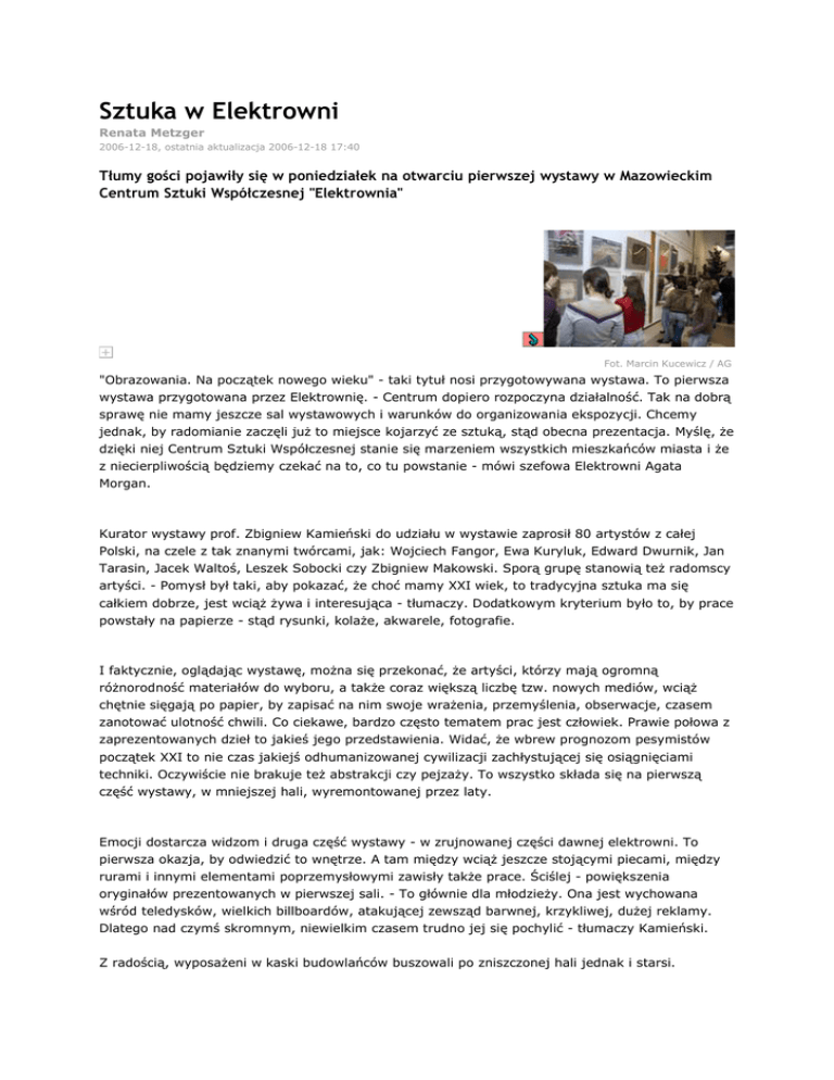 Sztuka w Elektrowni Renata Metzger 2006-12-18, ostatnia aktualizacja 2006-12-18 17:40 Tłumy gości pojawiły się w poniedziałek na otwarciu pierwszej wystawy w Mazowieckim Centrum Sztuki Współczesnej "Elektrownia" Fot. Marcin Kucewicz / AG "Obrazowania. Na początek nowego wieku" - taki tytuł nosi przygotowywana wystawa. To pierwsza wystawa przygotowana przez Elektrownię. - Centrum dopiero rozpoczyna działalność. Tak na dobrą sprawę nie mamy jeszcze sal wystawowych i warunków do organizowania ekspozycji. Chcemy jednak, by radomianie zaczęli już to miejsce kojarzyć ze sztuką, stąd obecna prezentacja. Myślę, że dzięki niej Centrum Sztuki Współczesnej stanie się marzeniem wszystkich mieszkańców miasta i że z niecierpliwością będziemy czekać na to, co tu powstanie - mówi szefowa Elektrowni Agata Morgan. Kurator wystawy prof. Zbigniew Kamieński do udziału w wystawie zaprosił 80 artystów z całej Polski, na czele z tak znanymi twórcami, jak: Wojciech Fangor, Ewa Kuryluk, Edward Dwurnik, Jan Tarasin, Jacek Waltoś, Leszek Sobocki czy Zbigniew Makowski. Sporą grupę stanowią też radomscy artyści. - Pomysł był taki, aby pokazać, że choć mamy XXI wiek, to tradycyjna sztuka ma się całkiem dobrze, jest wciąż żywa i interesująca - tłumaczy. Dodatkowym kryterium było to, by prace powstały na papierze - stąd rysunki, kolaże, akwarele, fotografie. I faktycznie, oglądając wystawę, można się przekonać, że artyści, którzy mają ogromną różnorodność materiałów do wyboru, a także coraz większą liczbę tzw. nowych mediów, wciąż chętnie sięgają po papier, by zapisać na nim swoje wrażenia, przemyślenia, obserwacje, czasem zanotować ulotność chwili. Co ciekawe, bardzo często tematem prac jest człowiek. Prawie połowa z zaprezentowanych dzieł to jakieś jego przedstawienia. Widać, że wbrew prognozom pesymistów początek XXI to nie czas jakiejś odhumanizowanej cywilizacji zachłystującej się osiągnięciami techniki. Oczywiście nie brakuje też abstrakcji czy pejzaży. To wszystko składa się na pierwszą część wystawy, w mniejszej hali, wyremontowanej przez laty. Emocji dostarcza widzom i druga część wystawy - w zrujnowanej części dawnej elektrowni. To pierwsza okazja, by odwiedzić to wnętrze. A tam między wciąż jeszcze stojącymi piecami, między rurami i innymi elementami poprzemysłowymi zawisły także prace. Ściślej - powiększenia oryginałów prezentowanych w pierwszej sali. - To głównie dla młodzieży. Ona jest wychowana wśród teledysków, wielkich billboardów, atakującej zewsząd barwnej, krzykliwej, dużej reklamy. Dlatego nad czymś skromnym, niewielkim czasem trudno jej się pochylić - tłumaczy Kamieński. Z radością, wyposażeni w kaski budowlańców buszowali po zniszczonej hali jednak i starsi. Wystawę można oglądać tylko od poniedziałku do piątku w godzinach 10-13, bo w zrujnowanej hali nie ma oświetlenie elektrycznego. Jeśli ktoś chciałby odwiedzić Centrum także w weekend musi wcześniej zadzwonić tel. 048 3836077.