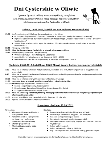Dni Cysterskie w Oliwie Ojcowie Cystersi z Oliwy wraz ze wspólnotą parafialną MB Królowej Korony Polskiej mają zaszczyt zaprosić wszystkich zainteresowanych na Dni Cysterskie w Oliwie Sobota, 22.09.2012, kościół pw. MB Królowej Korony Polskiej 15:00 Konferencja nt. sztuki i kultury duchowej zakonu cysterskiego O. dr Ignacy Rogusz O.CIST, Opactwo Cystersów w Szczyrzycu: „Cechy duchowości cysterskiej” mgr Alina Szpakiewicz, dyrektor Muzeum Archidiecezjalnego: „Klasztor Pocysterski w Oliwie – przeszłość i teraźniejszość” Joanna Tlaga, studentka III r. wydz. Architektury PG: „Wpływ zakonów na rozwój miast w okresie średniowiecza” 17:30 Nieszpory cysterskie 18:00 Msza św. konwentualna (po łacinie) w intencji zakonu cysterskiego 19:15 Wieczór poezji cysterskiej i muzyki dawnej Wykonanie muzyki – kwartet Capella Gedanensis Jerzy Kiszkis recytuje utwory o. Ivo Rowedera (1699 - 1765) Halina Winiarska-Kiszkis recytuje utwory o. Benedykta Zimy (1940 - 2010) Niedziela, 23.09.2012, kościół pw. MB Królowej Korony Polskiej oraz plac przy kościele 7:00 Msza św. w intencji członków Rady Parafialnej, ich rodzin oraz tych, którzy włączyli się w przygotowanie uroczystości 8:30 Msza św. w intencji Fundatorów i Dobrodziejów klasztoru oliwskiego oraz członków byłej wspólnoty kościoła ewangelickiego w Oliwie 10:00 Msza św. w intencji zmarłych braci i ojców klasztoru oliwskiego 11:30 Uroczysta Suma w intencji wspólnoty parafialnej i mieszkańców Oliwy 13:00 – 18:00 Występy zespołów na scenie na placu Kapela i zespół regionalny „Szczyrzycanie” Zespół muzyki dawnej pod kierunkiem Joanny Łosowskiej-Stojek Ks. Zygmunt i Przyjaciele – zespół Duval 18:00 Msza św. w intencji Pary Prezydenckiej, naszego parafianina marszałka Macieja Płażyńskiego i pozostałych ofiar tragedii smoleńskiej 19:00 Koncert muzyki patriotyczno-religijnej – ks. Zygmunt i Przyjaciele 20:00 Apel na zakończenie Dni Cysterskich w Oliwie Ponadto w niedzielę, 23.09.2012: W kościele: Wystawa „Historyczne klasztory w krajobrazie Polski” Pokaz filmu i zdjęć z pielgrzymki do Szczyrzyca i pielgrzymki rowerowej do Częstochowy Chorały gregoriańskie Możliwość spowiedzi w godz. 14:00 – 16:00 Na placu: Prezentacja Opactw Cysterskich z terenu Polski Prezentacja zakonów SS. Brygidek i SS. Pallotynek Konkurs na najsmaczniejsze ciasto Degustacja i sprzedaż produktów cysterskich Mała gastronomia – grill, ryby, napoje, soki i owoce z Beskidu Wyspowego Pokaz walk rycerskich Pokaz umiejętności piłkarzy KS Olivia Gry i zabawy dla dzieci, malowanie twarzy, jazda na kucyku Dochód z imprezy przeznaczony jest dla Caritas Parafialnego na działalność charytatywną