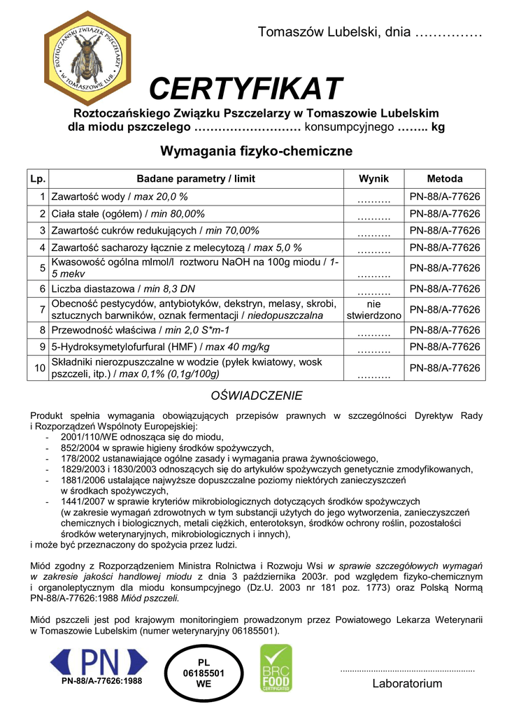 Tomaszów Lubelski, dnia …………… CERTYFIKAT Roztoczańskiego Związku Pszczelarzy w Tomaszowie Lubelskim dla miodu pszczelego ……………………… konsumpcyjnego …….. kg Wymagania fizyko-chemiczne Lp. Badane parametry / limit Wynik Metoda 1 Zawartość wody / max 20,0 % ………. PN-88/A-77626 2 Ciała stałe (ogółem) / min 80,00% ………. PN-88/A-77626 3 Zawartość cukrów redukujących / min 70,00% ………. PN-88/A-77626 4 Zawartość sacharozy łącznie z melecytozą / max 5,0 % PN-88/A-77626 ………. Kwasowość ogólna mlmol/l roztworu NaOH na 100g miodu / 15 PN-88/A-77626 5 mekv ………. 6 Liczba diastazowa / min 8,3 DN PN-88/A-77626 ………. Obecność pestycydów, antybiotyków, dekstryn, melasy, skrobi, nie 7 PN-88/A-77626 sztucznych barwników, oznak fermentacji / niedopuszczalna stwierdzono 8 Przewodność właściwa / min 2,0 S*m-1 PN-88/A-77626 ………. 9 5-Hydroksymetylofurfural (HMF) / max 40 mg/kg PN-88/A-77626 ………. Składniki nierozpuszczalne w wodzie (pyłek kwiatowy, wosk 10 PN-88/A-77626 pszczeli, itp.) / max 0,1% (0,1g/100g) ………. OŚWIADCZENIE Produkt spełnia wymagania obowiązujących przepisów prawnych w szczególności Dyrektyw Rady i Rozporządzeń Wspólnoty Europejskiej: - 2001/110/WE odnosząca się do miodu, - 852/2004 w sprawie higieny środków spożywczych, - 178/2002 ustanawiające ogólne zasady i wymagania prawa żywnościowego, - 1829/2003 i 1830/2003 odnoszących się do artykułów spożywczych genetycznie zmodyfikowanych, - 1881/2006 ustalające najwyższe dopuszczalne poziomy niektórych zanieczyszczeń w środkach spożywczych, - 1441/2007 w sprawie kryteriów mikrobiologicznych dotyczących środków spożywczych (w zakresie wymagań zdrowotnych w tym substancji użytych do jego wytworzenia, zanieczyszczeń chemicznych i biologicznych, metali ciężkich, enterotoksyn, środków ochrony roślin, pozostałości środków weterynaryjnych, mikrobiologicznych i innych), i może być przeznaczony do spożycia przez ludzi. Miód zgodny z Rozporządzeniem Ministra Rolnictwa i Rozwoju Wsi w sprawie szczegółowych wymagań w zakresie jakości handlowej miodu z dnia 3 października 2003r. pod względem fizyko-chemicznym i organoleptycznym dla miodu konsumpcyjnego (Dz.U. 2003 nr 181 poz. 1773) oraz Polską Normą PN-88/A-77626:1988 Miód pszczeli. Miód pszczeli jest pod krajowym monitoringiem prowadzonym przez Powiatowego Lekarza Weterynarii w Tomaszowie Lubelskim (numer weterynaryjny 06185501). PN-88/A-77626:1988 PL 06185501 WE ......................................................... Laboratorium