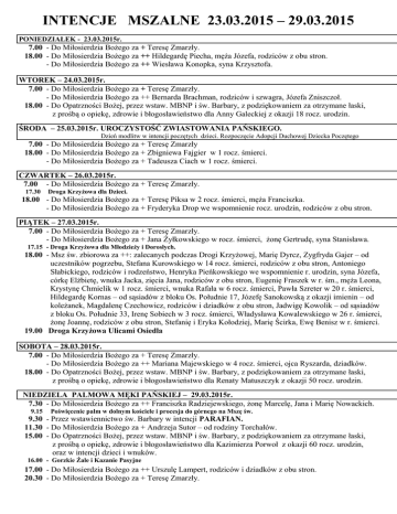 INTENCJE MSZALNE 23.03.2015 – 29.03.2015 PONIEDZIAŁEK - 23.03.2015r. 7.00 - Do Miłosierdzia Bożego za + Teresę Zmarzły. 18.00 - Do Miłosierdzia Bożego za ++ Hildegardę Piecha, męża Józefa, rodziców z obu stron. - Do Miłosierdzia Bożego za ++ Wiesława Konopka, syna Krzysztofa. WTOREK – 24.03.2015r. 7.00 - Do Miłosierdzia Bożego za + Teresę Zmarzły. - Do Miłosierdzia Bożego za ++ Bernarda Brachman, rodziców i szwagra, Józefa Zniszczoł. 18.00 - Do Opatrzności Bożej, przez wstaw. MBNP i św. Barbary, z podziękowaniem za otrzymane łaski, z prośbą o opiekę, zdrowie i błogosławieństwo dla Anny Galeckiej z okazji 18 rocz. urodzin. ŚRODA – 25.03.2015r. UROCZYSTOŚĆ ZWIASTOWANIA PAŃSKIEGO. Dzień modlitw w intencji poczętych dzieci. Rozpoczęcie Adopcji Duchowej Dziecka Poczętego 7.00 - Do Miłosierdzia Bożego za + Teresę Zmarzły 18.00 - Do Miłosierdzia Bożego za + Zbigniewa Fajgier w 1 rocz. śmierci. - Do Miłosierdzia Bożego za + Tadeusza Ciach w 1 rocz. śmierci. CZWARTEK – 26.03.2015r. 7.00 - Do Miłosierdzia Bożego za + Teresę Zmarzły. 17.30 Droga Krzyżowa dla Dzieci. 18.00 - Do Miłosierdzia Bożego za + Teresę Piksa w 2 rocz. śmierci, męża Franciszka. - Do Miłosierdzia Bożego za + Fryderyka Drop we wspomnienie rocz. urodzin, rodziców z obu stron. PIĄTEK – 27.03.2015r. 7.00 - Do Miłosierdzia Bożego za + Teresę Zmarzły. - Do Miłosierdzia Bożego za + Jana Żyłkowskiego w rocz. śmierci, żonę Gertrudę, syna Stanisława. 17.15 - Droga Krzyżowa dla Młodzieży i Dorosłych. 18.00 - Msz św. zbiorowa za ++: zalecanych podczas Drogi Krzyżowej, Marię Dyrcz, Zygfryda Gajer – od uczestników pogrzebu, Stefana Kurowskiego w 14 rocz. śmierci, rodziców z obu stron, Antoniego Słabickiego, rodziców i rodzeństwo, Henryka Pieńkowskiego we wspomnienie r. urodzin, syna Józefa, córkę Elżbietę, wnuka Jacka, zięcia Jana, rodziców z obu stron, Eugenię Fraszek w r. śm., męża Leona, Krystynę Chmielik w 1 rocz. śmierci, wnuka Rafała w 6 rocz. śmierci, Pawła Szreter w 20 r. śmierci, Hildegardę Kornas – od sąsiadów z bloku Os. Południe 17, Józefę Sanokowską z okazji imienin – od koleżanek, Magdalenę Czechowicz, rodziców i dziadków z obu stron, Jadwigę Kowolik – od sąsiadów z bloku Os. Południe 33, Irenę Sobiech w 3 rocz. śmierci, Władysława Kowalewskiego w 26 r. śmierci, żonę Joannę, rodziców z obu stron, Stefanię i Eryka Kołodziej, Marię Ścirka, Ewę Benisz w r. śmierci. 19.00 Droga Krzyżowa Ulicami Osiedla SOBOTA – 28.03.2015r. 7.00 - Do Miłosierdzia Bożego za + Teresę Zmarzły. - Do Miłosierdzia Bożego za ++ Mariana Majewskiego w 4 rocz. śmierci, ojca Ryszarda, dziadków. 18.00 - Do Opatrzności Bożej, przez wstaw. MBNP i św. Barbary, z podziękowaniem za otrzymane łaski, z prośbą o opiekę, zdrowie i błogosławieństwo dla Renaty Matuszczyk z okazji 50 rocz. urodzin. NIEDZIELA PALMOWA MĘKI PAŃSKIEJ – 29.03.2015r. 7.30 - Do Miłosierdzia Bożego za ++ Franciszka Radziejewskiego, żonę Marcelę, Jana i Marię Nowackich. 9.15 Poświęcenie palm w dolnym kościele i procesja do górnego na Mszę św. 9.30 - Przez wstawiennictwo św. Barbary w intencji PARAFIAN. 11.30 - Do Miłosierdzia Bożego za + Andrzeja Sutor – od rodziny Torchałów. 15.00 - Do Opatrzności Bożej, przez wstaw. MBNP i św. Barbary, z podziękowaniem za otrzymane łaski, z prośbą o opiekę, zdrowie i błogosławieństwo dla Kazimierza Porwoł z okazji 60 rocz. urodzin, oraz w intencji dzieci i wnuków. 16.00 - Gorzkie Żale i Kazanie Pasyjne 17.00 - Do Miłosierdzia Bożego za ++ Urszulę Lampert, rodziców i dziadków z obu stron. 20.30 - Do Miłosierdzia Bożego za + Teresę Zmarzły.