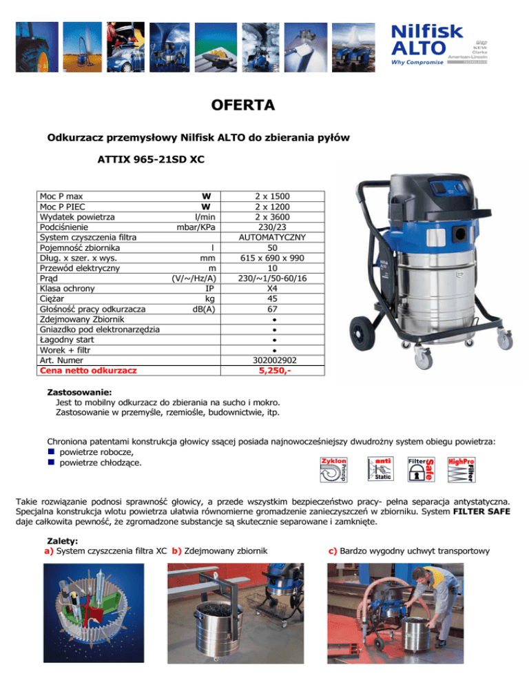 OFERTA Odkurzacz przemys owy Nilfisk ALTO do zbierania py ów ATTIX 965-21SD XC Moc P max Moc P PIEC Wydatek powietrza Podci nienie System czyszczenia filtra Pojemno zbiornika ug. x szer. x wys. Przewód elektryczny Pr d Klasa ochrony Ci ar no pracy odkurzacza Zdejmowany Zbiornik Gniazdko pod elektronarz dzia agodny start Worek + filtr Art. Numer Cena netto odkurzacz W W l/min mbar/KPa l mm m (V/~/Hz/A) IP kg dB(A) 2 x 1500 2 x 1200 2 x 3600 230/23 AUTOMATYCZNY 50 615 x 690 x 990 10 230/~1/50-60/16 X4 45 67 • • • • 302002902 5,250,- Zastosowanie: Jest to mobilny odkurzacz do zbierania na sucho i mokro. Zastosowanie w przemy le, rzemio le, budownictwie, itp. Chroniona patentami konstrukcja g owicy ss cej posiada najnowocze niejszy dwudro ny system obiegu powietrza: n powietrze robocze, n powietrze ch odz ce. Takie rozwi zanie podnosi sprawno g owicy, a przede wszystkim bezpiecze stwo pracy- pe na separacja antystatyczna. Specjalna konstrukcja wlotu powietrza u atwia równomierne gromadzenie zanieczyszcze w zbiorniku. System FILTER SAFE daje ca kowita pewno , e zgromadzone substancje s skutecznie separowane i zamkni te. Zalety: a) System czyszczenia filtra XC b) Zdejmowany zbiornik c) Bardzo wygodny uchwyt transportowy 1 2 3 4 5 rura ss ca alu anodowane 1100mm ssawa przemys owa Alu. z w osiem 500mm ss cy z mufami 4m ssawa z w osiem Alu. 200mm ssawa szczelinowa Zalecany zestaw przemys owy Ø 50 nr katalogowy 63216 Cena netto 1,200,- XtremeClean system czyszczenia filtra opatentowany przez WAP-ALTO Filtr jest czyszczony odpowiednio ukierunkowanym strumieniem powietrza bez potrzeby przerw w pracy. Zmiana kierunku zassanego powietrza wewn trz filtra powoduje wypadni cie cz stek ze szczelin filtra, cz stki te wpadaj do zbiornika. Si a ss ca odkurzacza jest zawsze optymalna 02-830 Warszawa, ul. Mazura 18 Tel. +48 22 397 78 30 fax. +48 22 397 78 29 SPRZEDA +48 668 80 80 00 SERWIS +48 668 66 16 88 www.nilfisk-alto.info.pl